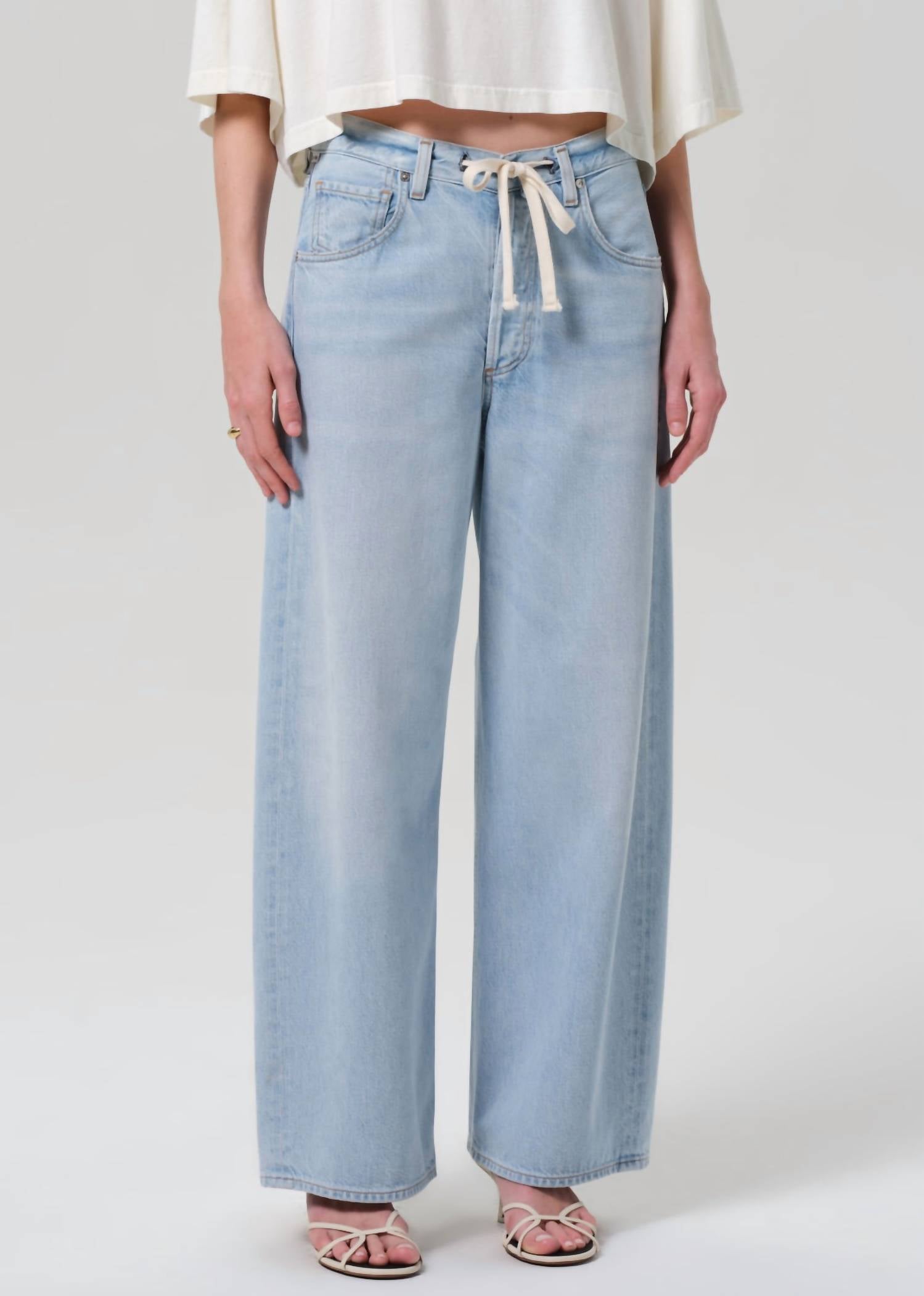Experience effortless style with the Brynn Drawstring Trouser Pants by Citizens of Humanity, perfect for sun-soaked days and casual outings. Crafted with a 65% Lyocell, 35% cotton blend, these trousers offer a soft hand feel, featuring a comfortable and relaxed fit. The Portola-colored pants have a mid-rise with a 12 1/2" rise, a leg opening of 21 3/4", and a 30 1/2" inseam. Closure is via a button fly, and care includes machine washing cold inside out and low tumble drying. Made in USA with imported materials, these trousers promise style and comfort with their wide-leg and solid pattern design.