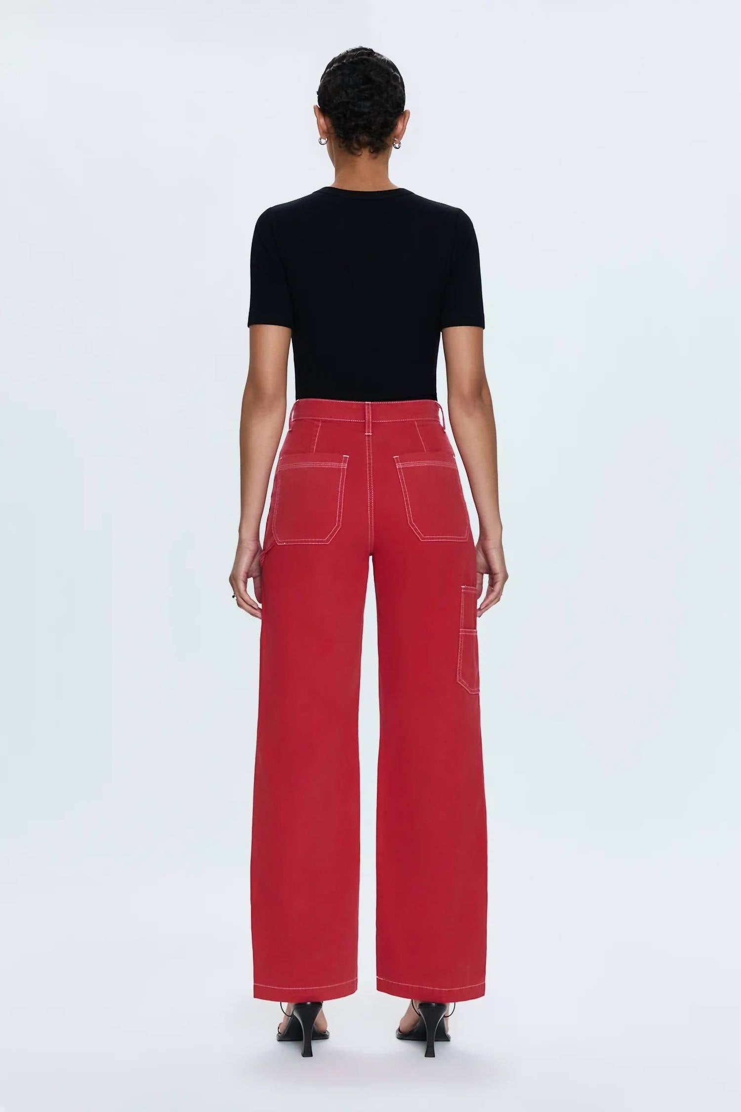A perfectly tailored straight leg that you'll want in every color! Introducing the Grady Carpenter Pant by PISTOLA, crafted from 100% cotton for comfort and durability. These women's high-rise utility trousers feature a straight leg silhouette with a full-length 32" inseam, complemented by a 19" leg opening and a 12" rise. Styled in a vibrant Rouge hue with contrast white stitching, these pants are detailed with an exposed front seam, hammer loop, and side utility pockets, complete with a button closure. Originating from imported quality, they are designed for easy maintenance with machine wash instructions. Model is 5'9" and wears size 26.