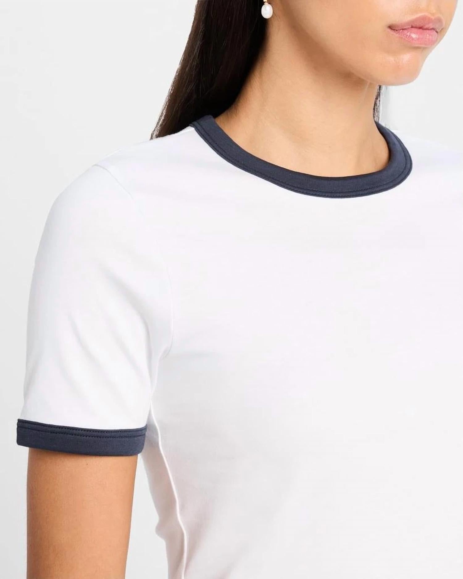 Look no further, you just found your perfect tee! Discover the Mia Ringer Tee by Rag & Bone, the quintessential piece for your spring wardrobe. This women's tee features short sleeves and is meticulously crafted from 100% soft, breathable cotton, with an easy fit and a hem that sits perfectly at the hip. Closure: Pull on. The solid, minimalist design in White Multi combines effortlessly with any ensemble, making it ideal for a dinner party or any occasion.