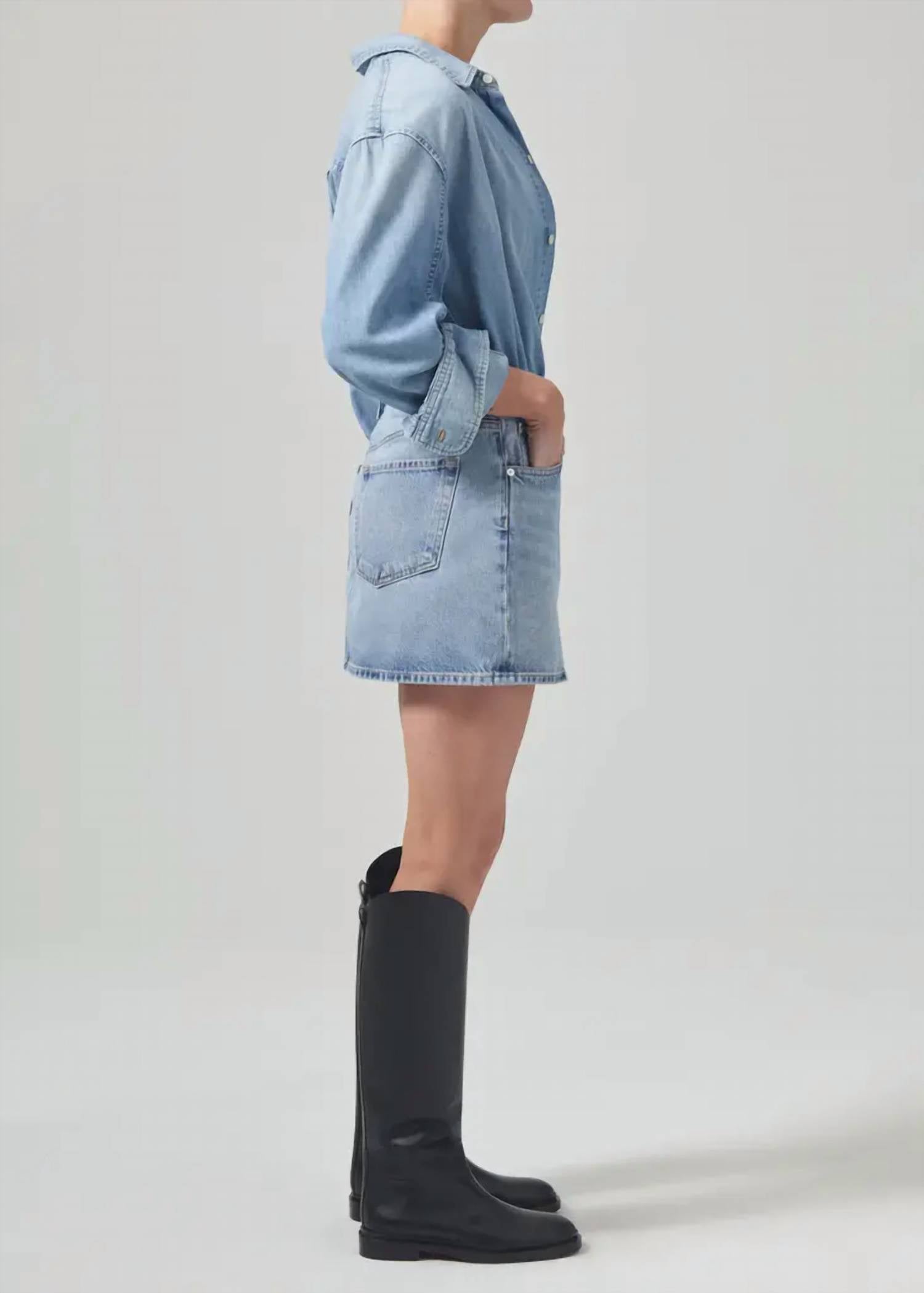 Show just the right amount of leg in this fit flattering mini. Discover the Ramona Mini Skirt by Citizens of Humanity, crafted from 100% regenerative cotton for a rigid, vintage feel. This women's skirt comes in a Fiesta light indigo wash, featuring whiskering and fading that add to its classic denim charm. Designed with a finished hem, button closure, and convenient pockets, this solid pattern mini skirt makes an excellent choice for a spring dinner party or a festive 4th of July celebration. Care for this piece is easy with machine wash instructions.