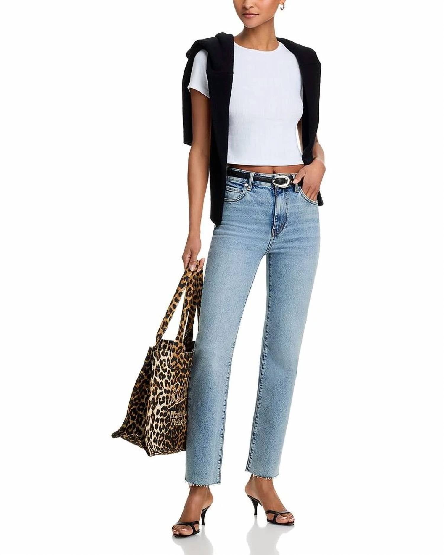 Tuck your favorite tee into these high-waist jeans for a more casual-cool feel. Introducing the Frame Ruler Crop High Rise Straight Jeans in a chic Indigo Vintage Fray shade, perfect for modern streetwear style. Crafted from a cotton blend composition of 99% cotton and 1% elastane, these jeans boast a relaxed fit with a high-rise waistline and straight leg style. Featuring a solid pattern and essential pockets, they are completed with a convenient button closure. For care, simply machine wash to keep them in pristine condition.