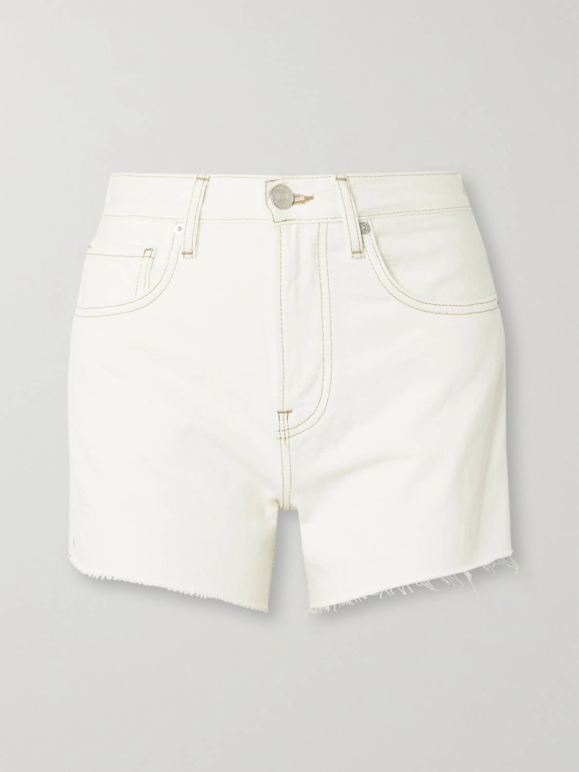 You can never have too many jean shorts and these will be your new favorites. Elevate your seasonal style with FRAME's Le Super High Short in a chic cream hue, perfect for concert outings. Crafted from 100% cotton denim, these jean shorts feature a high-rise design with a slim fit and raw hems for a vintage appeal. The shorts are equipped with a practical button and concealed zip closure, as well as functional pockets. Easy to care for, simply machine wash to maintain their pristine look.