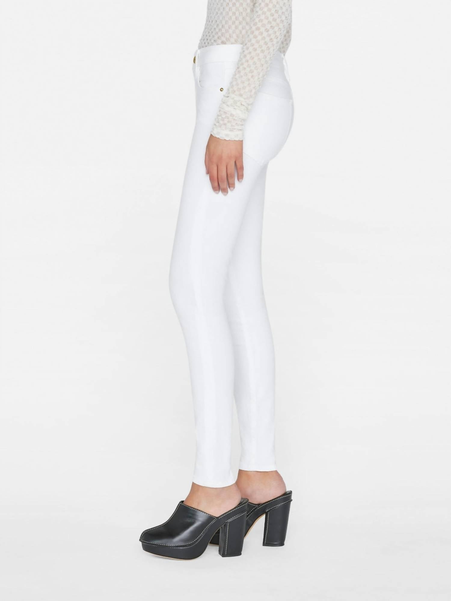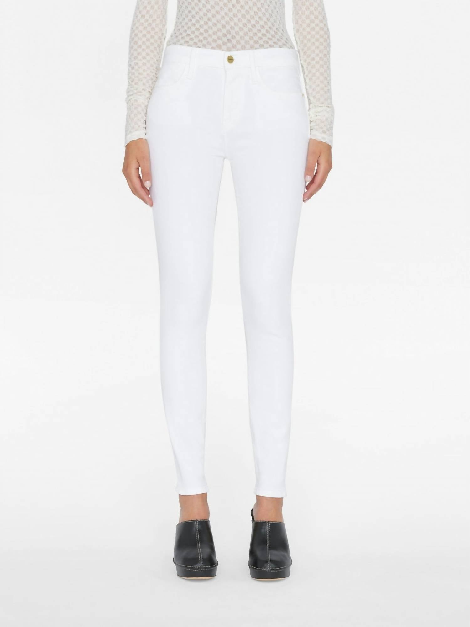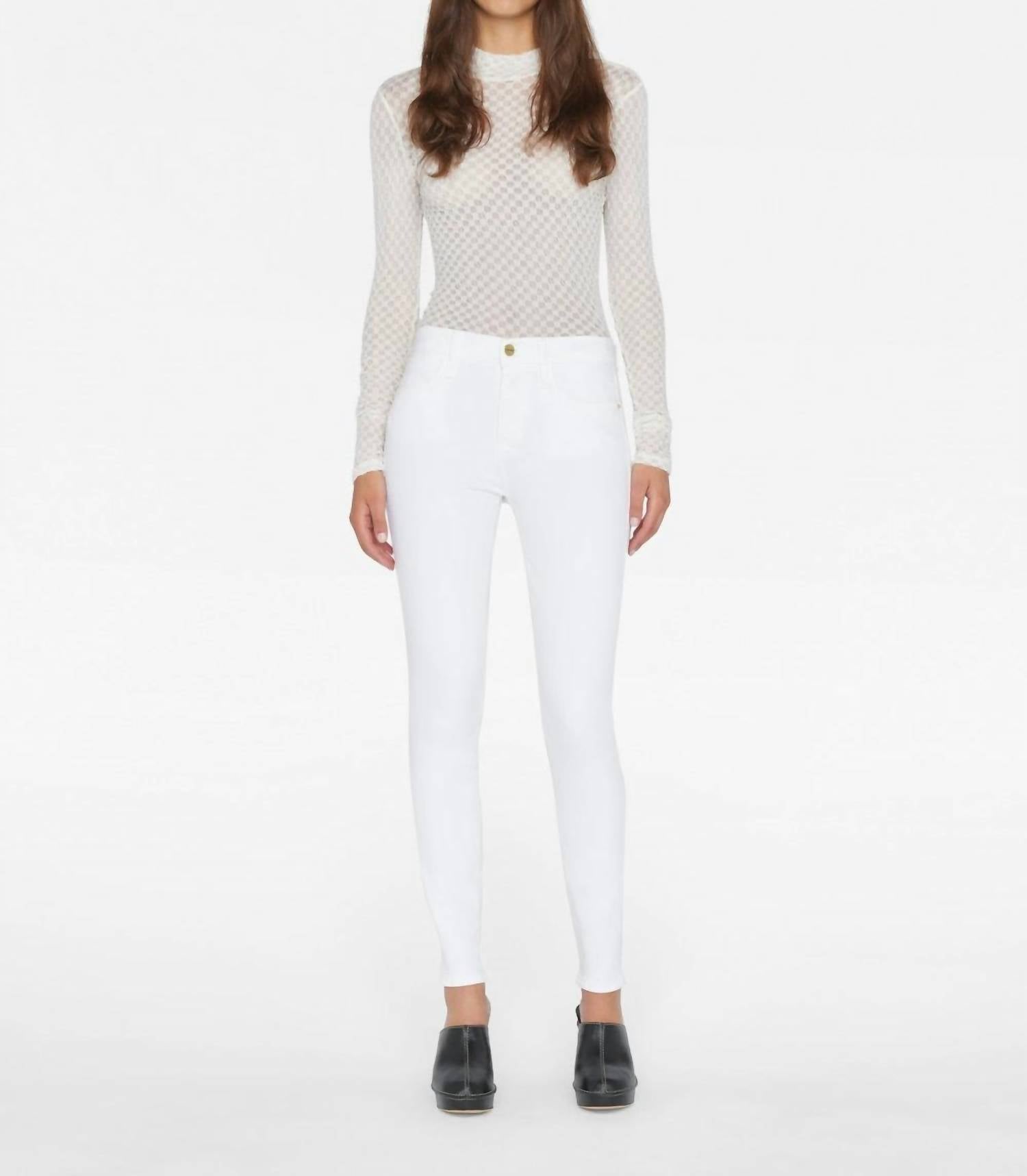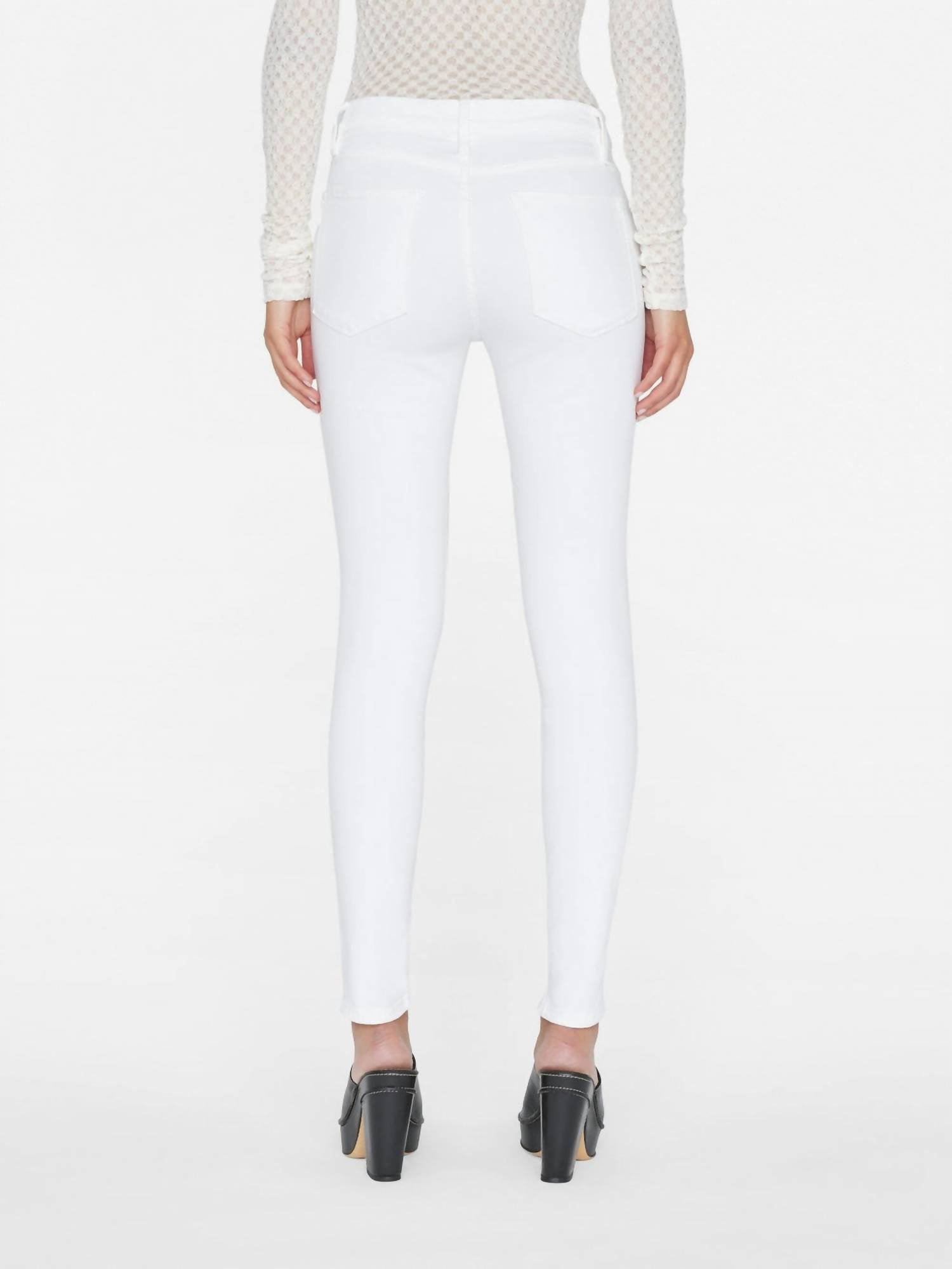 Everyone needs a good pair of skinny jeans and this is a style you'll keep reaching for no matter the season. The FRAME Le High Skinny Jeans offer a seamless blend of classic 70s high-rise style with modern skinny leg design, perfect for both workwear and concert occasions. Crafted from 100% premium cotton in a solid white hue, these jeans feature super stretch fabric for enhanced comfort and recovery. They are equipped with pockets and a zip closure for practicality. Care instructions recommend machine wash and tumble dry for easy maintenance, making these jeans a versatile addition to your spring wardrobe.