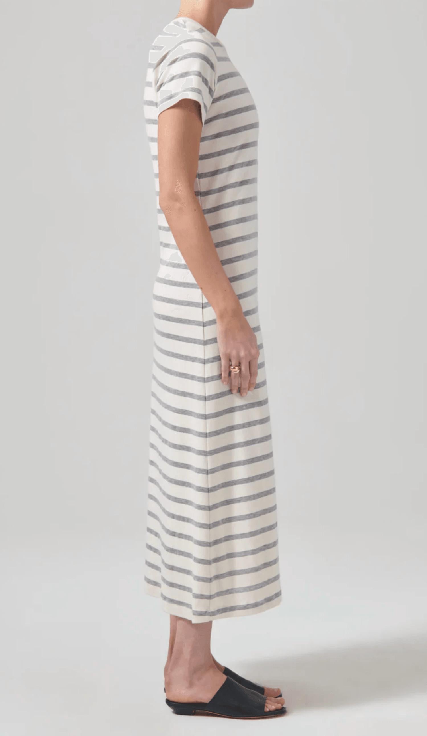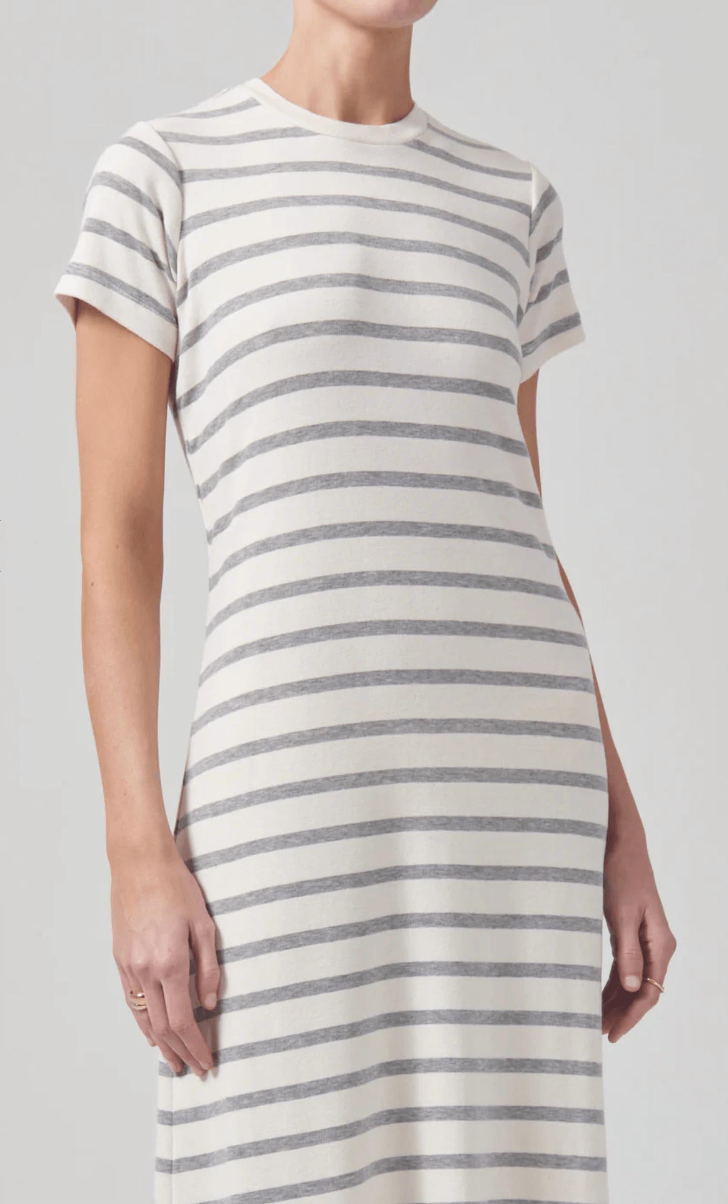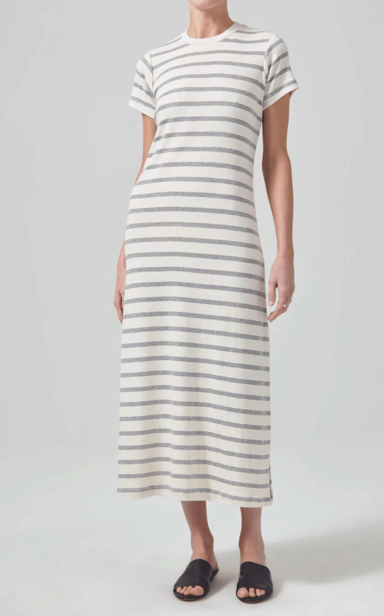 The perfect length dress does exist. Discover the Goldie Dress by Citizens of Humanity, a must-have for your wardrobe in Campanula Stripe. This short-sleeve midi dress is crafted from ultra-breathable stretch cotton, offering a comfortable drape on the body. Styled with a classic crewneck and pull-on closure, it is ideal for casual vacation days or a chic streetwear look. Care is effortless with simple machine wash instructions, making it the perfect mix of style and convenience.