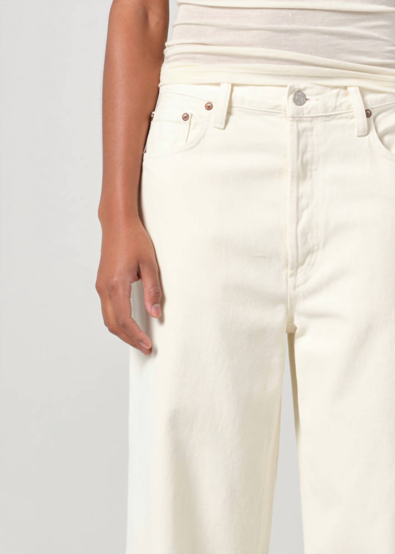 This classic straight leg jean has a perfect fit and goes with just about everything. Elevate your wardrobe with the AGOLDE Low Slung Baggy Jeans in color Solar, a chic blend of comfort and modern style. Crafted from 100% Organic Cotton, these jeans offer a relaxed fit with a high rise of 12.25 inches and a baggy straight leg, making for an effortlessly trendy appearance. Closure: Button Fly. Care: Machine wash cold inside out with like colors, do not bleach, tumble dry low. Model is 5'10" and is wearing a Size 27, featuring an inseam of 30.5 inches and a leg opening of 21 inches.