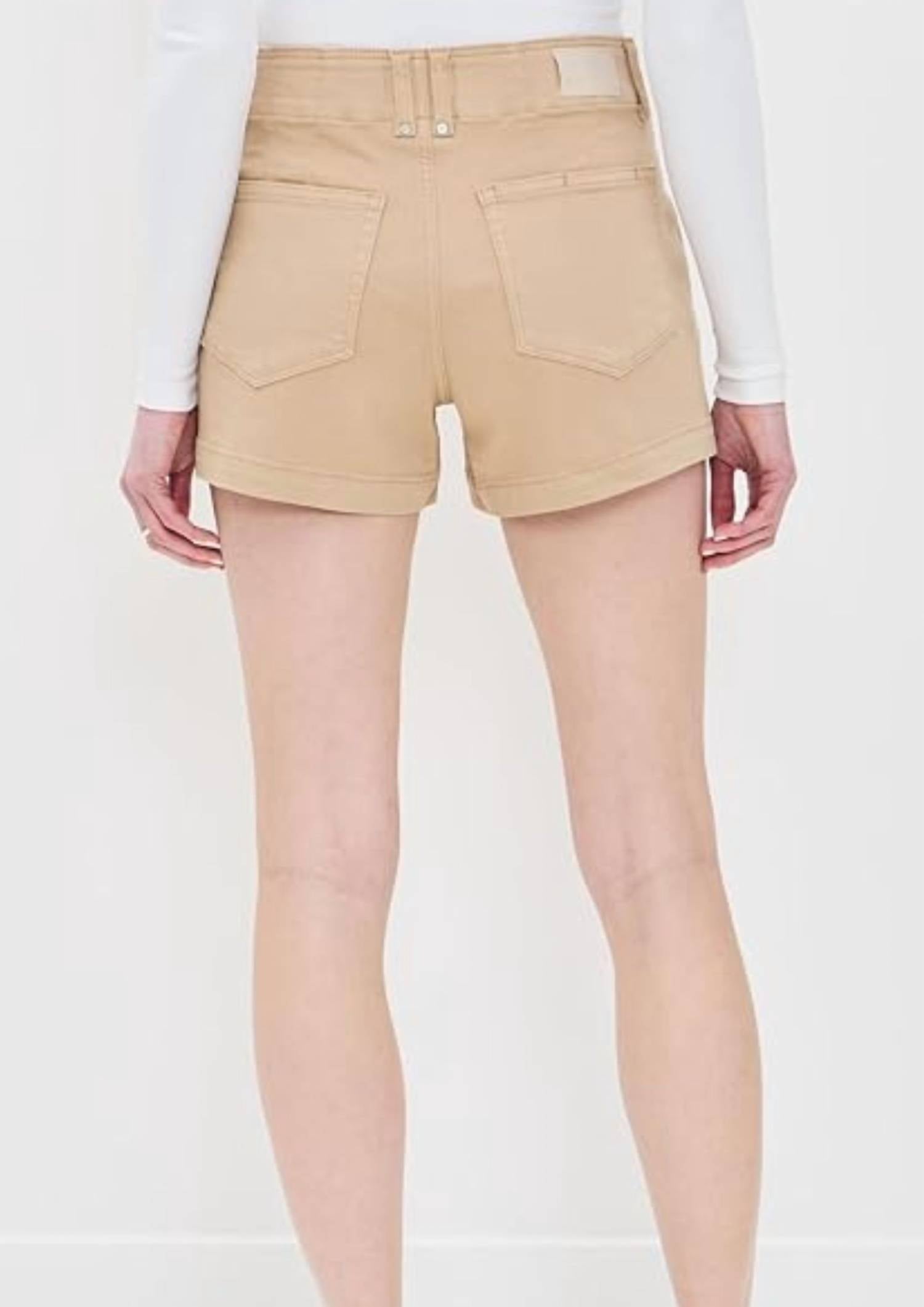 Fit to perfection, we love these high-waist shorts and you will too. The Olivia Cargo Short by Paige in Vintage Raffia Tan offers a perfect blend of style and comfort for any vacation look. These solid high-waist shorts are made from lightweight, super-stretch twill, composed of 57% cotton, 34% rayon, 6% elasterell-p, and 3% lycra spandex, ensuring flexibility and ease of movement. Designed with a convenient button closure and zip fly, they feature flap front pockets and patch back pockets for practicality. Originating from China, they're easy to maintain with machine wash and tumble dry instructions. Measurements from size 26 indicate a rise of 10.25 inches (26cm) and an inseam of 4 inches (10cm).