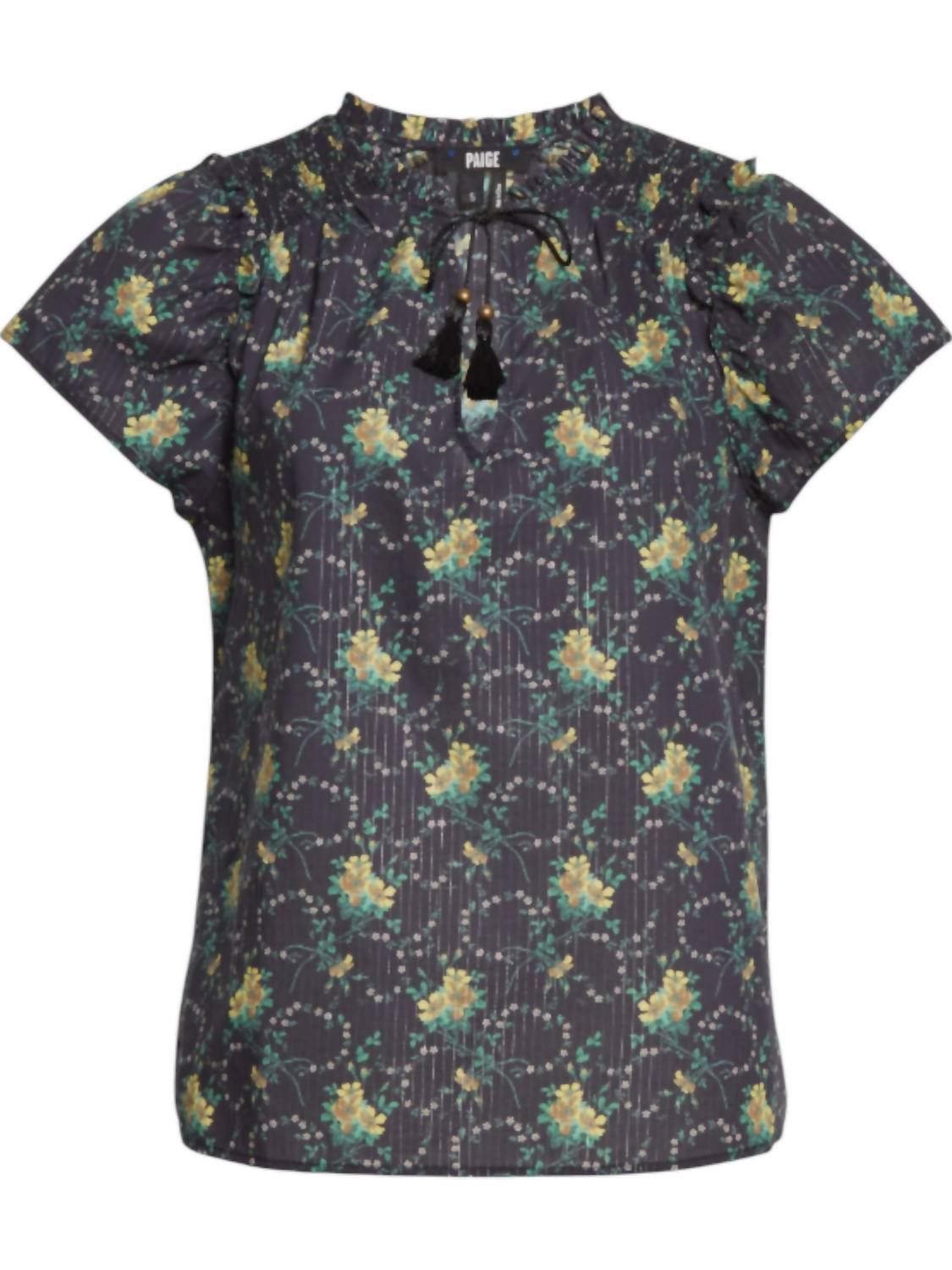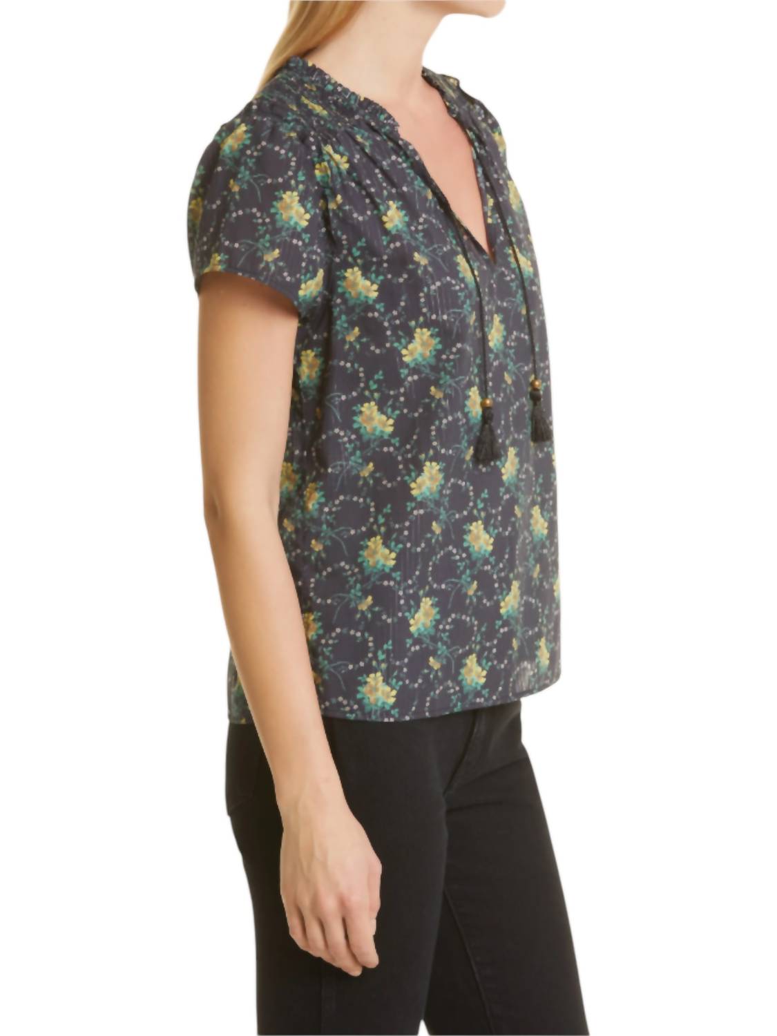 Charming floral-print design. Offers the ease of a pull-on closure and short sleeves. Promoting a casual yet polished look. Crafted from 95% cotton and 5% polyester. Features a split V-neck with tassel ties and smocked shoulders. For care, simply machine wash and line dry.