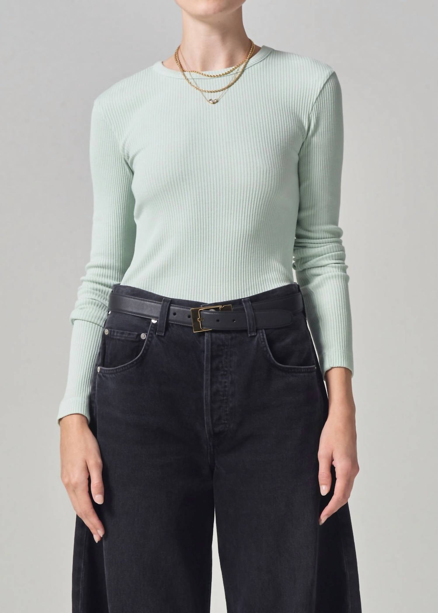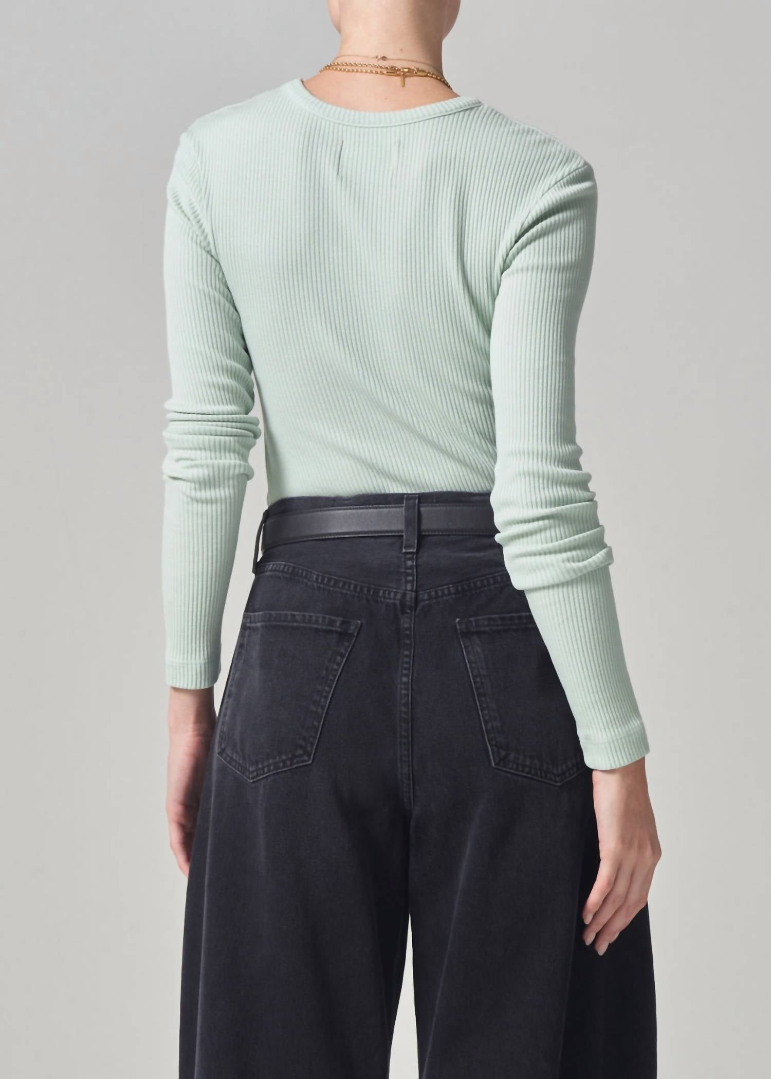Experience the perfect blend of comfort and style with this trendy crew neck sweater, designed to effortlessly elevate your wardrobe. Pair it with your favorite denim and loafers for the perfect look. Introducing the Bina Crewneck Top by Citizens of Humanity in a soft pistachio hue, perfect for a minimalist spring holiday look. Featuring long sleeves and crafted from a 67% Lyocell, 29% Organic Cotton, and 4% Spandex blend, it offers a lightweight and stretchy fit for all-day comfort. This solid crewneck top has a body length of 24.25" and a shoulder to shoulder measurement of 14". Closure: Pull on. Care: Machine wash cold. Model is 5'10" and wearing a size Small.