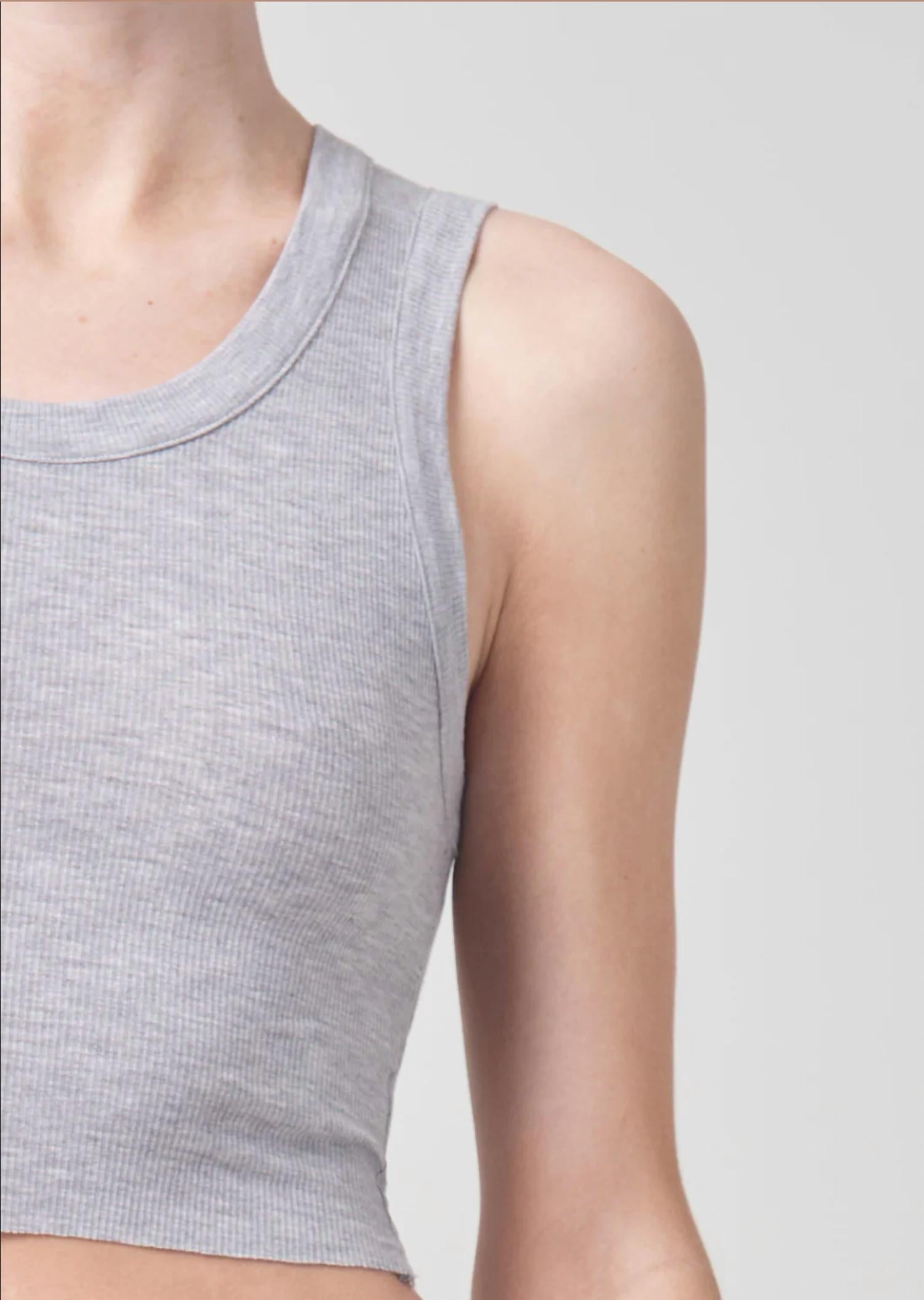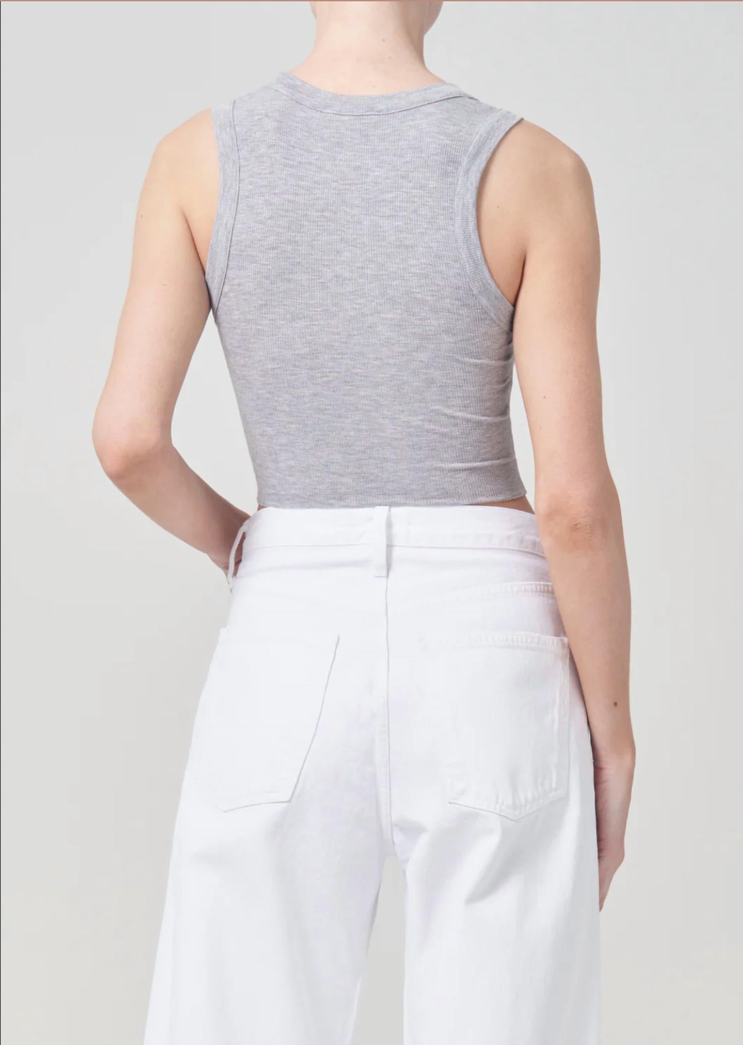 The perfect tank top for those warmer weather seasons. Discover effortless style with the Cropped Poppy Tank by AGOLDE, perfect for your spring wardrobe. Featuring a flattering U-shape neckline, this sleeveless top is crafted from a breathable blend of 49% Organic Cotton, 49% Tencel Lyocell, and 2% Spandex. Made in the US with a solid, heather grey pattern, this cropped tank is designed to fit close to the body for an athletic yet feminine look. Pull-on style. Machine wash for convenience.