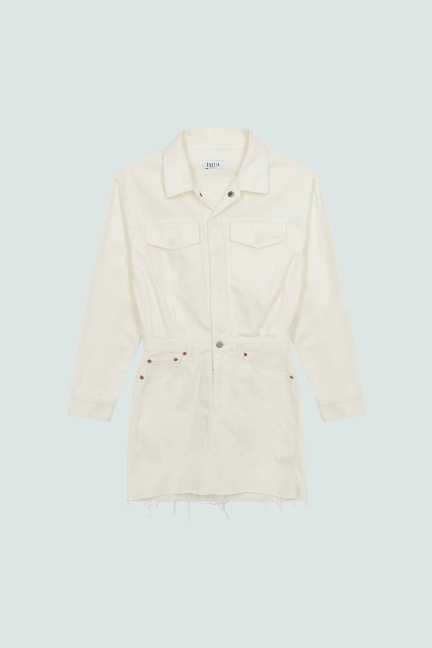 The perfect mini dress for those warmer months. The Nina Mini Dress by PISTOLA elevates your wardrobe with its effortlessly chic style. This shirt silhouette features long sleeves and is made from 100% cotton, ensuring comfort and breathability. Measuring 34 inches in length, it showcases an attractive eggshell color, accented by elegant front flap pockets and practical belt loops. Crafted with attention to detail, it includes a snap closure and a classic collar neckline, offering both style and functionality. Originating from imported materials, this dress is easy to maintain with machine wash care instructions.