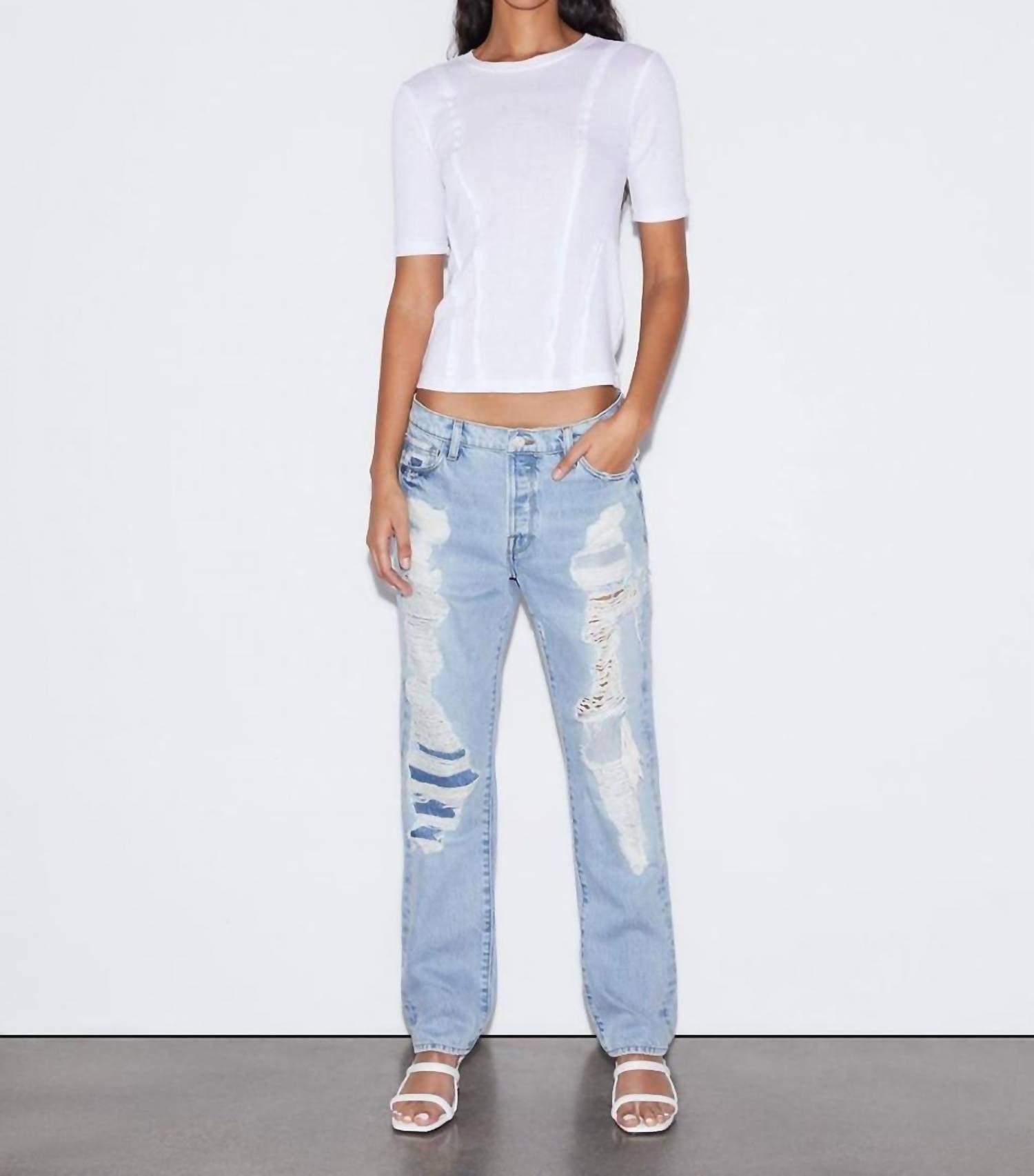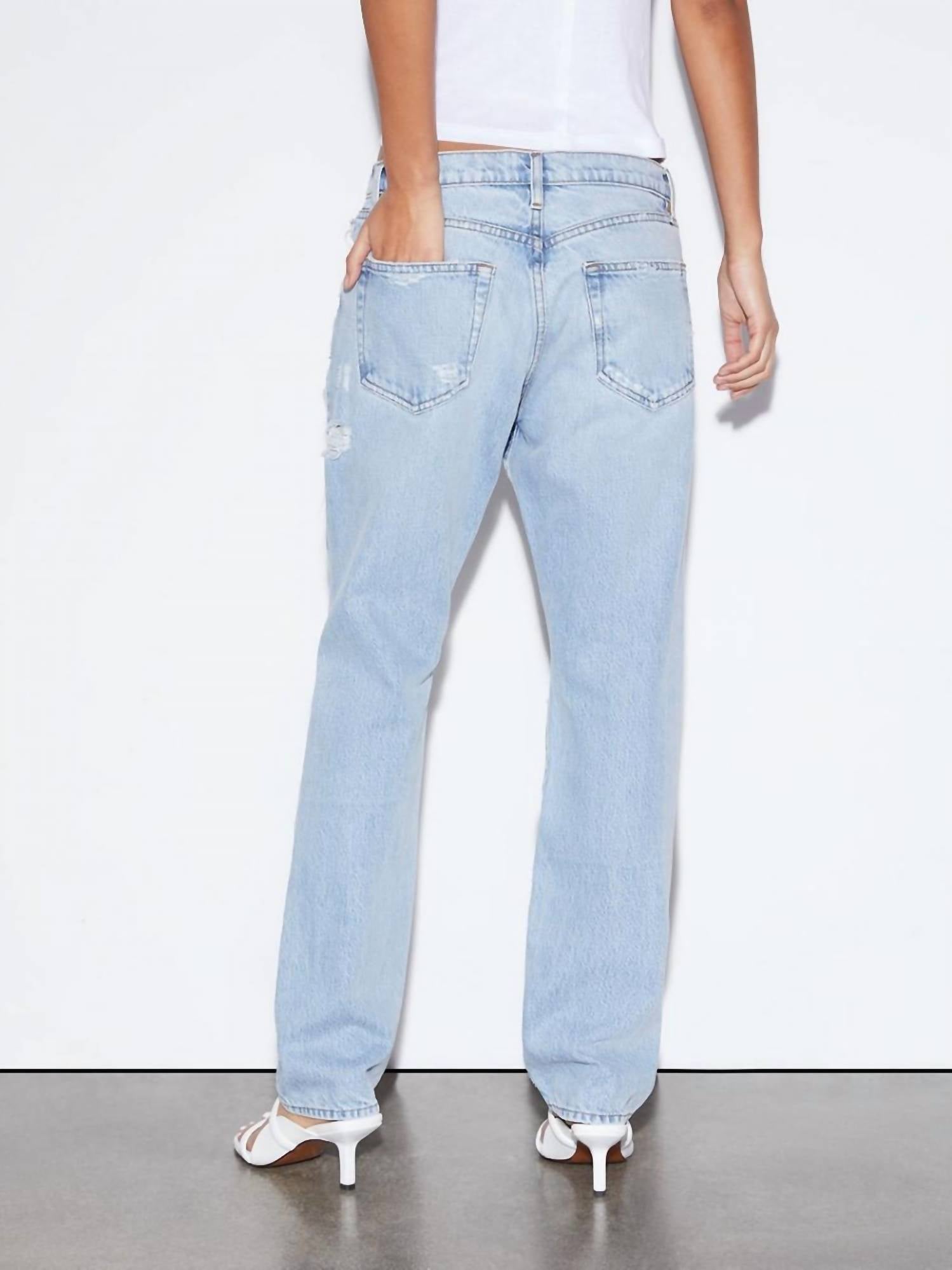Cut from rigid 100% cotton and features the perfect hip-slung slouch. In a light edgy wash, this pair features authentic distressing with self-repair patching.