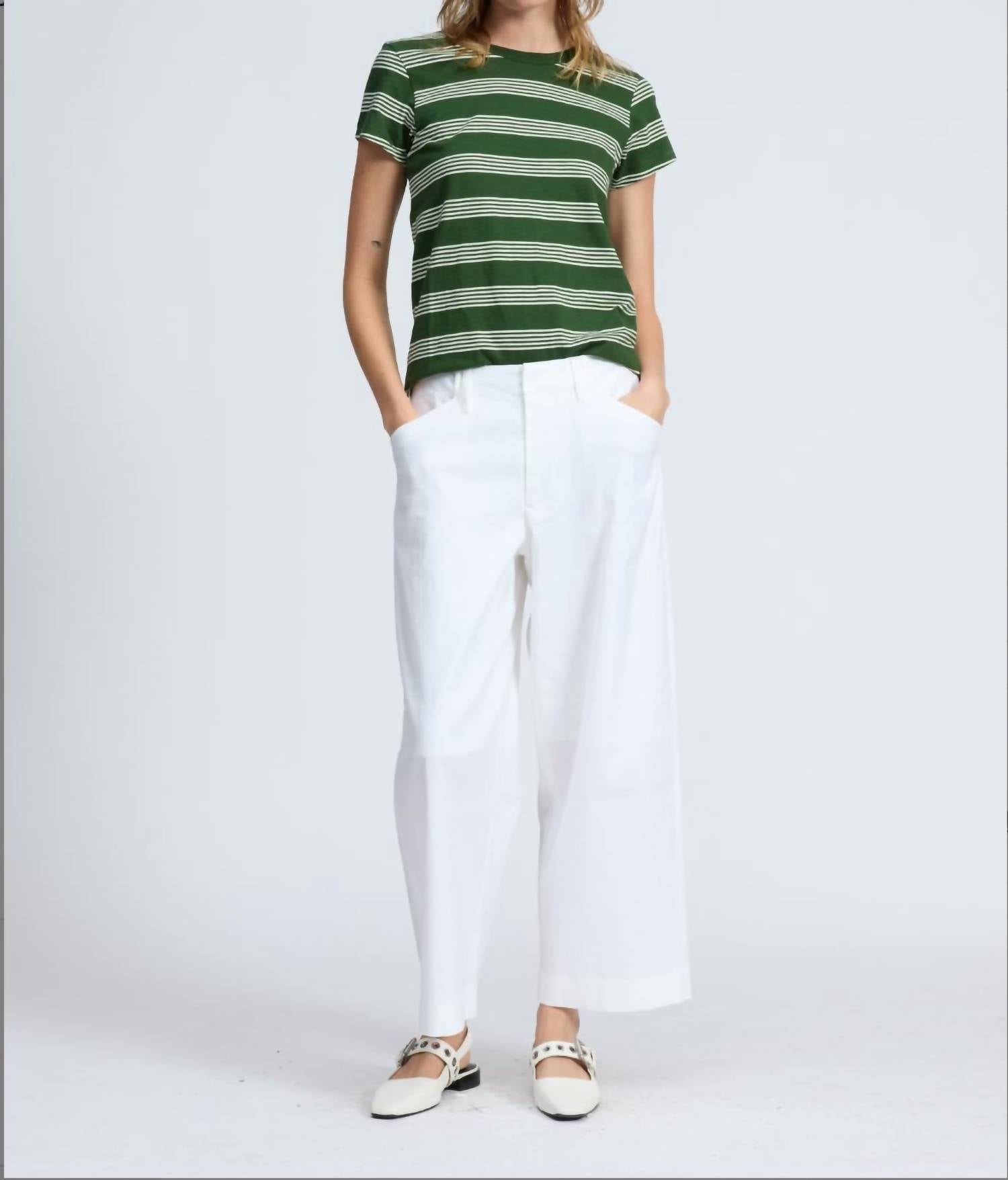 Look no further, you just found your perfect tee! Introducing the Slub Stripe Tee by Rag & Bone, a modern essential crafted for breathable comfort in 100% organic cotton. Featuring short sleeves and a banded crew neckline, this slim-fit tee sports an allover slub-knit texture for a sleek yet effortless feel. The center back seam detail adds a signature touch to this versatile piece in green multi-stripe, perfect for layering or wearing solo. Closure: Pull on. Approximate Measurements: 23.375" from back of neck to hem, 33.5" chest, 36" sweep.