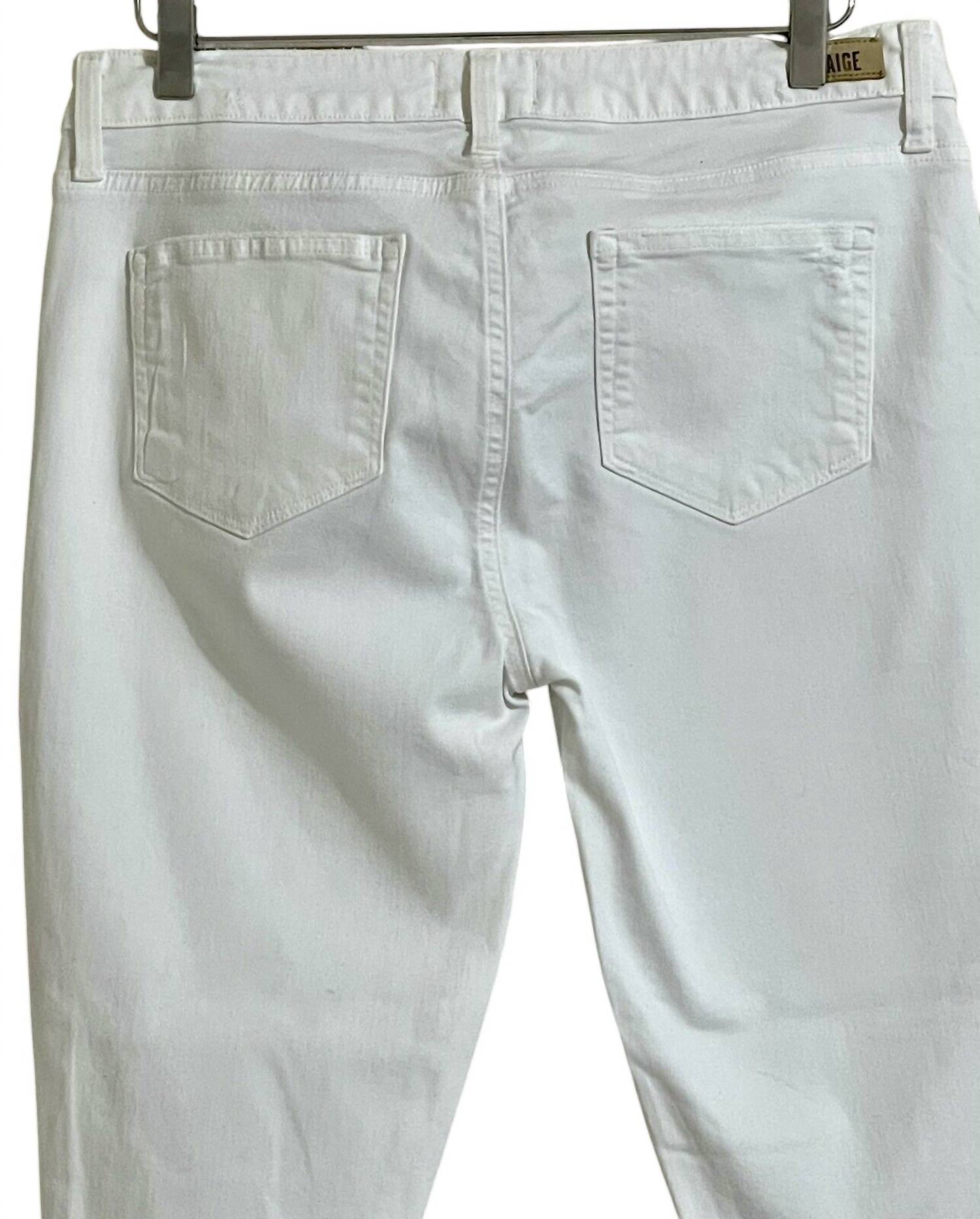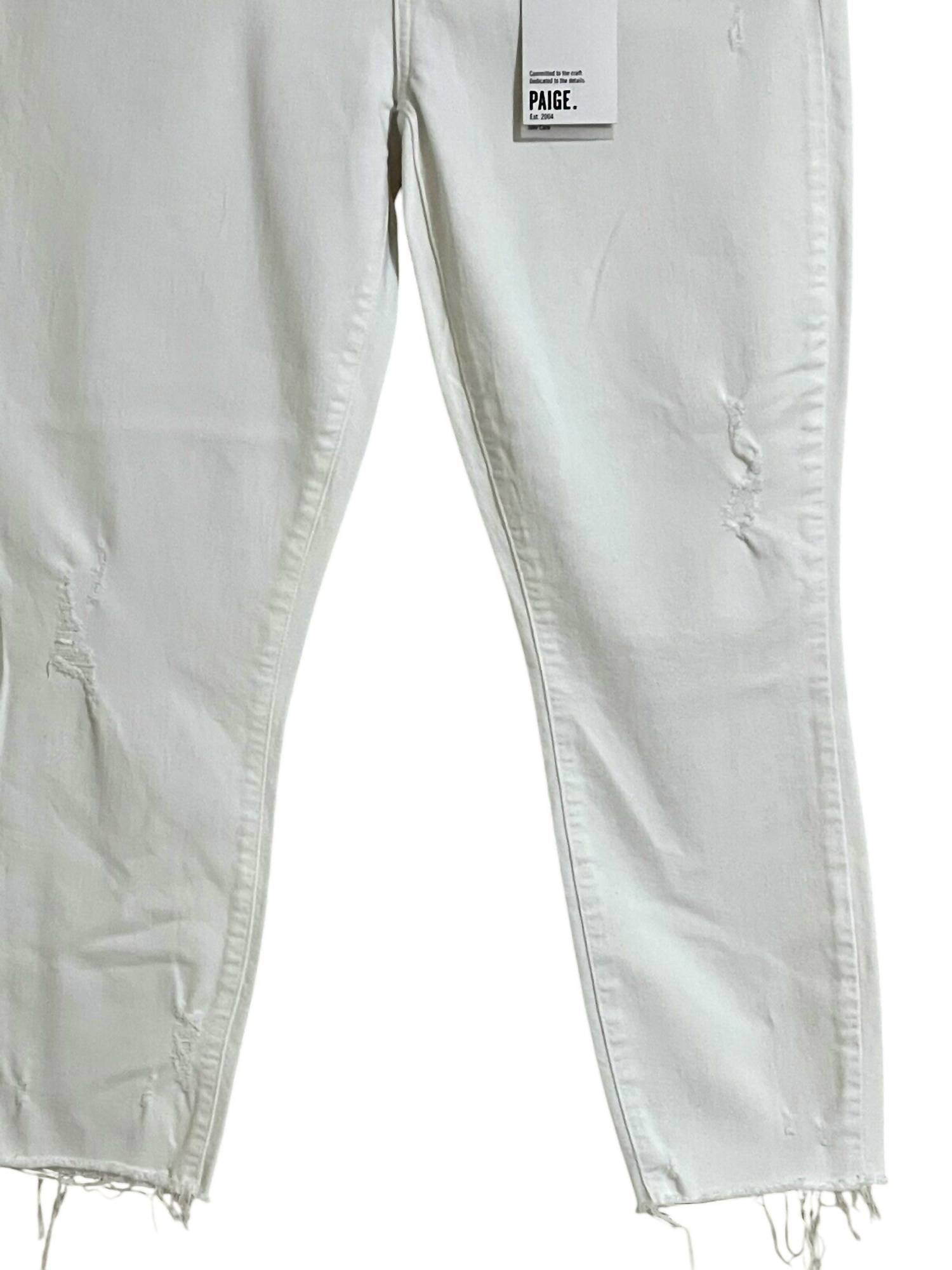 Discover the stylish Paige Women's Verdugo Crop Skinny Stretch Jeans, perfect for making a statement in classic white. Crafted from a premium blend of 58% Cotton, 20% Rayon, 13% Modal, 7% Polyester, and 2% Spandex, these jeans offer a comfortable and flexible fit. The denim material is designed with distressing throughout for an edgy look, and the jeans feature a cropped ankle hem for a chic finish. With a five-pocket style, button/zip fly, and belt loops, they combine functionality with contemporary fashion. Care instructions: Machine wash.