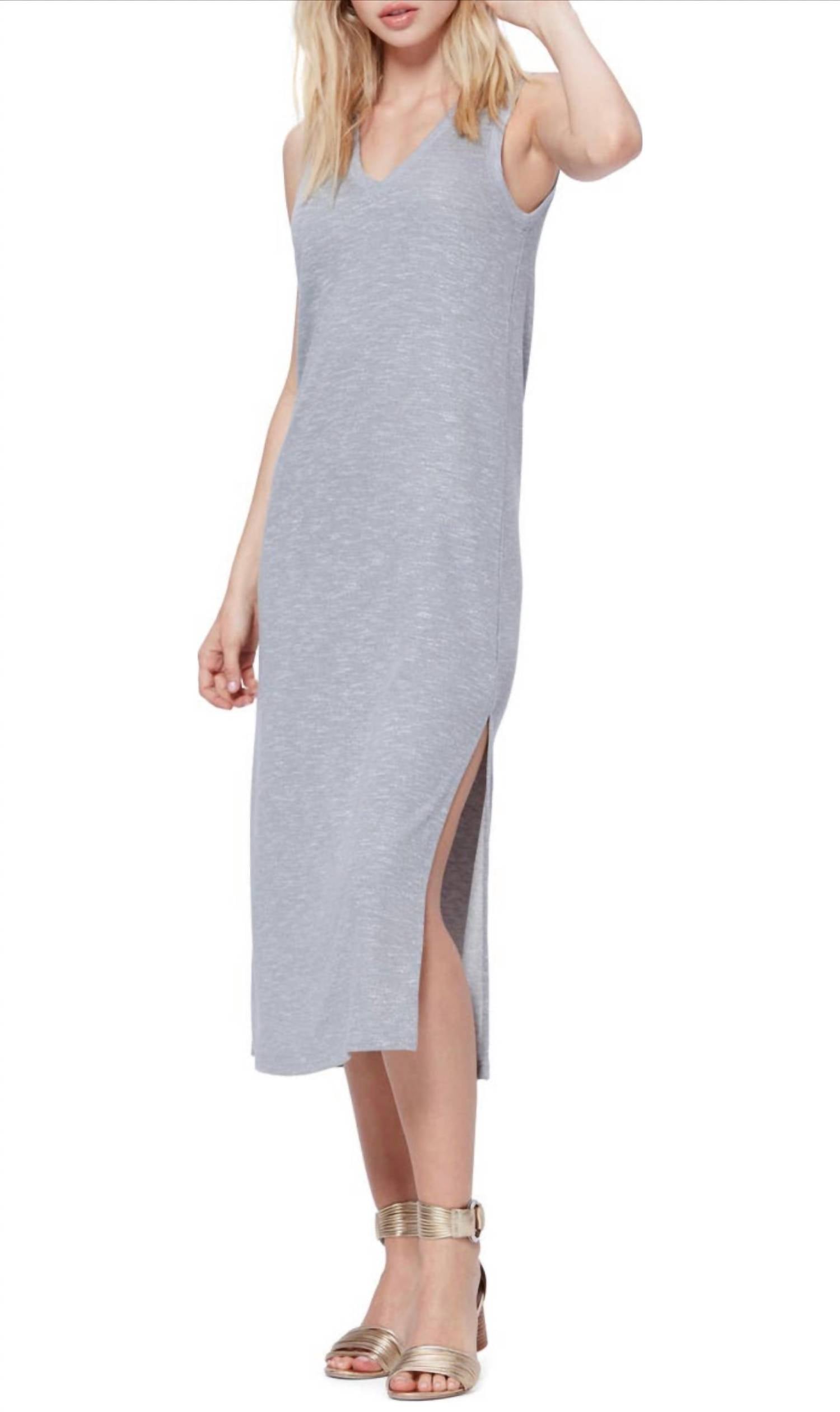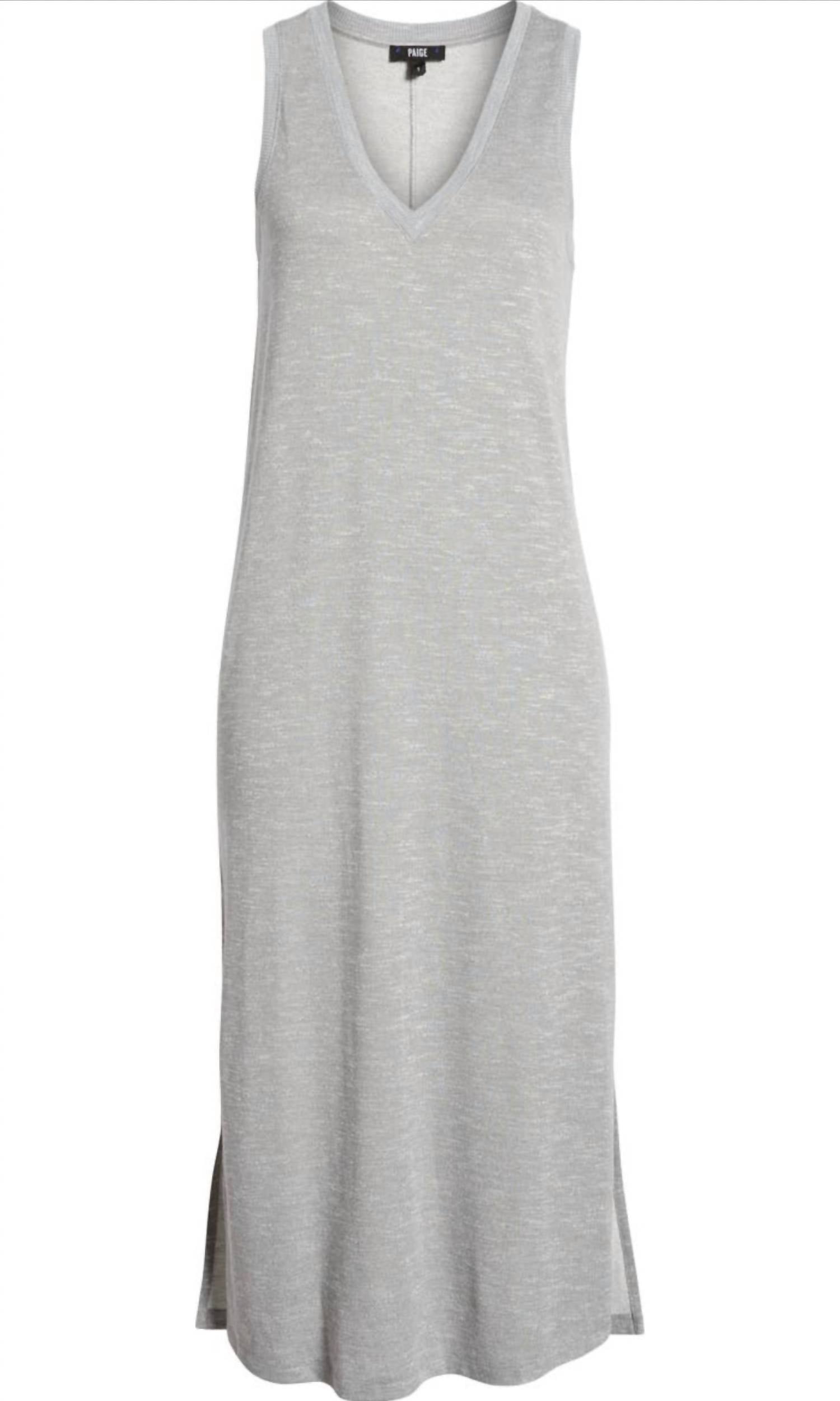 Introducing the Sage Midi Tank Dress by Paige, a versatile addition to your seasonal wardrobe. This sleeveless, A-line dress is crafted from soft, loose-knit terry composed of 53% rayon and 47% polyester, ensuring both comfort and style. Length ranging from 32" to 48" with a V-neck and side slits, it allows for unencumbered movement. The dress is available in a textured gray hue, with a convenient pull-on closure and is machine washable; simply lay flat to dry.