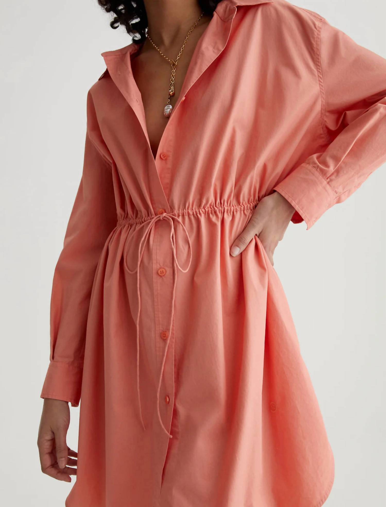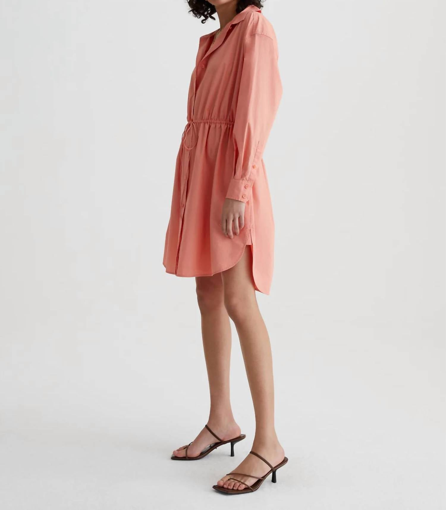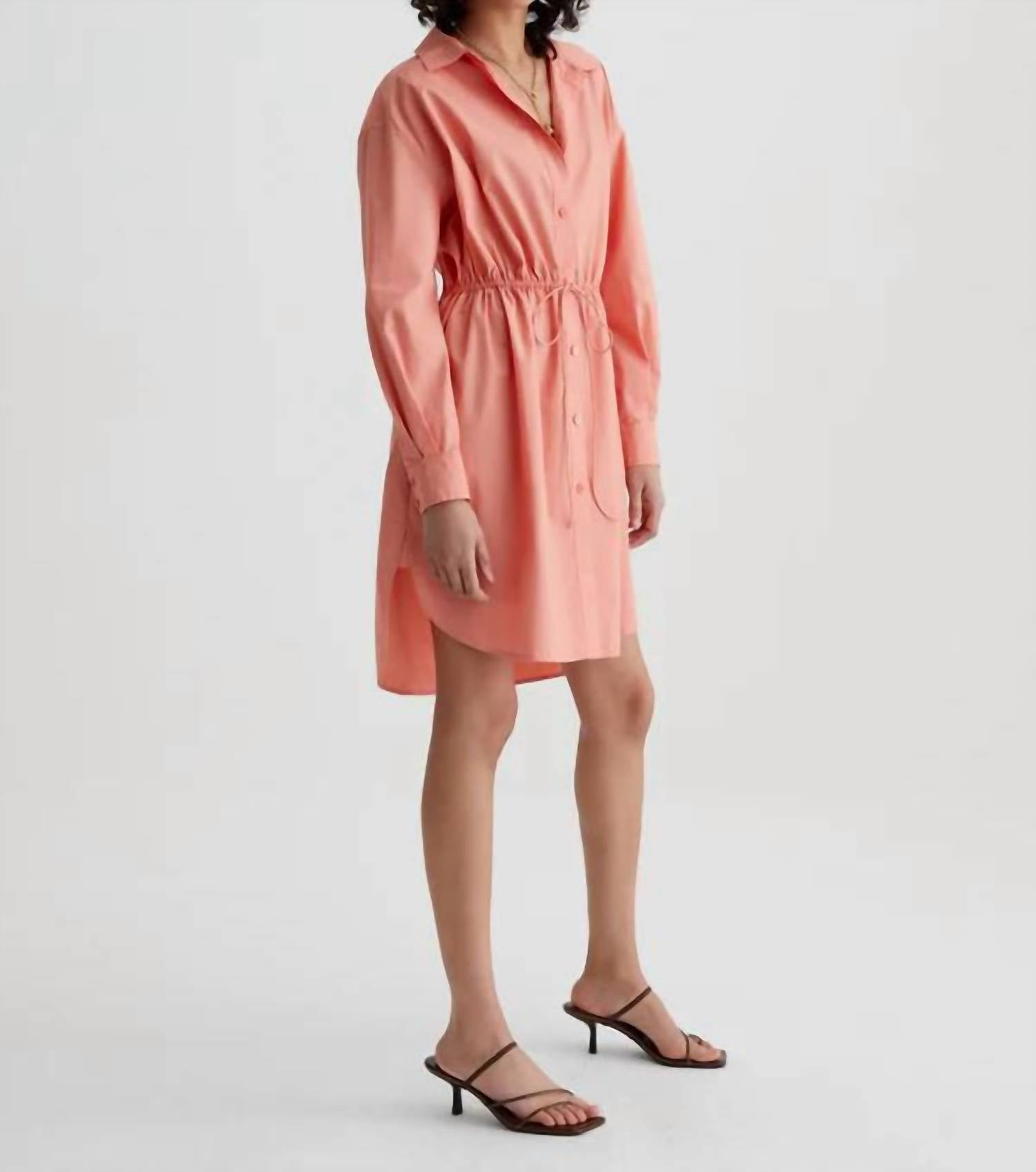 Comfortable and cute, this casual day dress has it all. Meet the Jolie Shirt Dress by AG Jeans, a standout in Pink Peach perfect for your spring wardrobe. This women's shift dress features long pleated sleeves and a classic collar, with a refined button closure and an adjustable drawstring for a tailored fit. Made from 100% cotton poplin, it offers a crisp, cooling touch ideal for minimalist style occasions like a baby shower or Easter gathering. Care: Machine wash for convenience and ease.