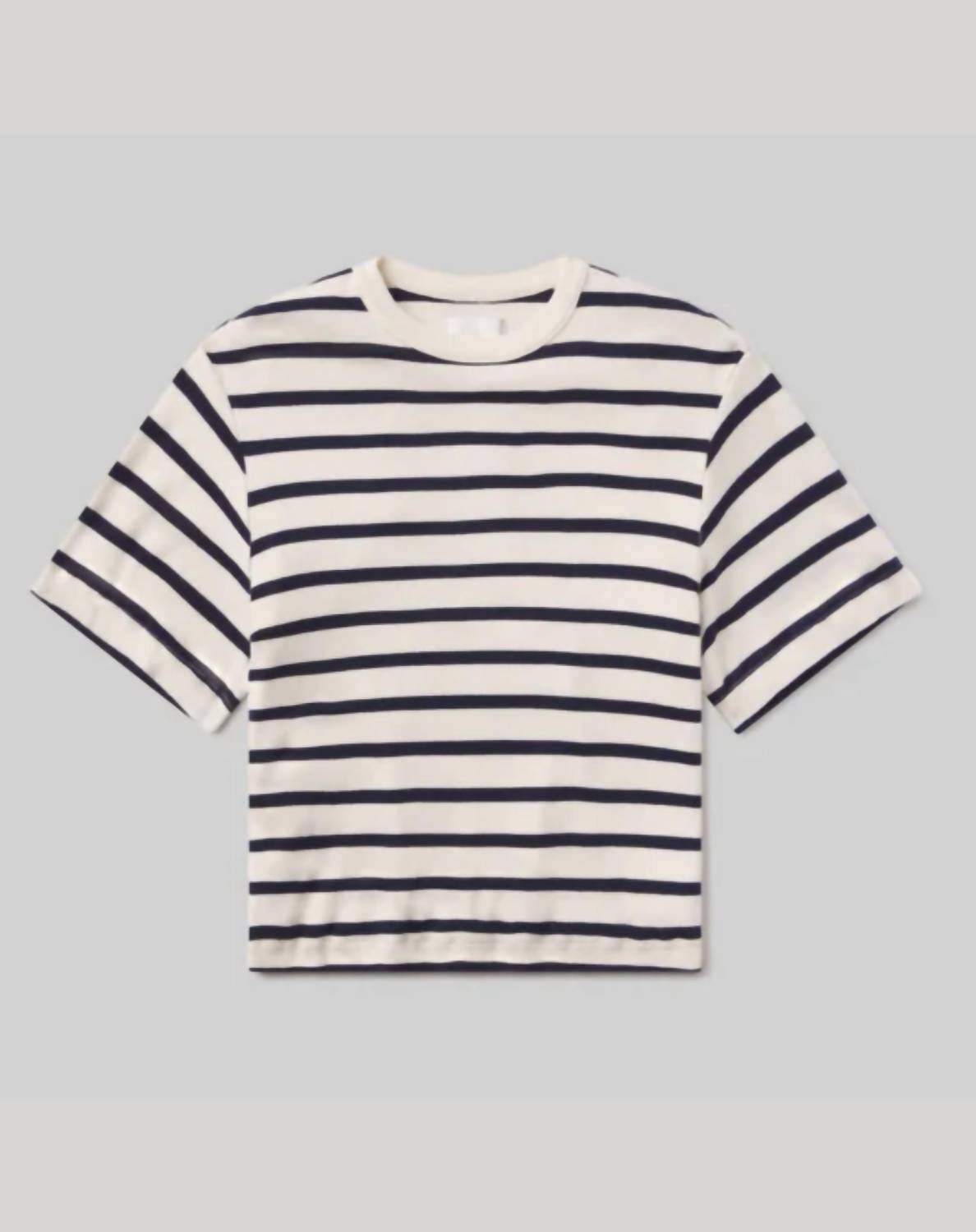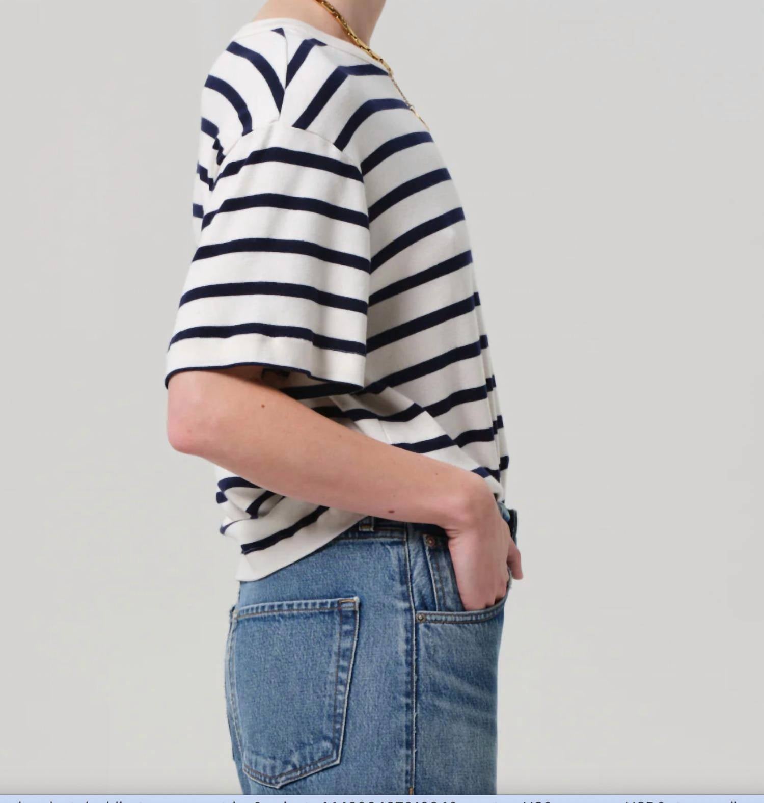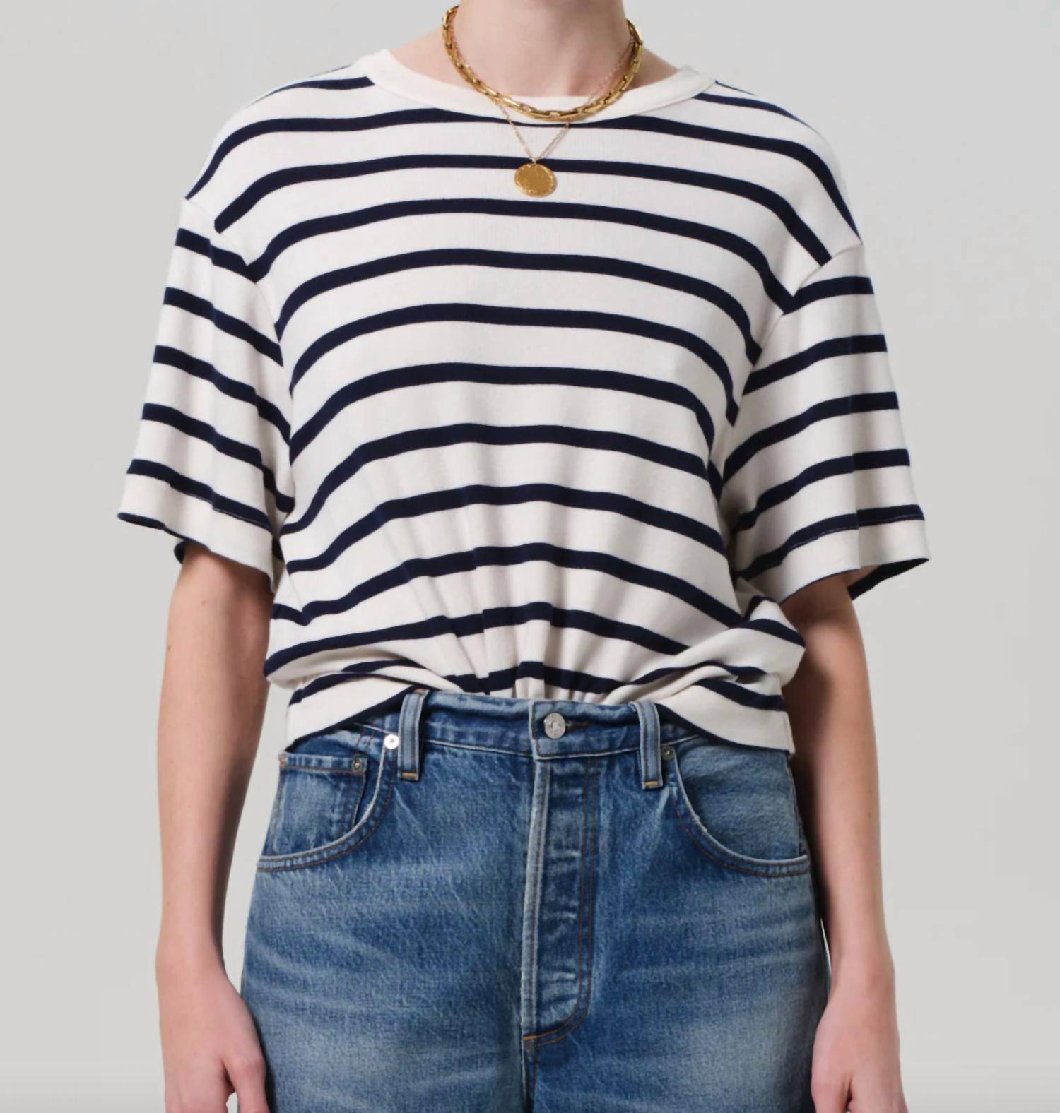 Look no further, you just found your perfect tee! The Goldie Tee by Citizens of Humanity offers a chic and relaxed fit with its elbow-length sleeves, perfect for all seasons. Crafted from a 90% cotton and 10% polyester blend, this Azure Stripe tee promises lightweight comfort that maintains its shape throughout the day. Designed as a pull-on with a classic crewneck, it's a stylish staple for any wardrobe. Care instructions include machine washing cold inside out with like colors and tumble drying on low.