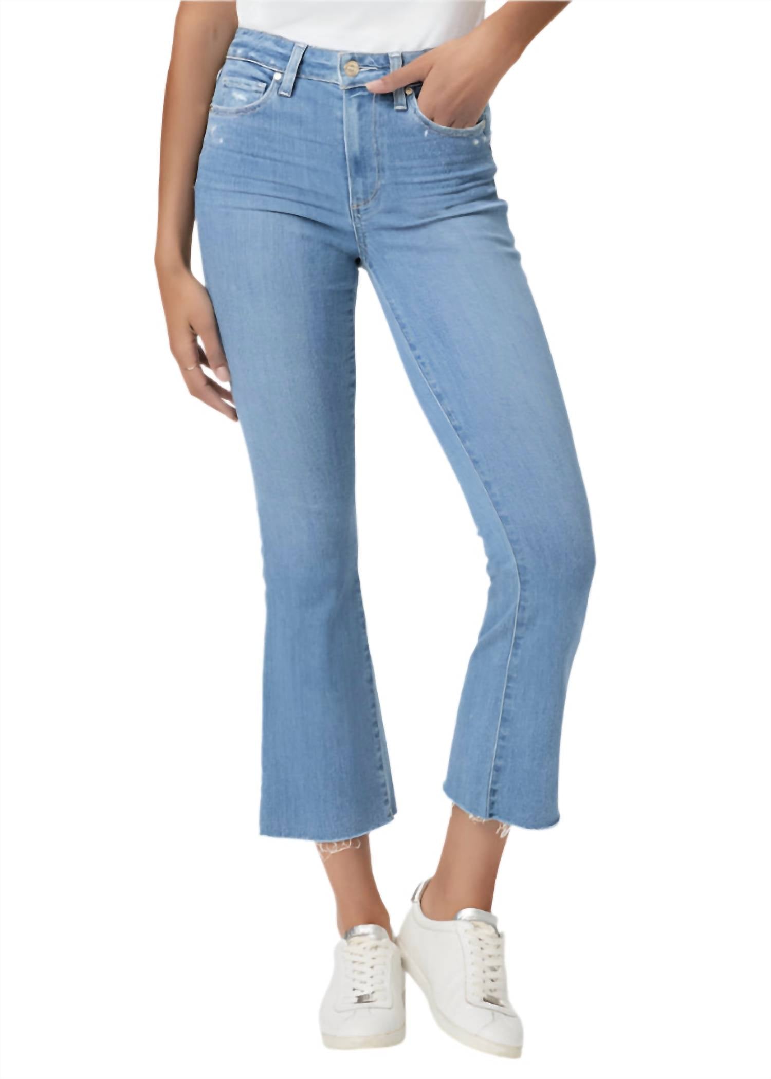 High-waist is here to stay and we especially love this style. Discover the Colette High Rise Crop Flare Jeans by Paige, a stylish choice for a modern streetwear look. Designed in a solid pattern, these denim jeans feature a high-rise, slim-fit waist that leads to a flared leg, with a button closure for secure wear. The light wash with subtle distressing and a destructed hem adds a touch of vintage charm, made from TRANSCEND VINTAGE denim for superior comfort and stretch. Ideal for spring vacations, these jeans are machine washable and can be tumble dried, offering both style and easy maintenance.