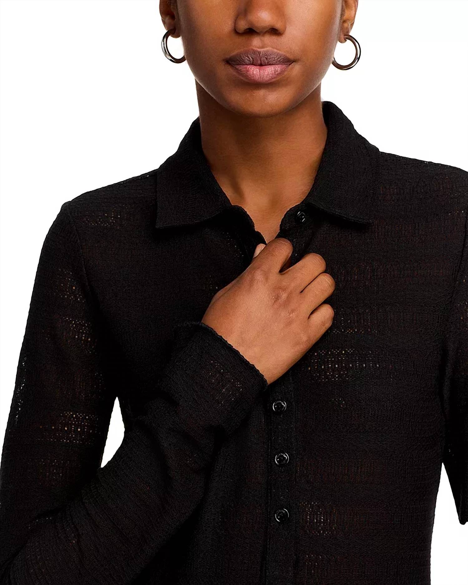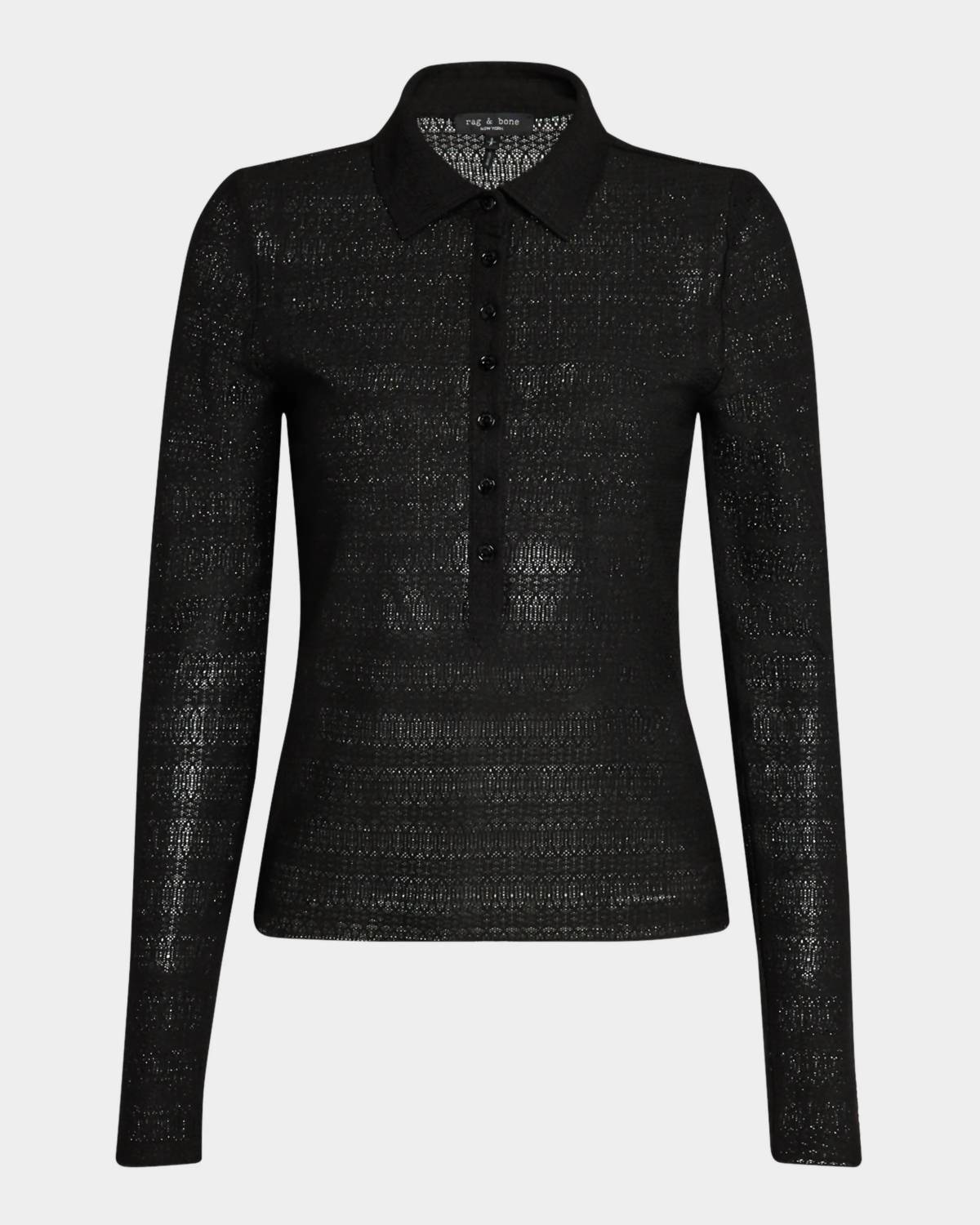 Elevate your wardrobe with the Julia Long Sleeve Polo from Rag & Bone, expertly knit with pointelle detailing for a touch of elegance. This fitted silhouette features a polo collar with drop shoulders and long sleeves, crafted from a blend of 95% polyester and 5% spandex for comfort and stretch. Sleeve length: Long. Closure: Front button placket. Care: Machine washable. Origin: Imported. Perfect for adding sophistication to any casual ensemble.