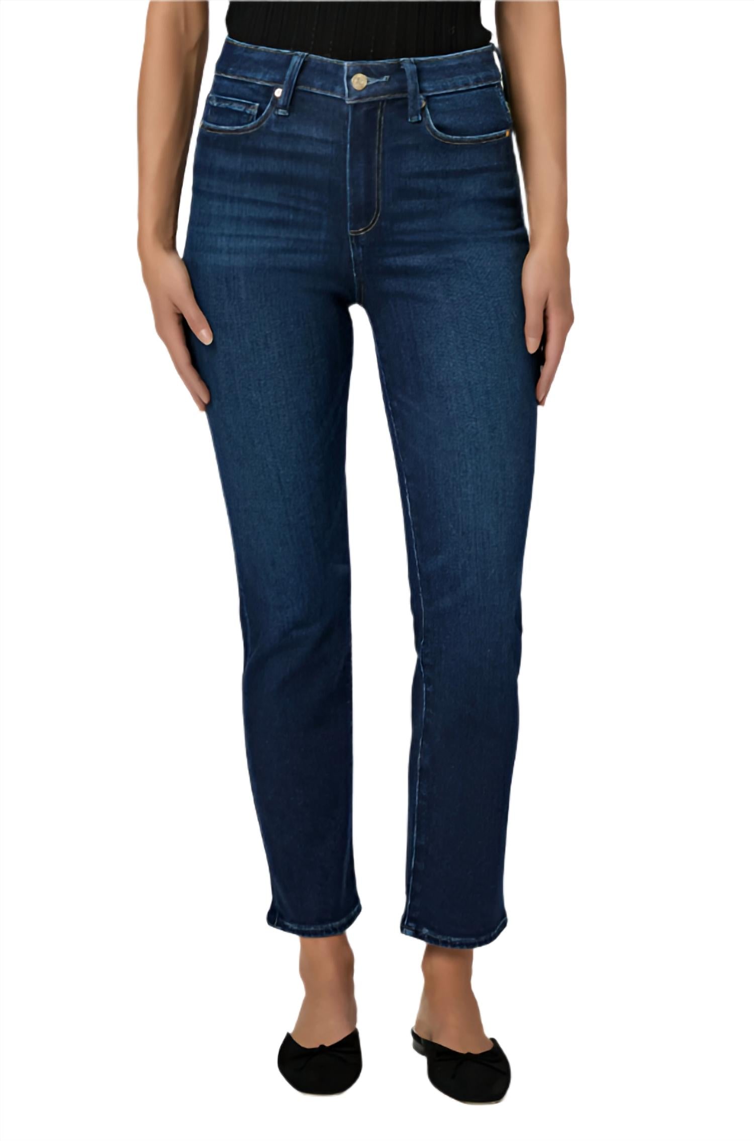 These must-have jeans are fit to perfection. Experience the Cindy Straight Leg Jean by Paige, a staple in women's streetwear perfectly tailored for a relaxed fit. Crafted in a solid Waterloo hue with a high rise of 10.25 inches, these jeans offer a dark wash finish with a leg opening measuring 14.25 inches. Designed with a straight leg style that hits at an ankle inseam of 28 inches, they are equipped with a practical button closure and handy pockets. Care: Machine wash and tumble dry. Ideal for vacation and spring occasions.