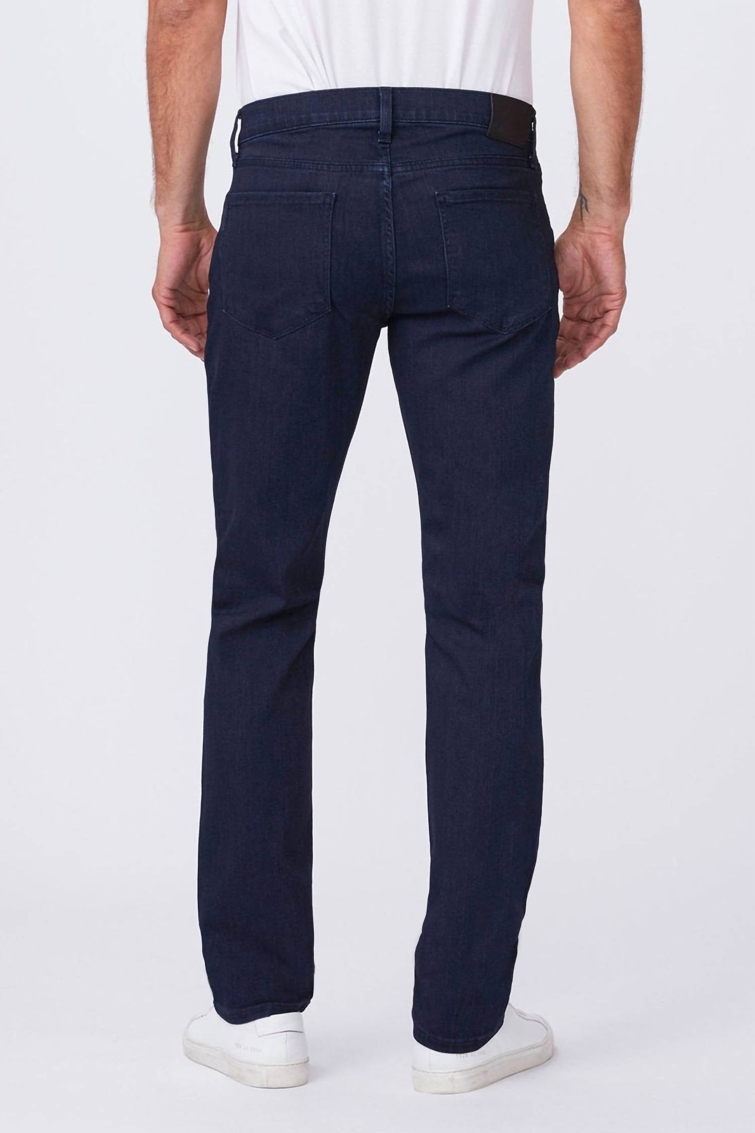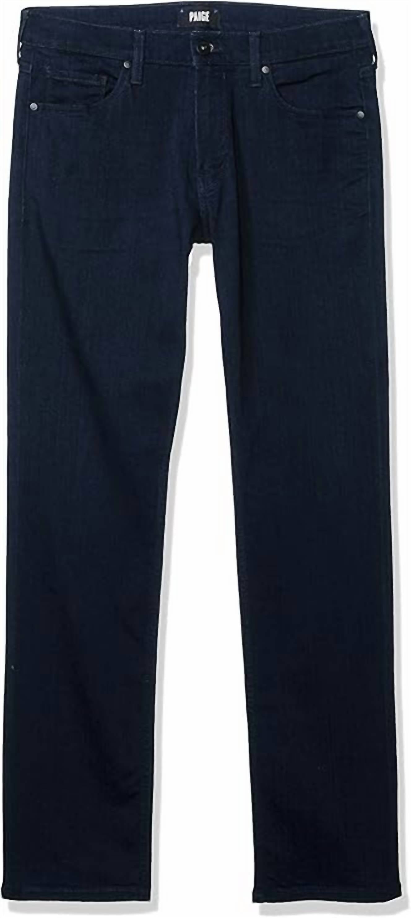 Introducing the Normandie Transcend Jeans by Paige, designed for men seeking comfort and style in a sleek inkwell hue. These jeans boast a slim-straight leg fit with a 34-inch inseam and are crafted from TRANSCEND denim — a blend of 52% Rayon, 26% Cotton, 21% Polyester, and 1% Spandex for premium stretch and recovery. The jeans feature a zipper closure and are imported, ensuring quality craftsmanship. Care for these jeans is easy with machine wash instructions.