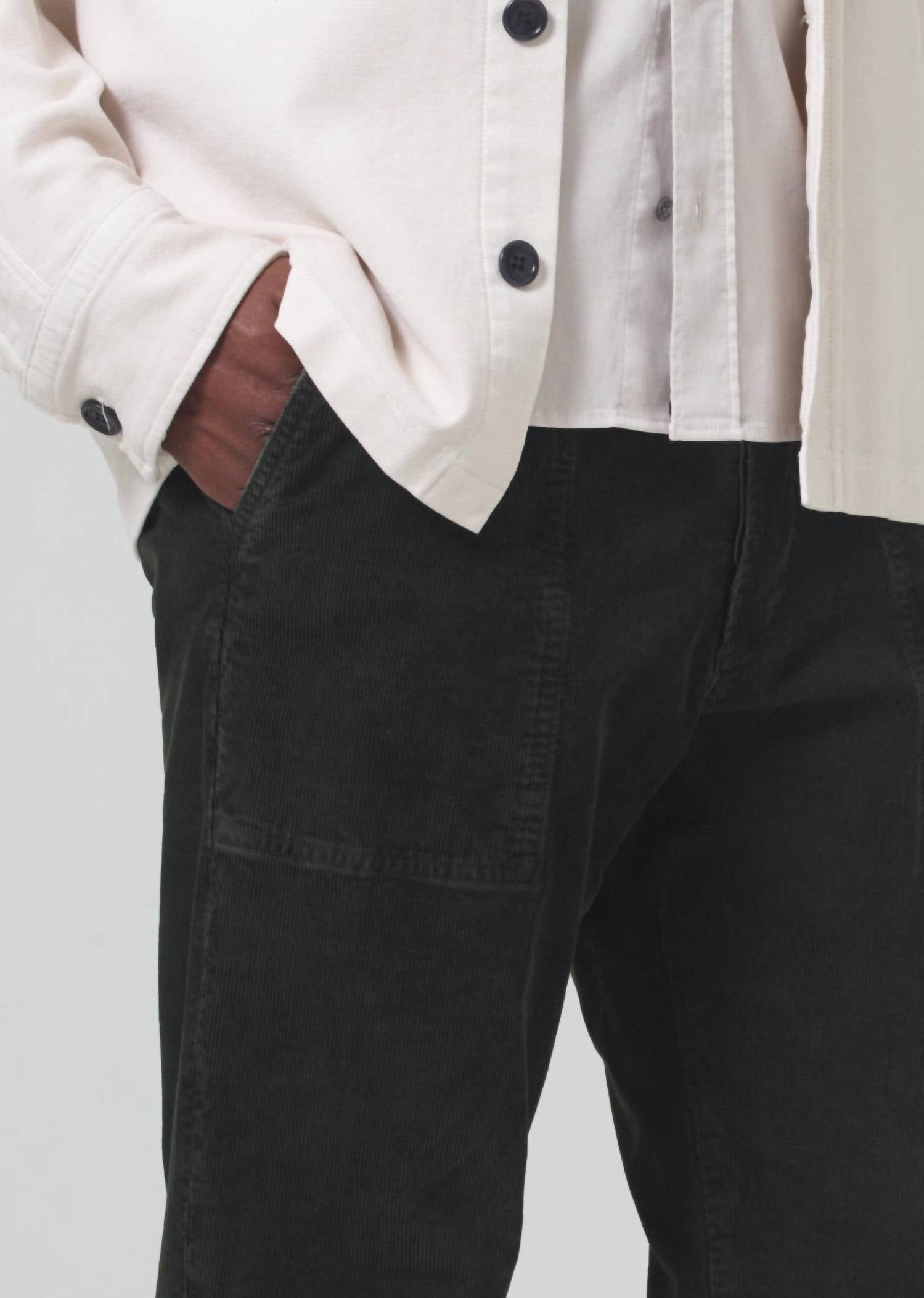 Discover comfort and style with the Finn Slightly Tapered Leg Jean by Citizens of Humanity, featuring an ultra-relaxed rise and a slightly tapered leg design, perfect for any occasion. Crafted from 100% cotton in a heavyweight textured corduroy, this jean is presented in a deep dark olive green, while its relaxed fit ensures all-day wearability. Closure: Button fly. Care: Machine wash cold inside out, do not bleach, and tumble dry low. Made in the USA with imported materials, this piece offers a versatile addition to your streetwear collection, ideal for vacation or Thanksgiving celebrations.