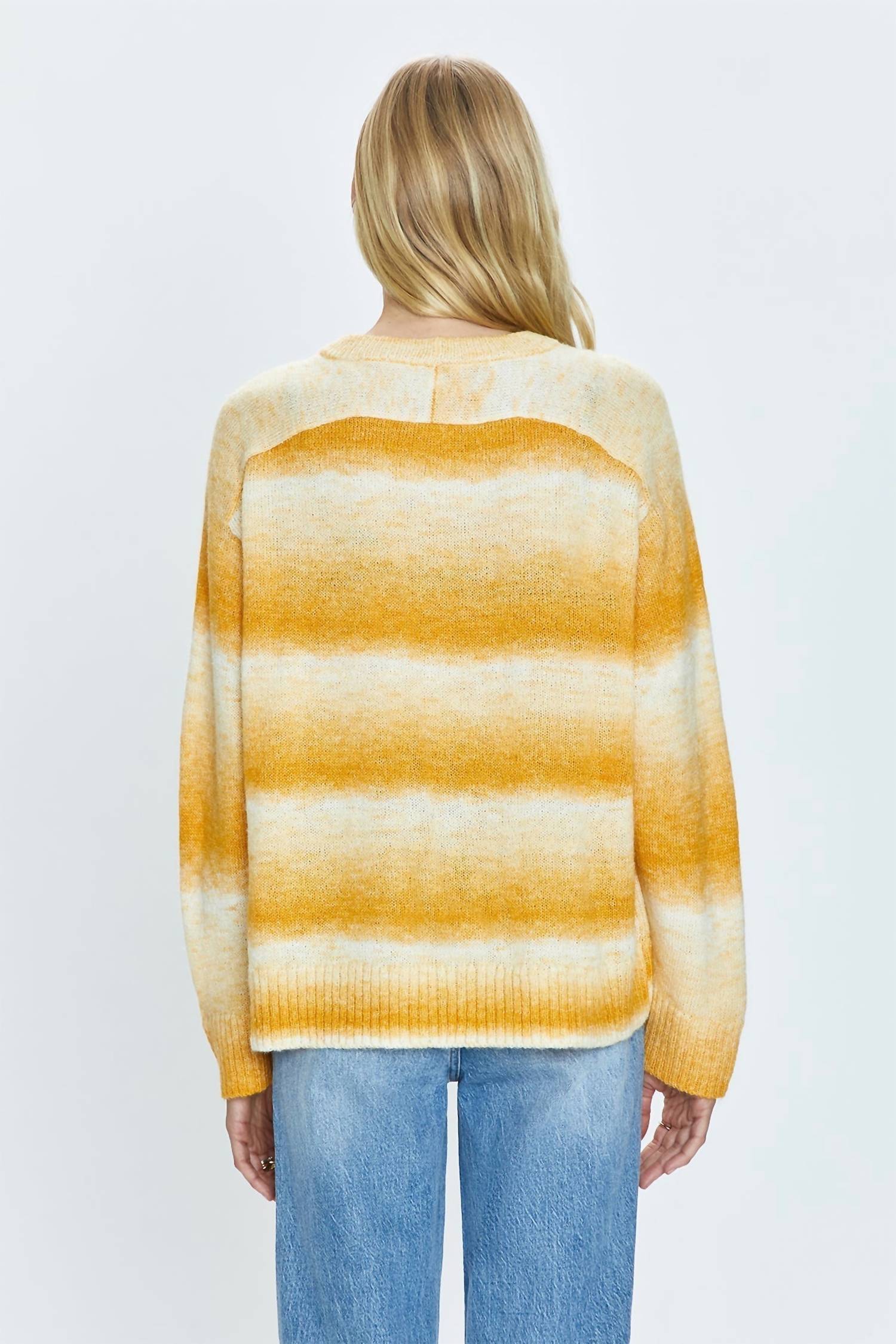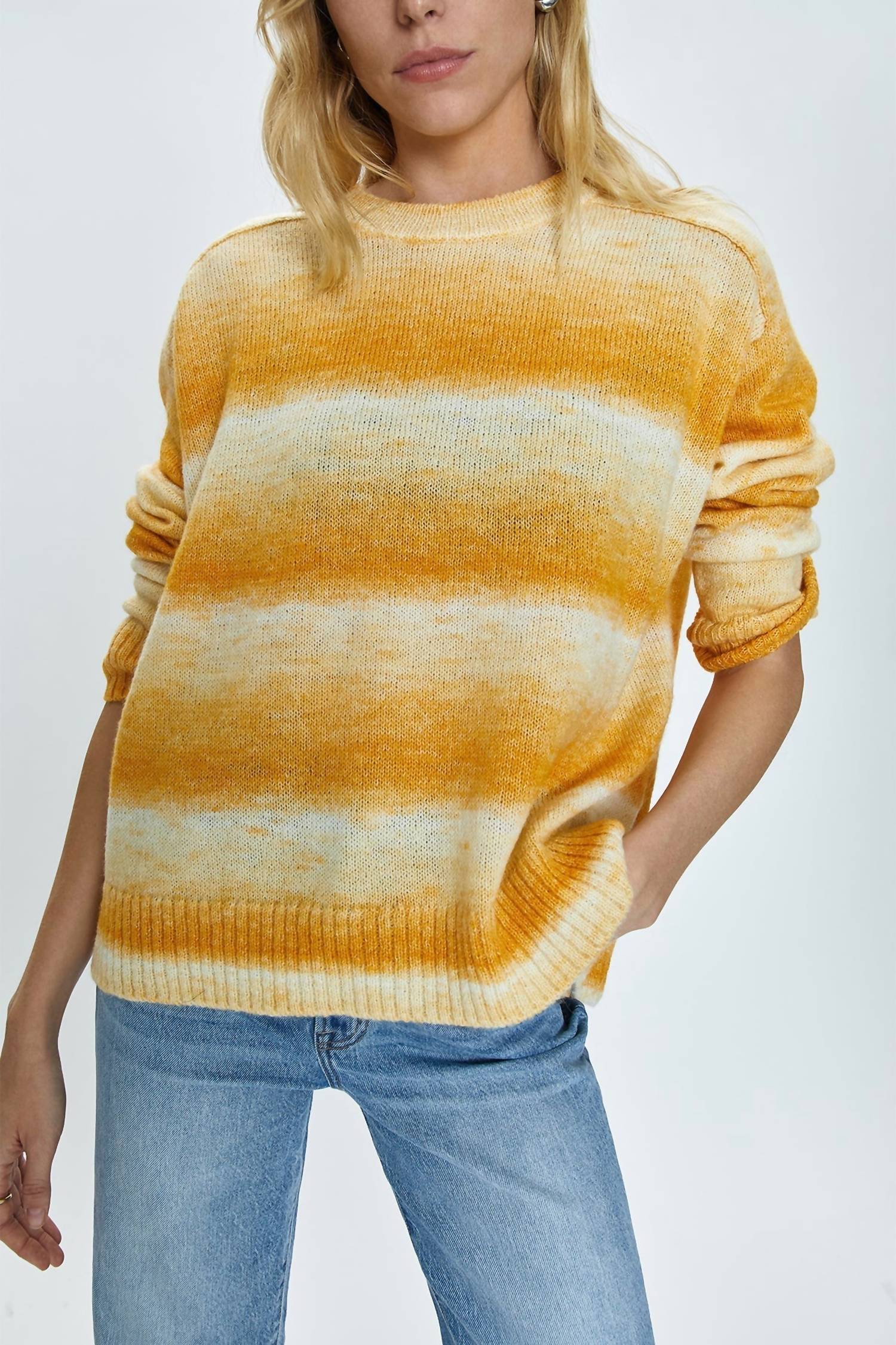 Experience the perfect blend of comfort and style with this trendy crew neck sweater, designed to effortlessly elevate your wardrobe. Pair it with your favorite denim and loafers for the perfect look. Introducing the Kaya Sweater by PISTOLA, a women's crewneck crafted for easy style in the striking color "Sunset." This long sleeve garment is made from a polyester blend with raglan shoulders and a relaxed fit, measuring 24.5 in length. Featuring a dip-dye striped pattern in warm shades of ivory, yellow, and orange, it's an ideal transitional piece. Closure is pull-on, with care instructions for machine washing.