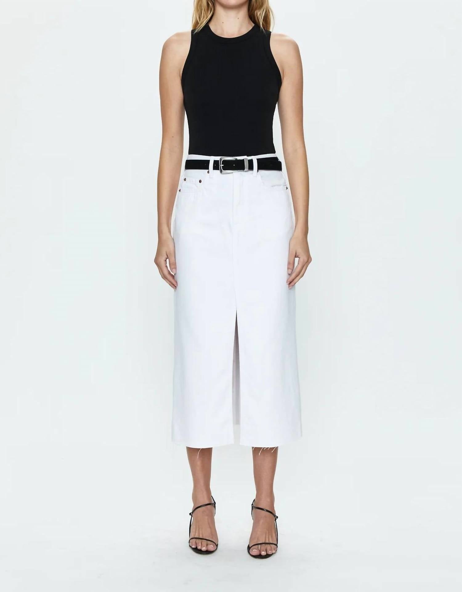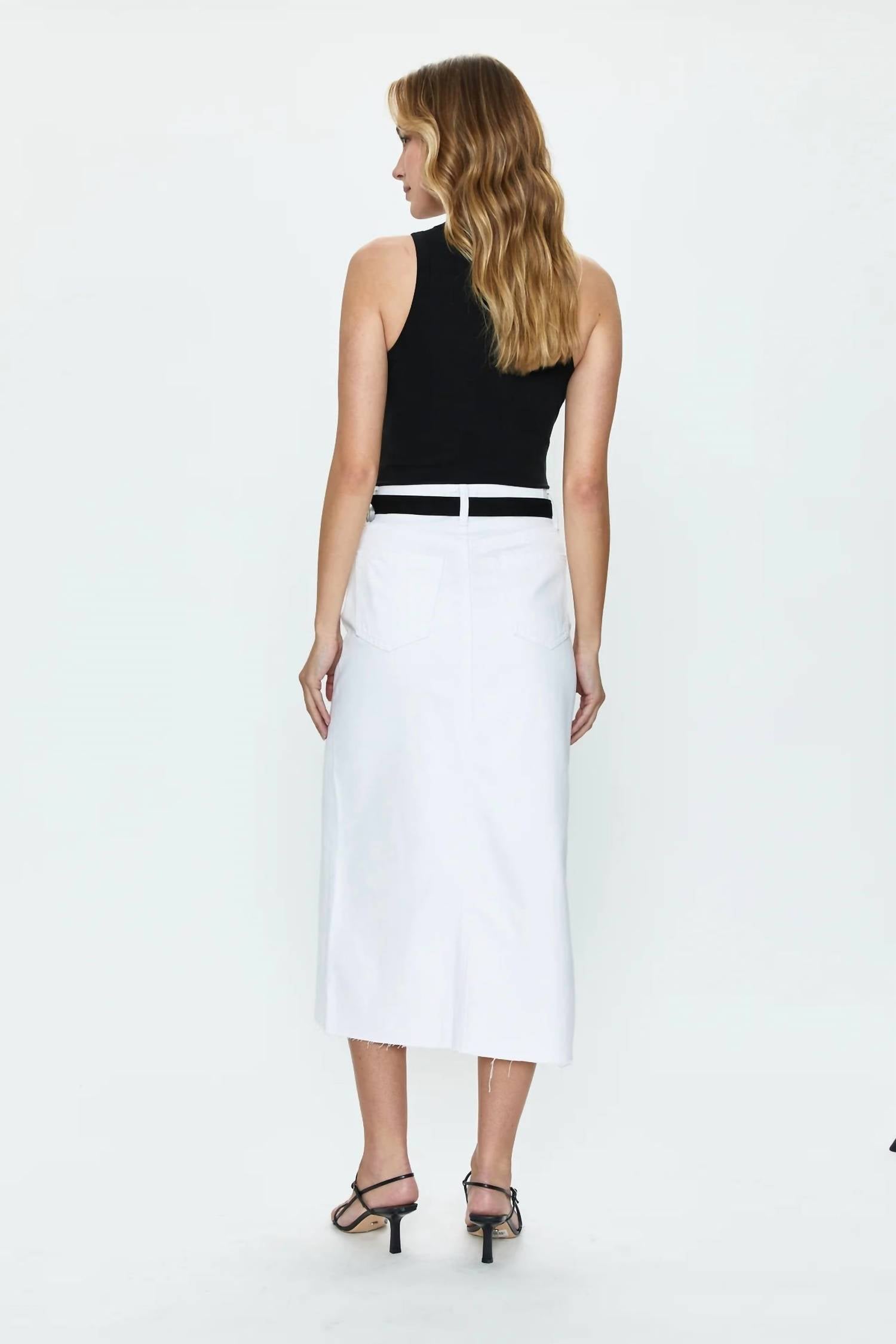 The midi length skirt is here to stay and we especially love this style. Meet the Alice Denim Midi Skirt by Pistola, a standout piece for any wardrobe with its solid white hue and on-trend 90s fashion flair. This women's skirt is tailored from 77% cotton and 23% rayon in a midi length, showcasing a button closure and a contemporary front skirt slit. Designed without pockets, it captivates with a frayed hem detail, perfect for Valentine's Day or travel occasions. Care instructions are simple: machine wash and lay flat to dry, ensuring effortless maintenance.