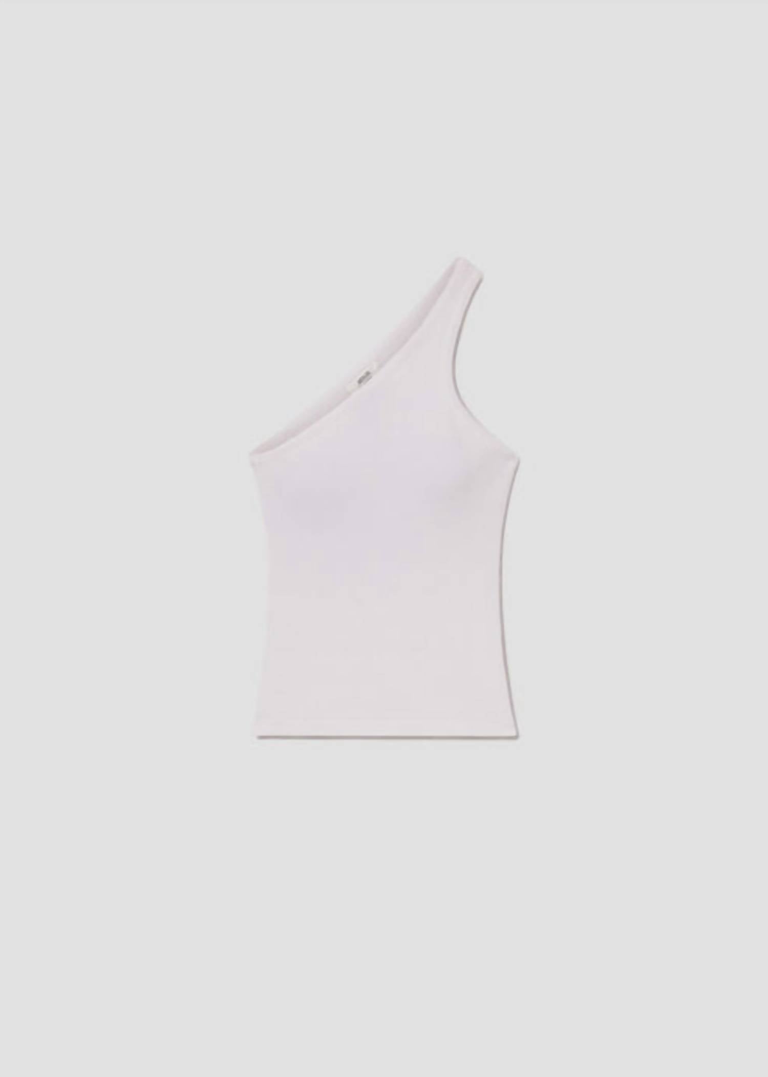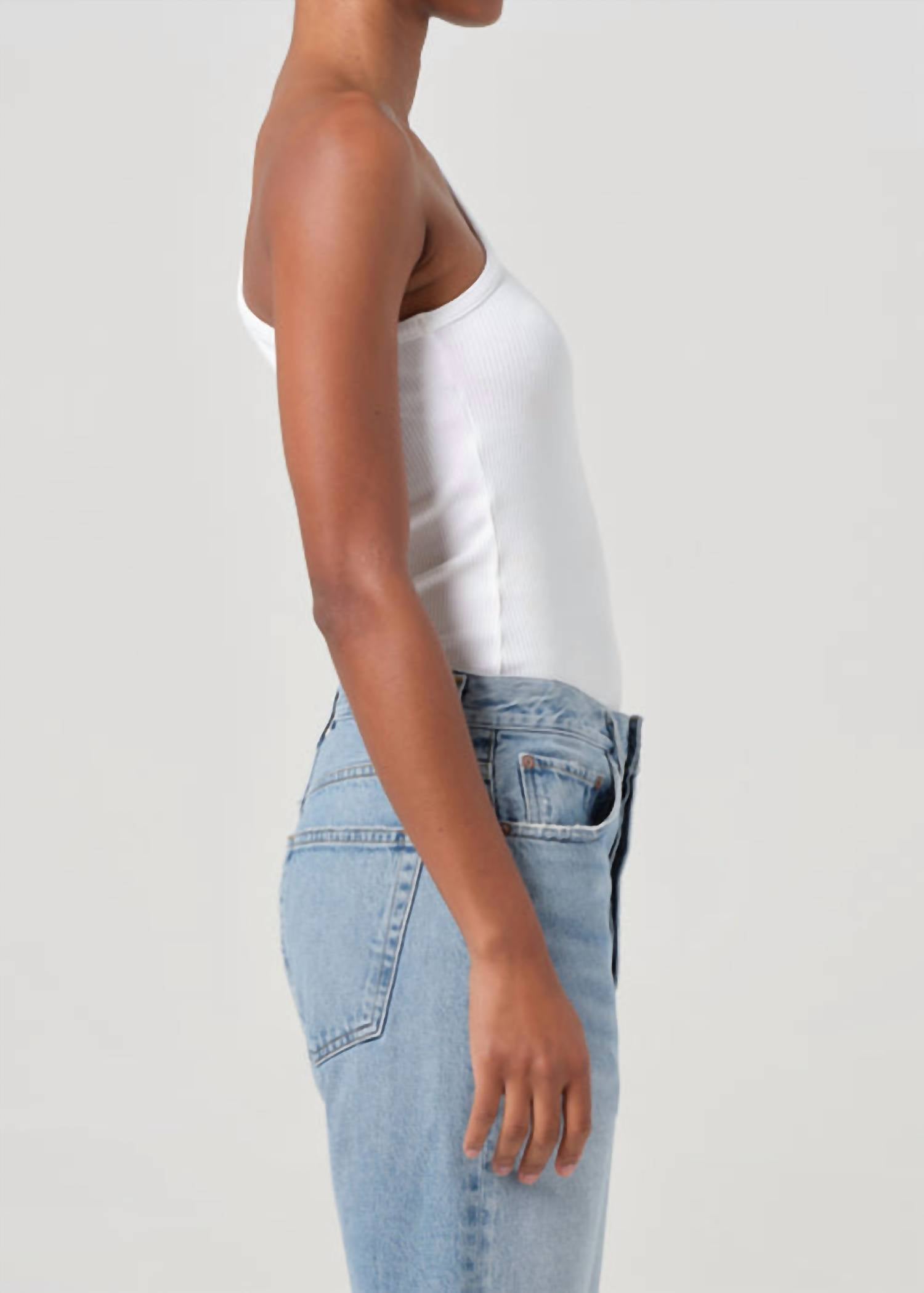 Fit, fabric and functionality. This tank top checks all the boxes. Introducing the AGOLDE Verica Tank, a stylish sleeveless design perfect for modern wardrobes. This one-shoulder tank is crafted from a blend of 49% Organic Cotton, 49% Lyocell, and 2% Spandex, delivering an ultra-soft feel and supportive ribbed texture with excellent shape retention. With a body length of 23 inches and a sleek pull-on style, it offers a form-fitting silhouette that works well layered or on its own. Originating from the US, this versatile white tank is easy to care for with machine washing. Model is 5'10" and is wearing a size small, with a chest measurement of 24 inches and a sweep of 26 1/2 inches.