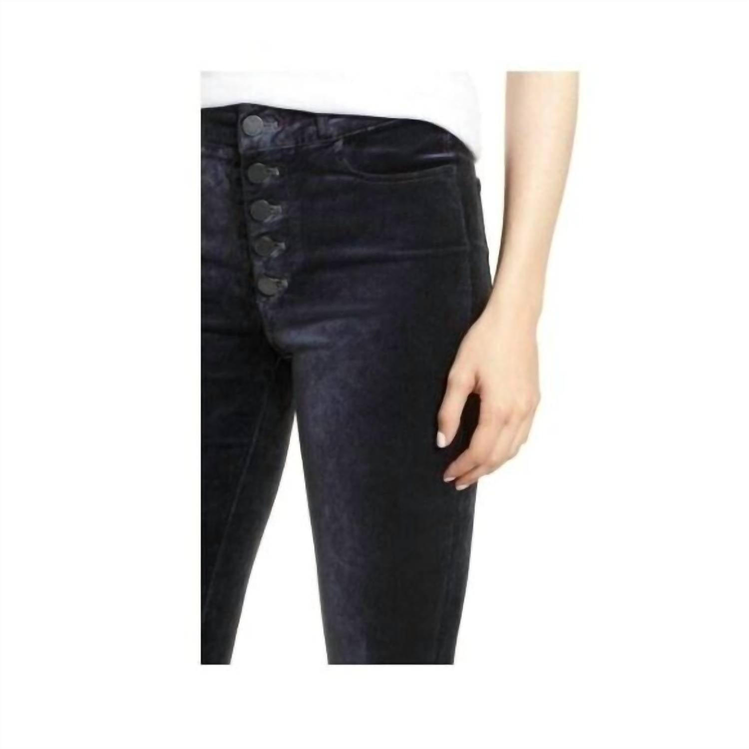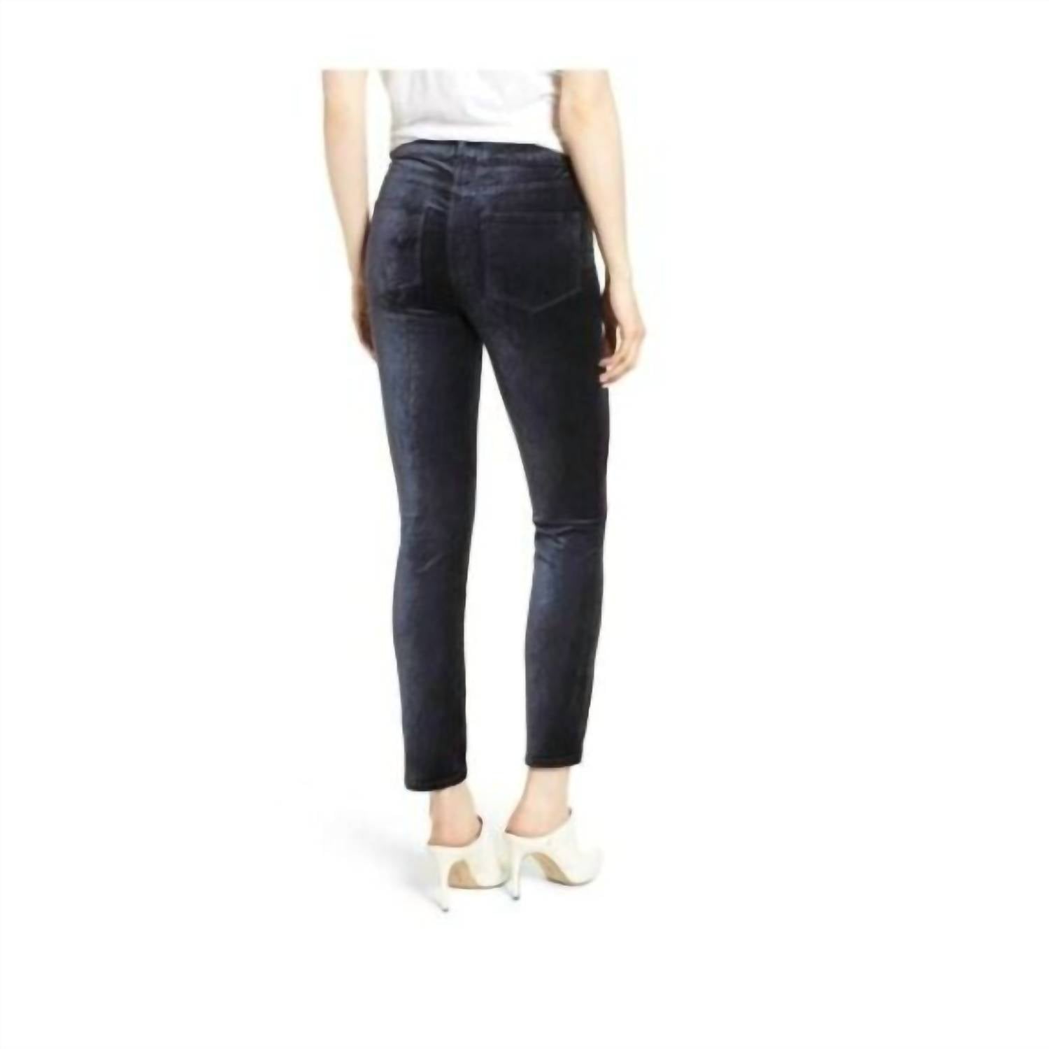 Discover the luxurious PAIGE Hoxton Ankle Midnight Slate Velvet Skinny Jeans, perfect for adding a touch of soft shine to your look. Crafted from a cotton blend composed of 54% cotton, 44% rayon, and 2% spandex, these jeans offer a lustrous stretch-velvet feel with a slightly straighter fit around the calves. Featuring a high rise and an exposed button fly closure, they ensure style and comfort. With an inseam of 27.5", a front rise of 8.75", a back rise of 12.5", and a leg opening at the hip measuring 9", these jeans are tailored for the perfect fit, complete with a practical five-pocket design. Care is simple with machine washing and tumble drying, making them a versatile addition to any wardrobe.