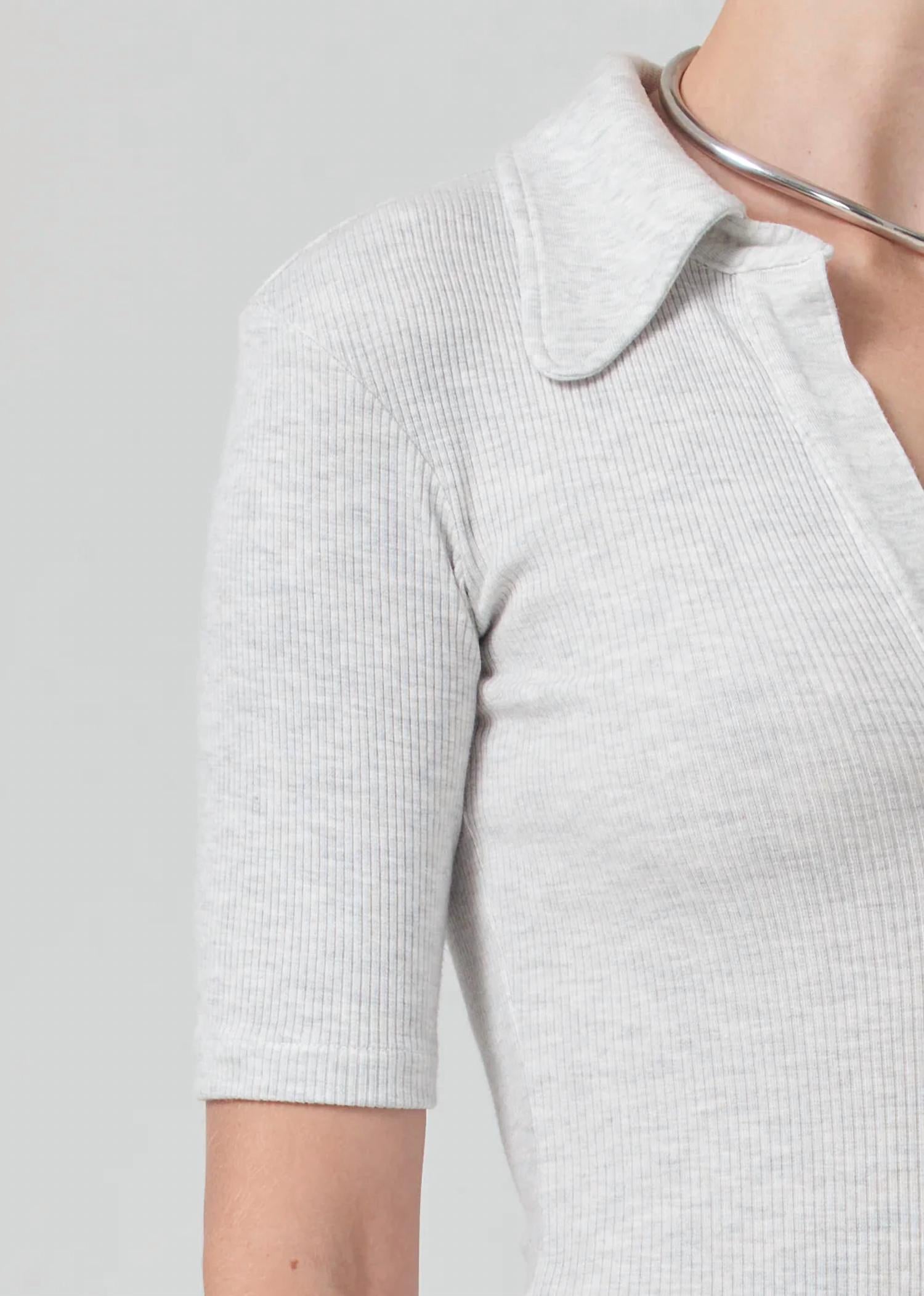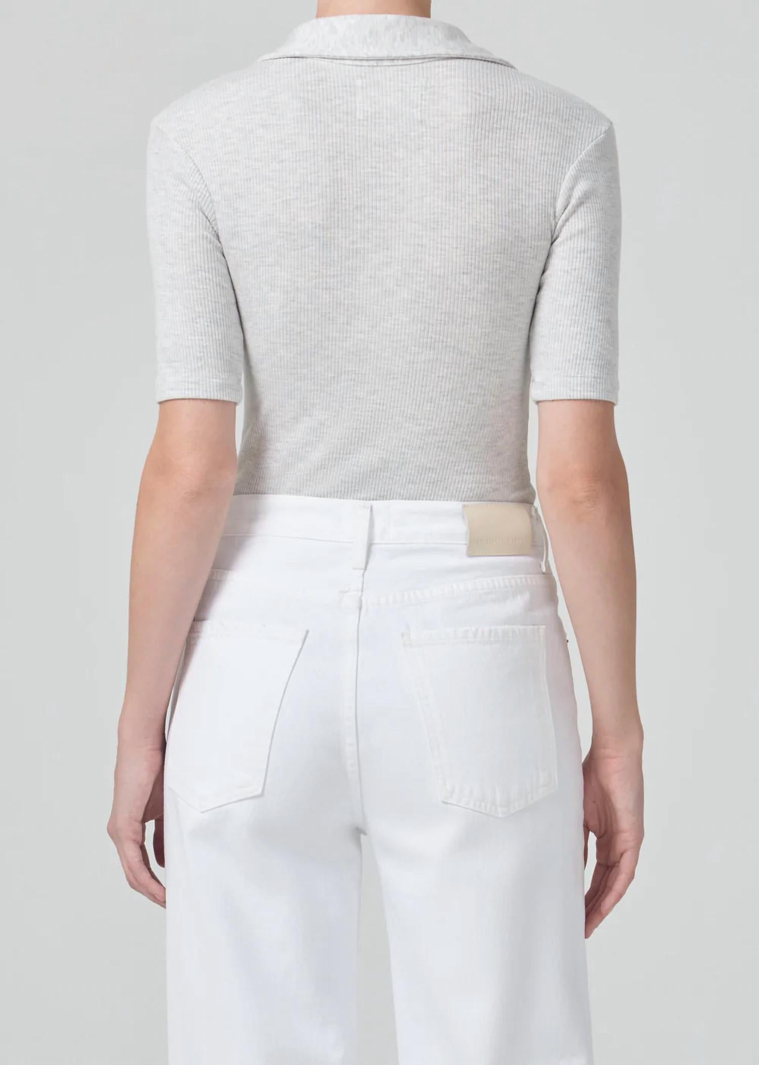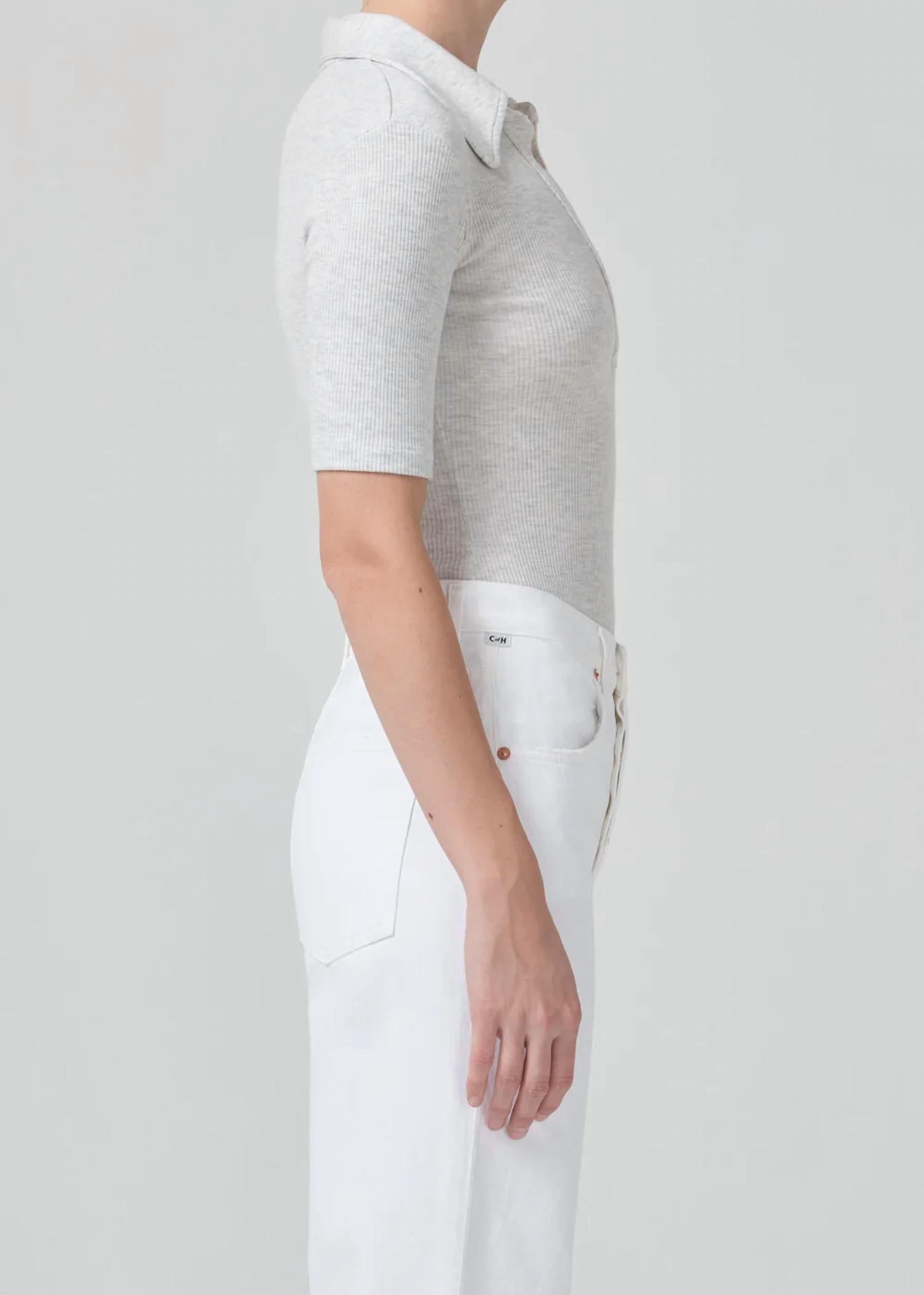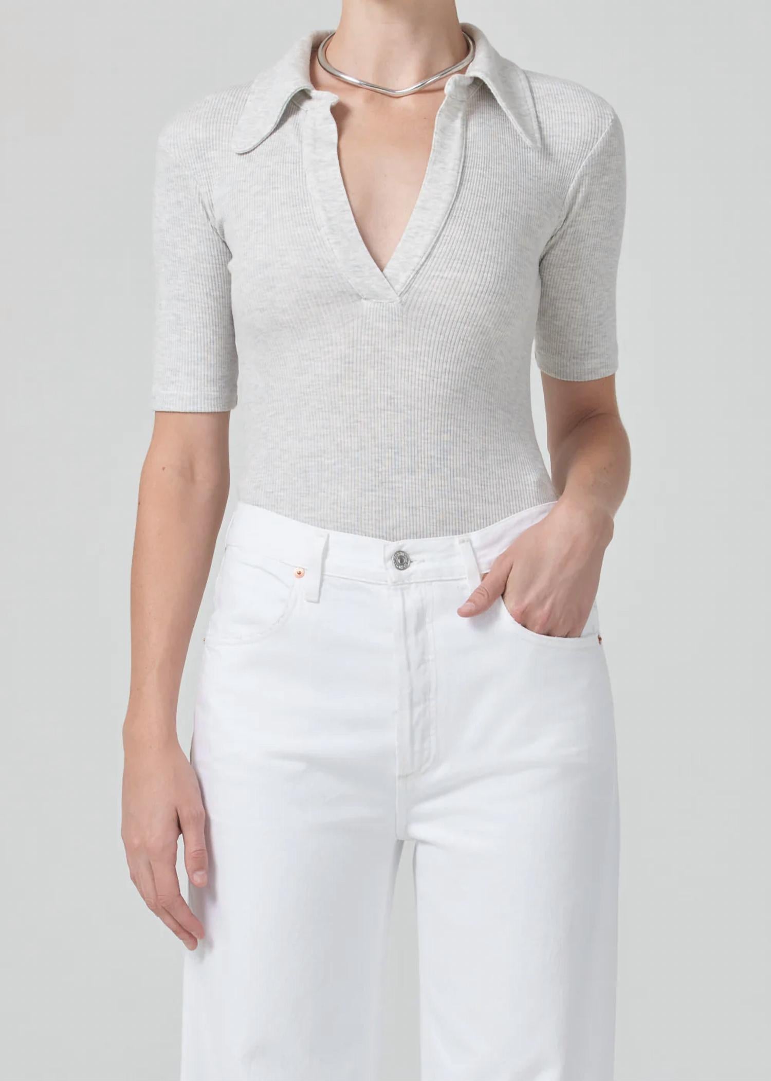 Who doesn't love a good bodysuit? Jump into style with the Citizens of Humanity Liu Bodysuit. This comfy bodysuit features a flattering v-neckline, quarter length sleeves, and a classic polo neck. Perfect for any outfit, this Heather Grey number will keep you looking effortlessly stylish. Fits true to size. Chest: 25 1/2". Waist: 23 1/2". Body Length: 28". Sleeve Length: 9 1/4". Model is 5'10" and wearing a size small. 68% Tencel lyocell 30% Organic Cotton 2% Spandex. Machine wash cold