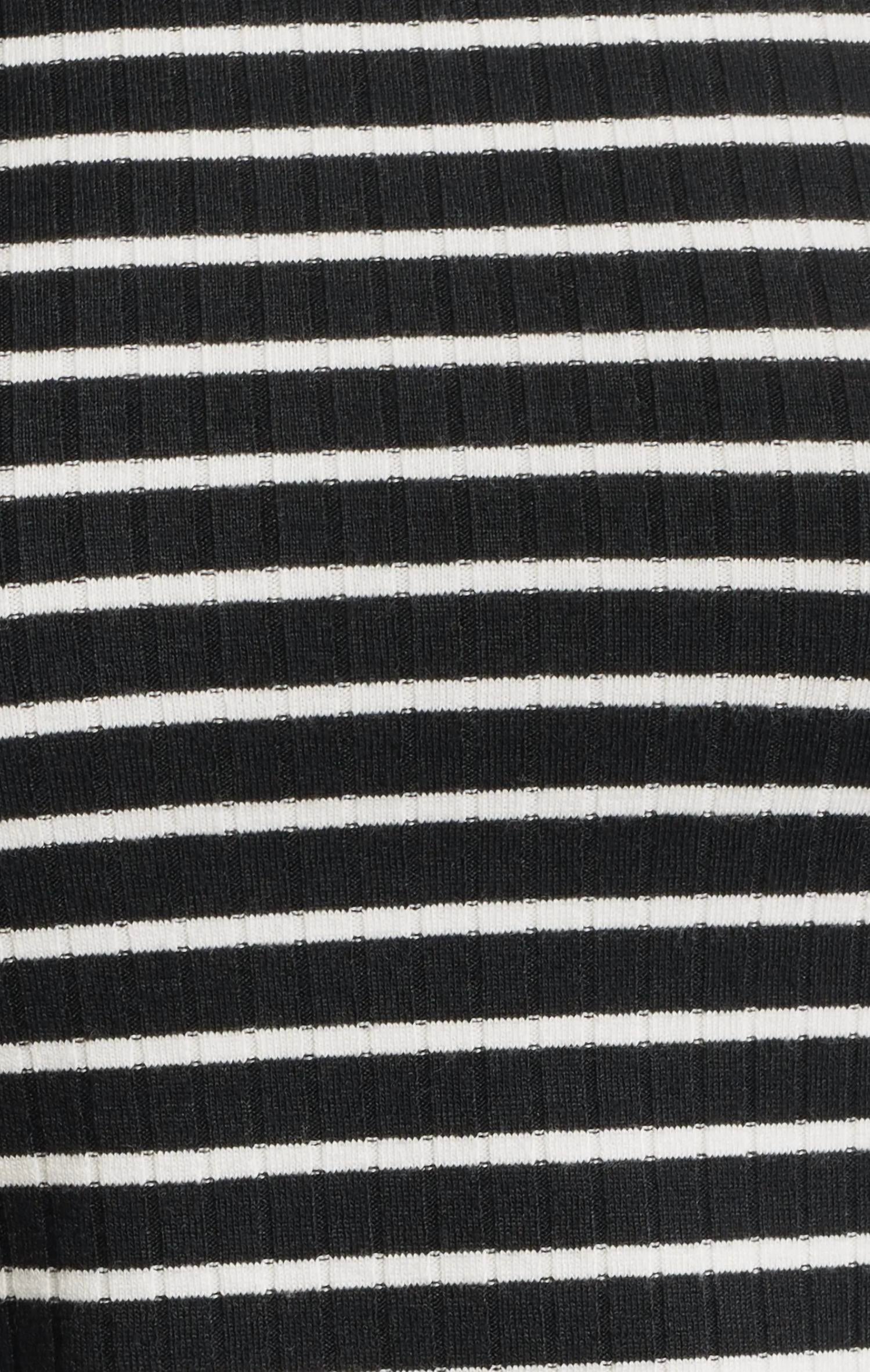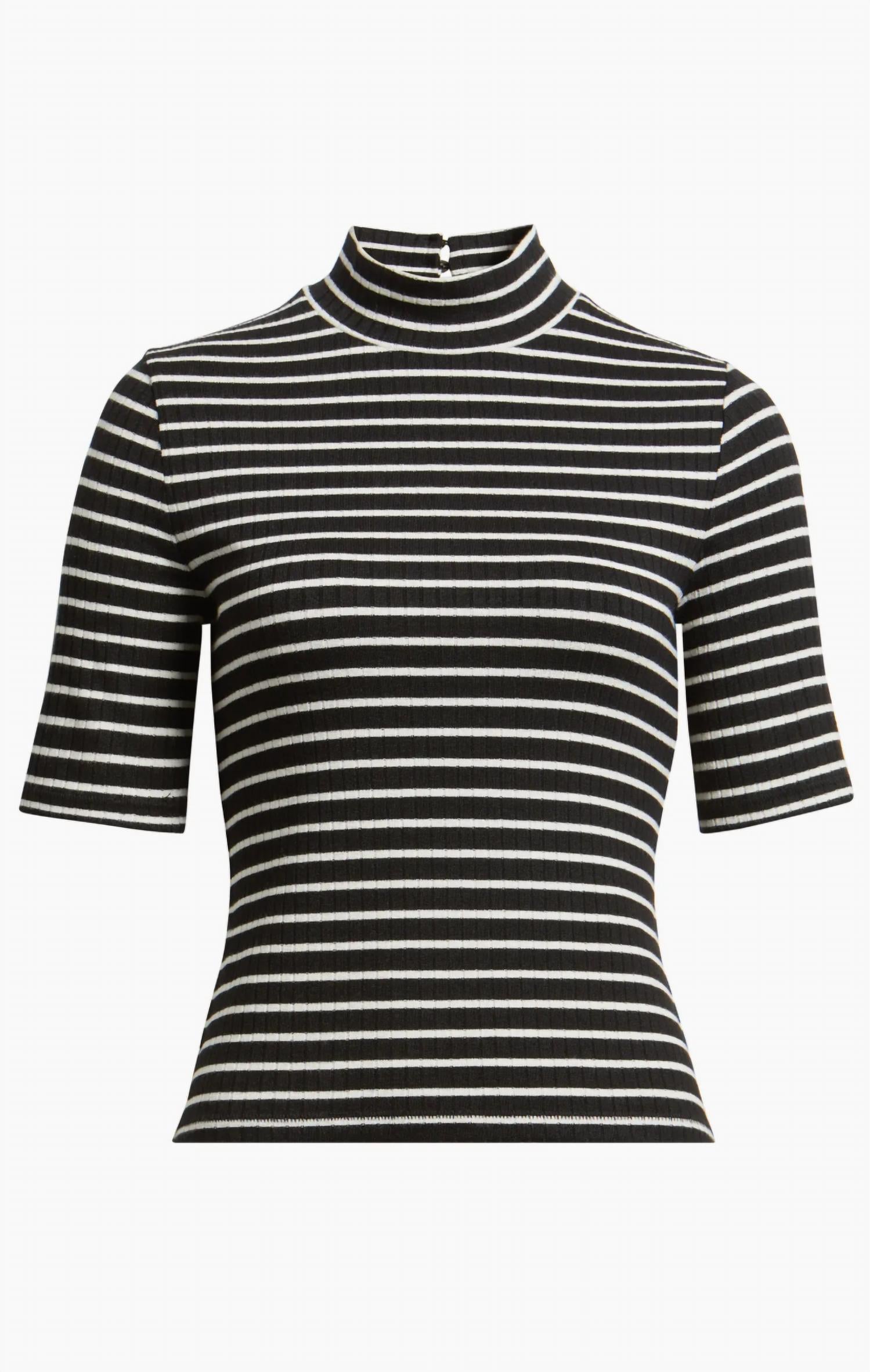 Look no further, you just found your perfect tee! Discover the Knit Stripe Rib Tee Top by Rag & Bone for an effortlessly chic and modern addition to your wardrobe. With its mock turtleneck and short sleeves, this top offers a body-skimming ribbed finish in lively stripes. Composition: 48% Rayon, 48% Polyester, 4% Spandex. Garment Length: 20.75 inches. Closure: Back button closure. Care: Machine wash, tumble dry.