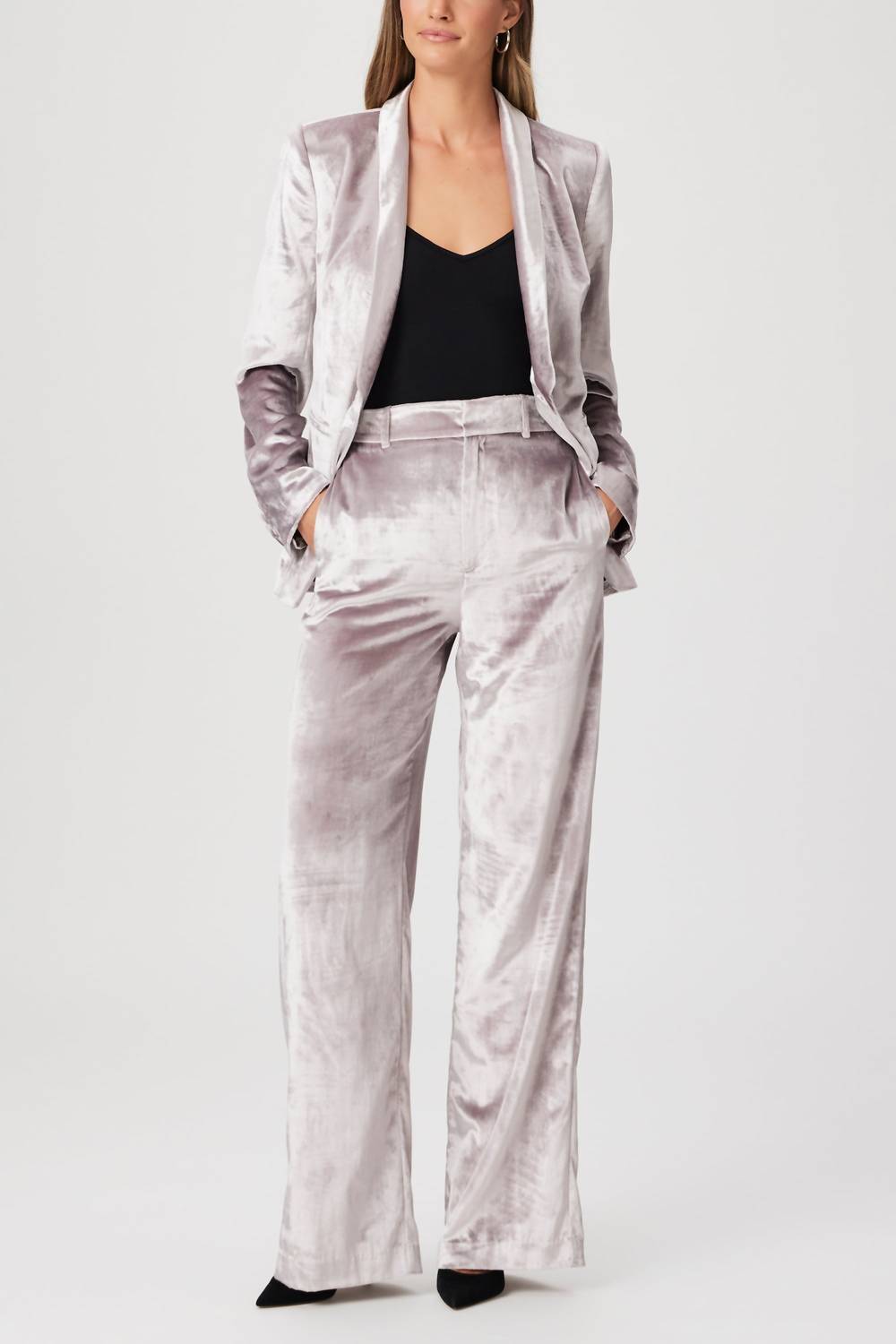 The Chateau Velvet Pant by Paige offers a luxurious take on the wide-leg trend, crafted in rich pewter-colored velvet for a relaxed fit. Featuring a high waist and designed with belt loops, these pants provide practical side-seam and back welt pockets. Made from 76% viscose and 24% nylon, they ensure a smooth and elegant silhouette. Closure details include a concealed zip fly with a hook-and-bar closure, and they are finished with a button closure. Care: Dry clean. Imported.