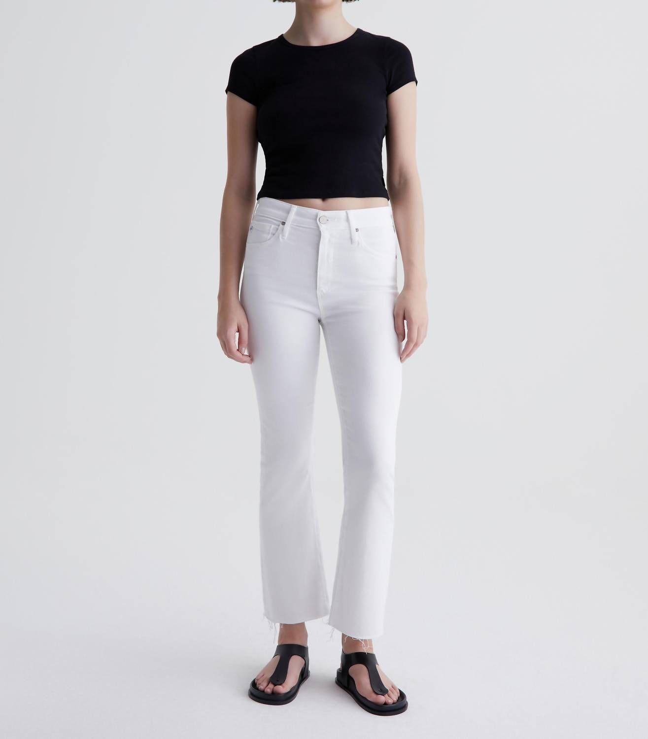 A boot-cut jean that not only looks good on, you'll be comfortable in them all day. Introducing the Farrah Boot Mid Rise Jeans by AG Jeans, a chic choice in Modern White tailored for a sophisticated streetwear look. These women's bootcut jeans offer a mid-rise silhouette with a regular fit and feature a skinny fit through the leg, flaring into a subtly flared raw hem. Crafted from a luxurious blend of 56% Cotton, 19% Modal, 18% Lyocell, 6% Polyester, and 1% Elastane, these jeans include AG's Cloud Soft Denimâ„¢ for exceptional comfort and a velvety finish. Dimensions: Front rise 10", knee opening 14", bottom opening 18.5", and inseam 28". Closure: Zip closure. Care: Machine wash, tumble dry.