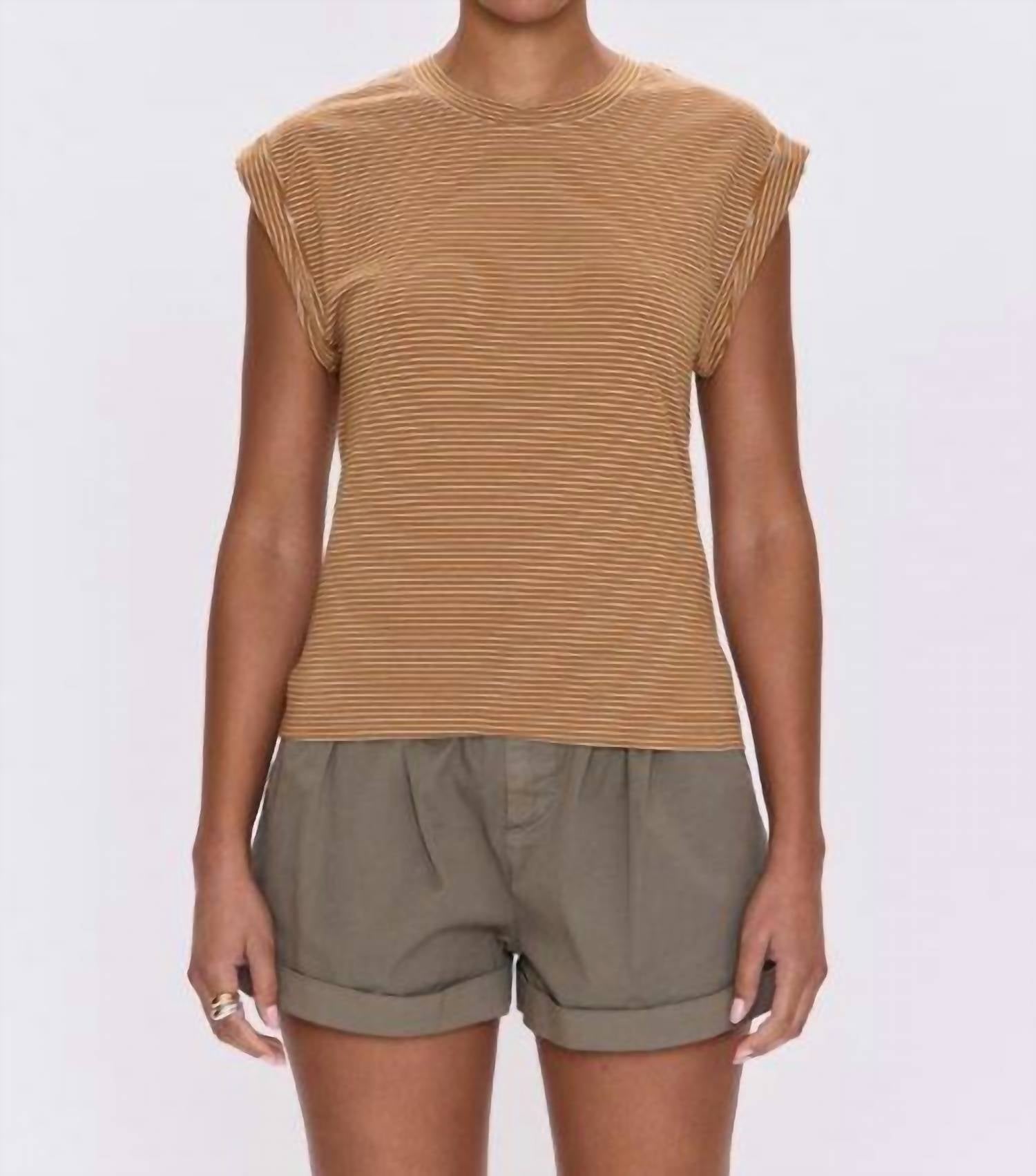 This classic, short sleeve tee will be your go-to staple this season and beyond. Discover the Olivia Tee by PISTOLA, an essential addition to your wardrobe in a striking Dark Rum hue. Designed for comfort, this short-sleeve piece features cap sleeves and a flattering crewneck, crafted from a soft and stretchy cotton blend. Incorporating a chic stripe pattern, this pull-on tee is perfect for any workwear occasion. To maintain its look, simply machine wash and tumble dry.