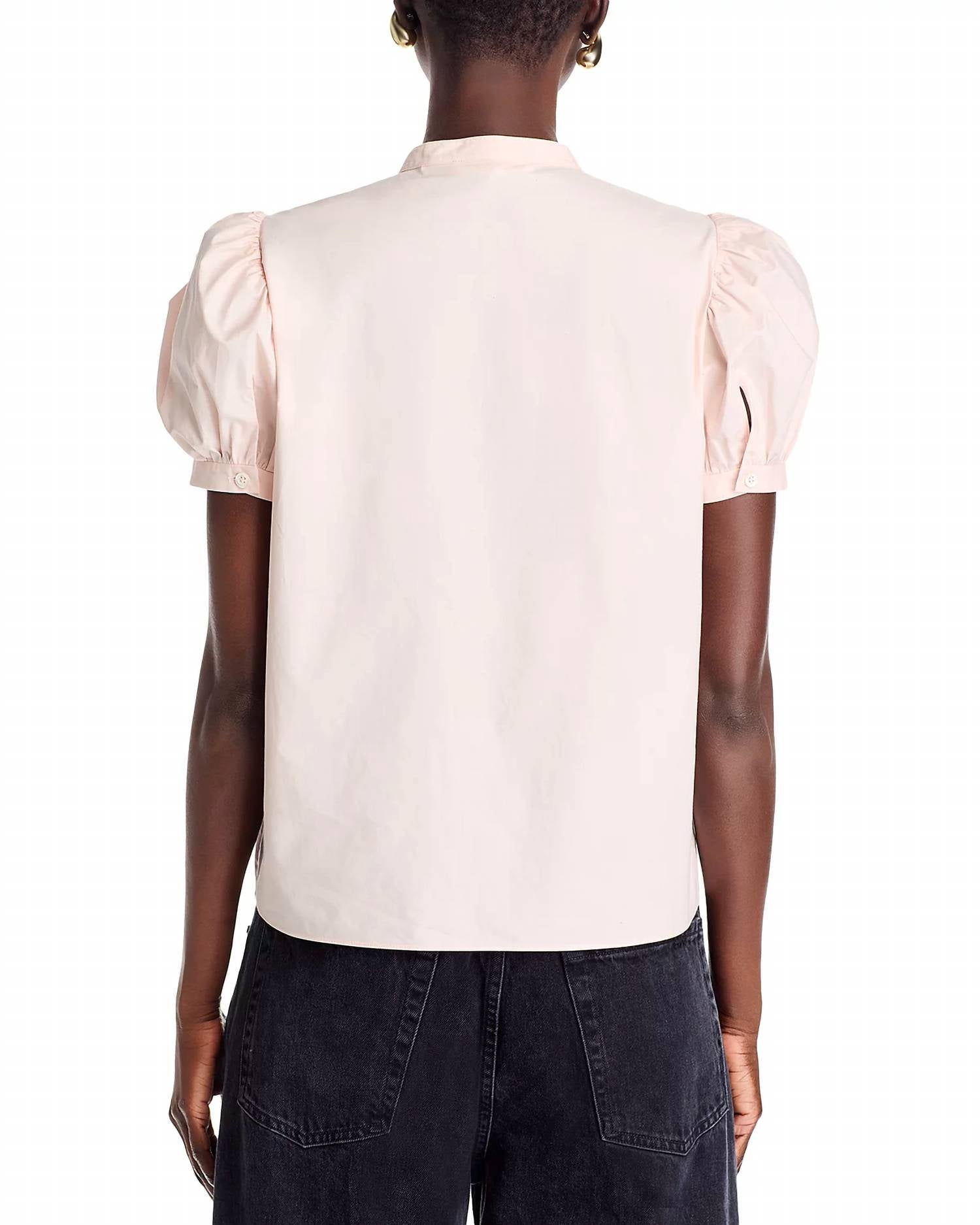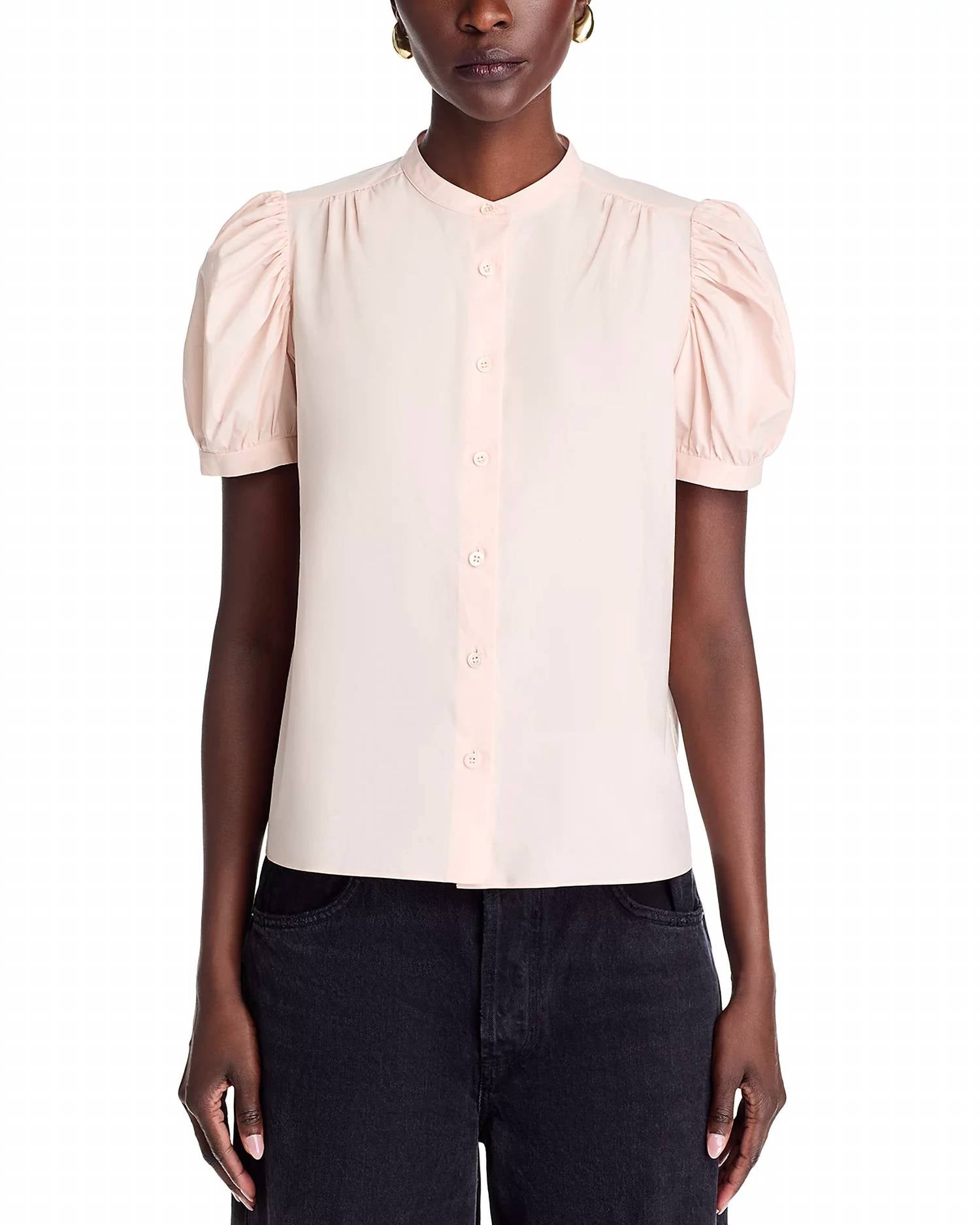 A classic button down shirt that will never go out of style. Introducing the Women's Gathered Top by FRAME, an epitome of feminine elegance in light pink. This stylish top features short puff sleeves and gathered detailing, complemented by a polished stand collar. Made from 100% organic cotton, it is 24" long from the shoulder and offers a comfortable, breathable fit. Closure: Button closure. Care: Machine wash cold.