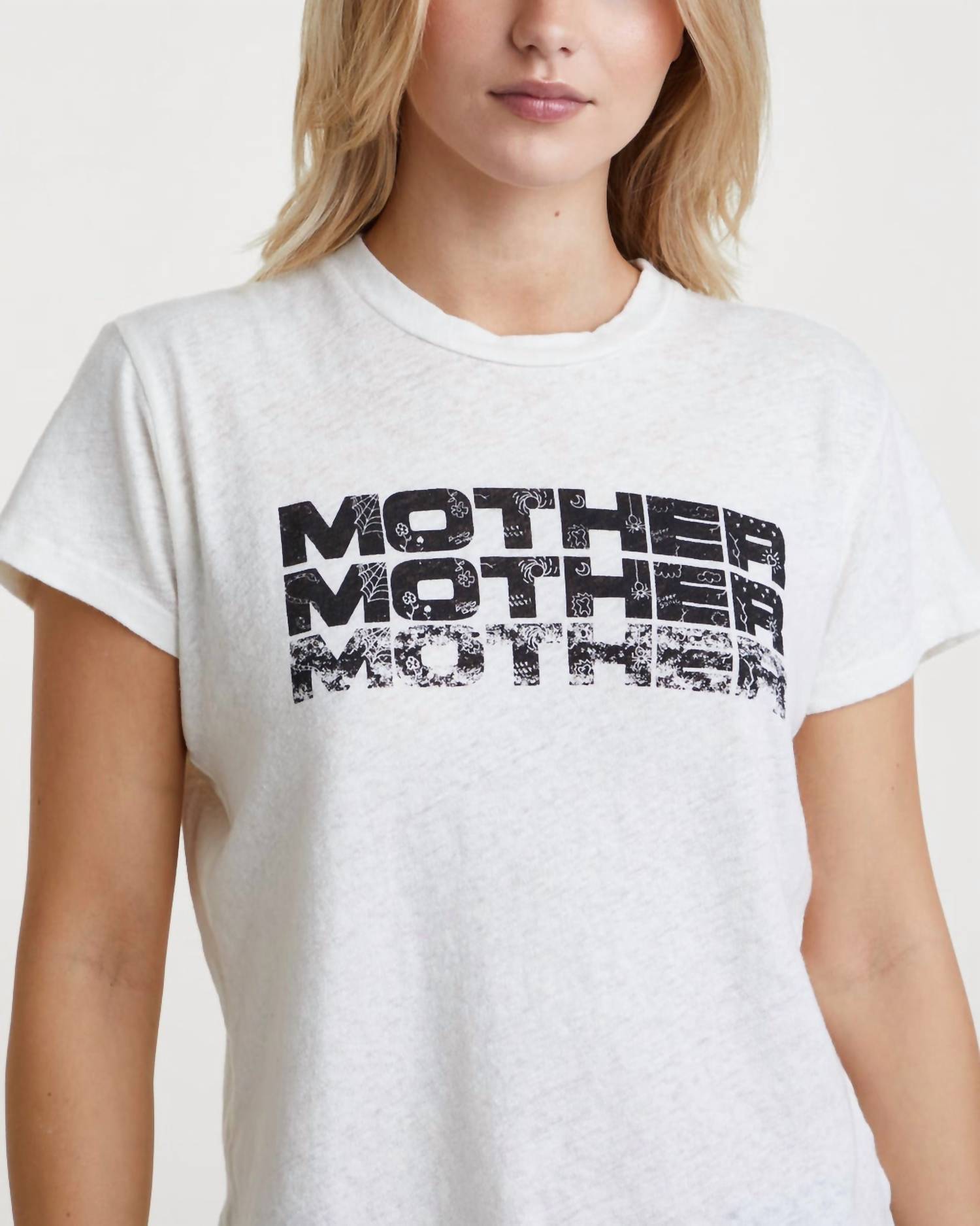 Look no further, you just found your perfect tee! Introducing the Sinful Tee by Mother, a short sleeve t-shirt in pristine white that offers a slim fit with a vintage touch. It's crafted from a cotton and linen blend (50% Cotton 50% Linen), featuring a graphic pattern with MOTHER's name elegantly printed across the chest. This knitted tee is designed with a classic crewneck neckline and provides easy pull-on closure. Care: Machine wash for effortless maintenance.
