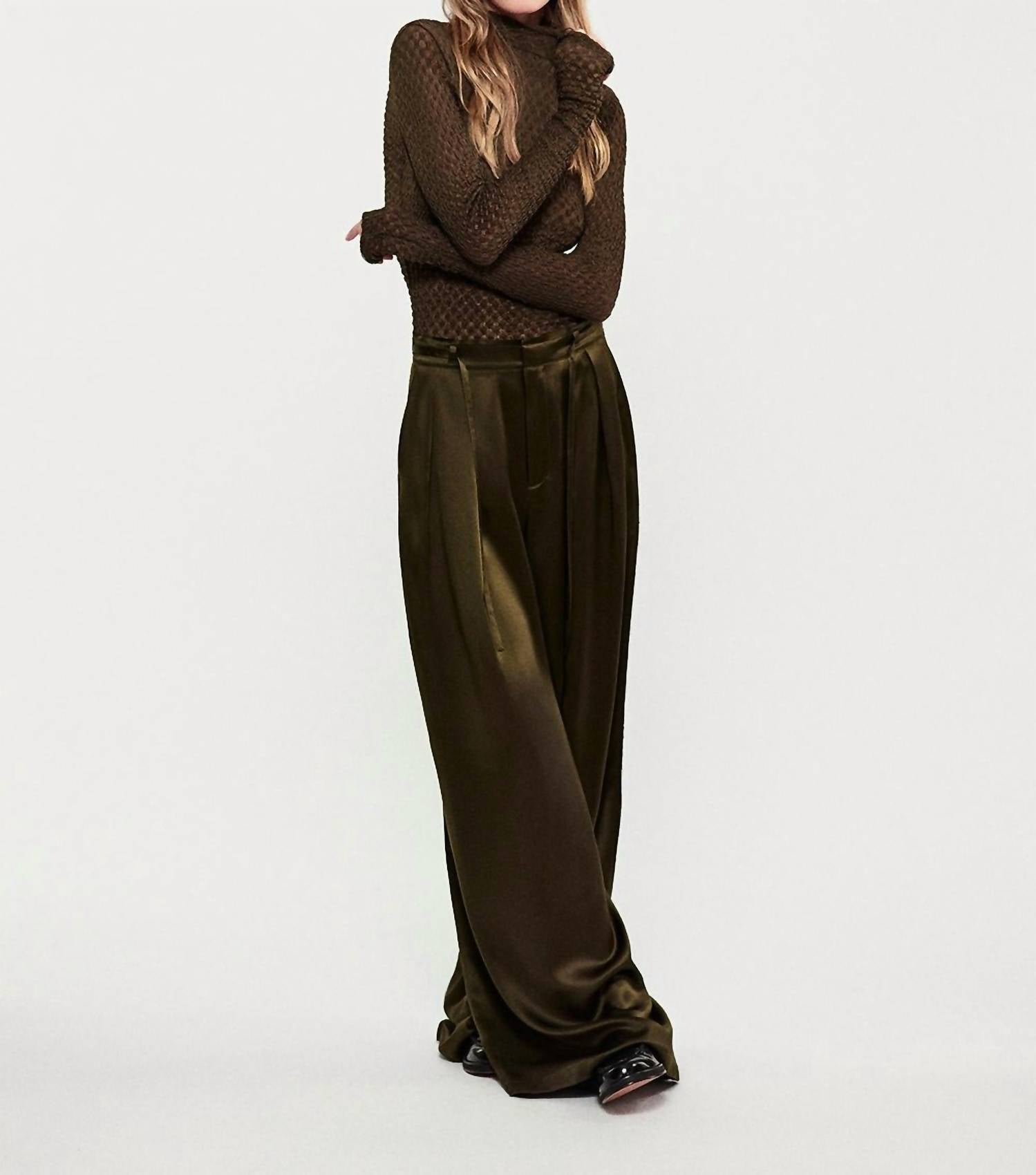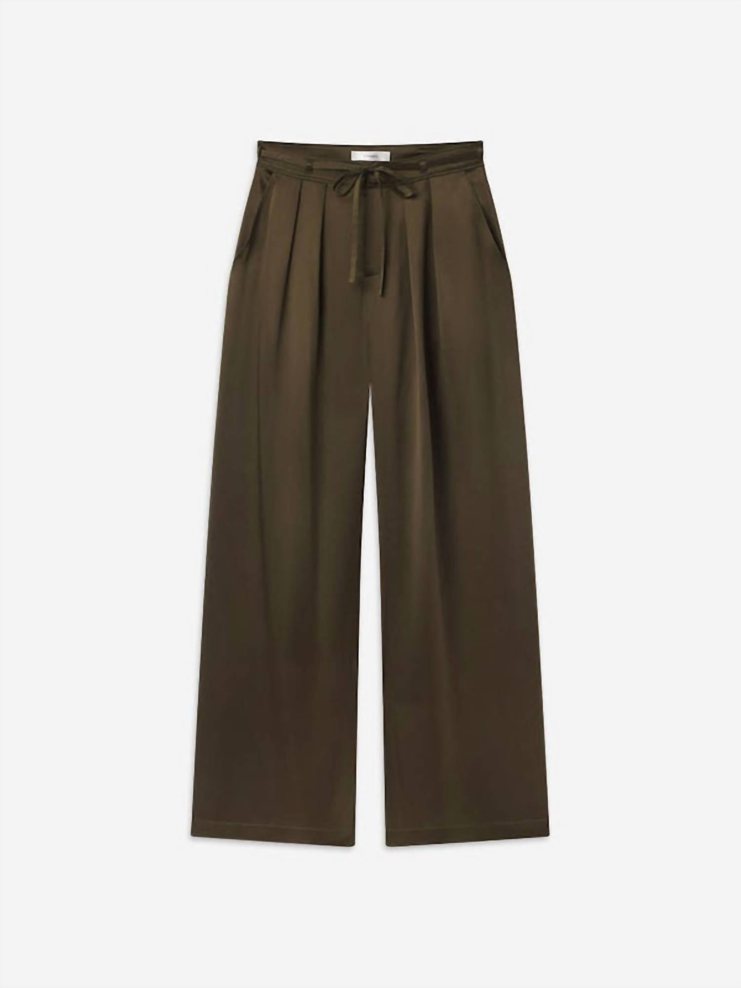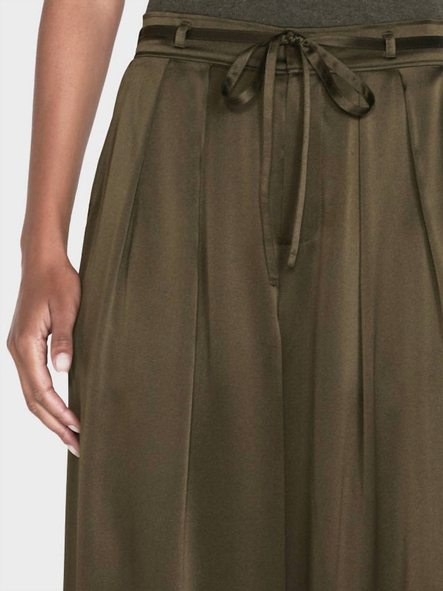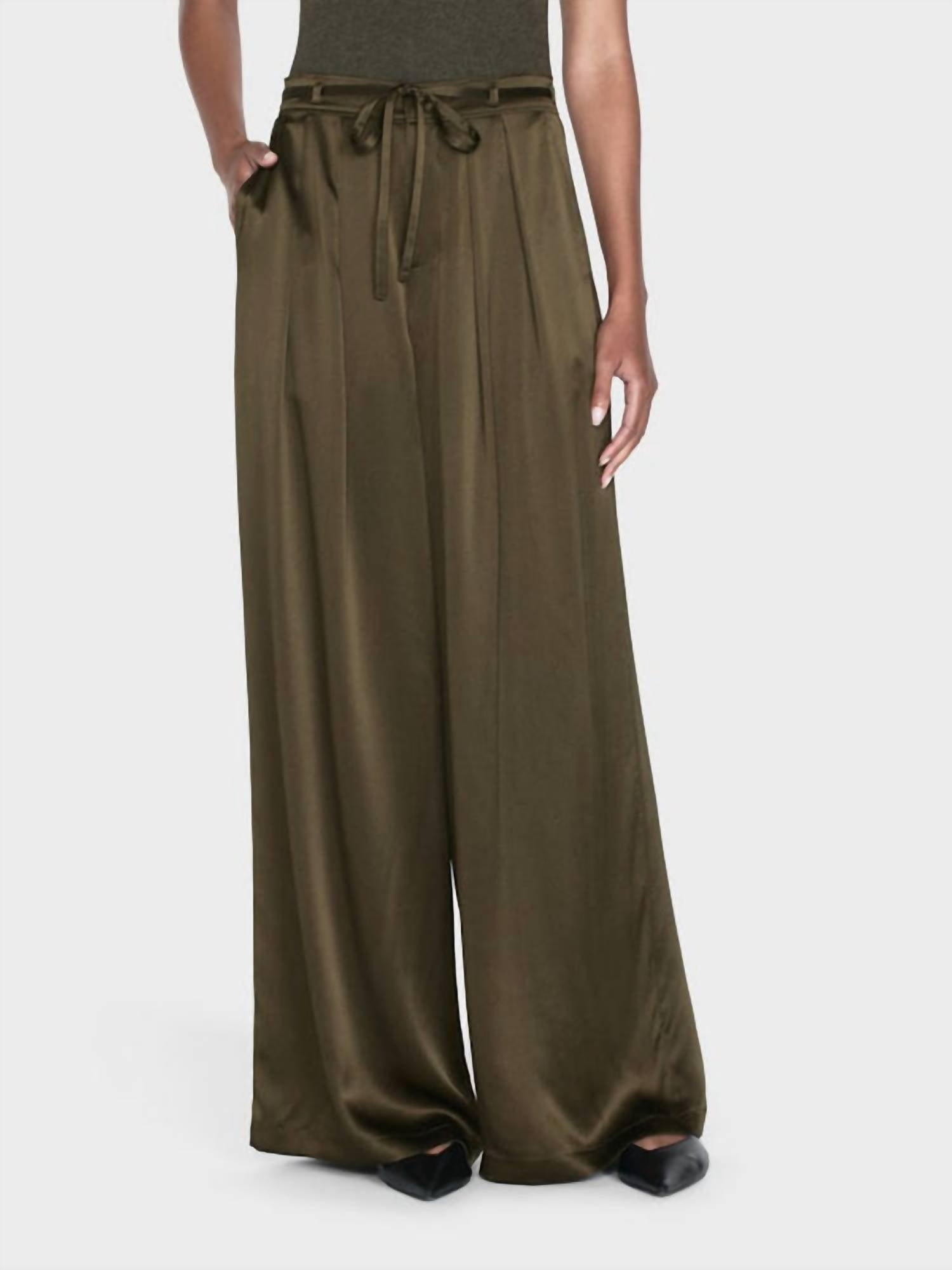 Elevate your wardrobe with the Long Silk Trouser by FRAME in Rich Military, crafted from 100% silk for luxurious comfort. These high-rise, wide-leg trousers offer a relaxed fit with front center pleats, side, and back pockets, creating a dramatic silhouette. A skinny waist tie provides an adjustable fit, complemented by a 13.25" front rise, 32" inseam, and 28.5" leg opening. Care: Dry clean only.