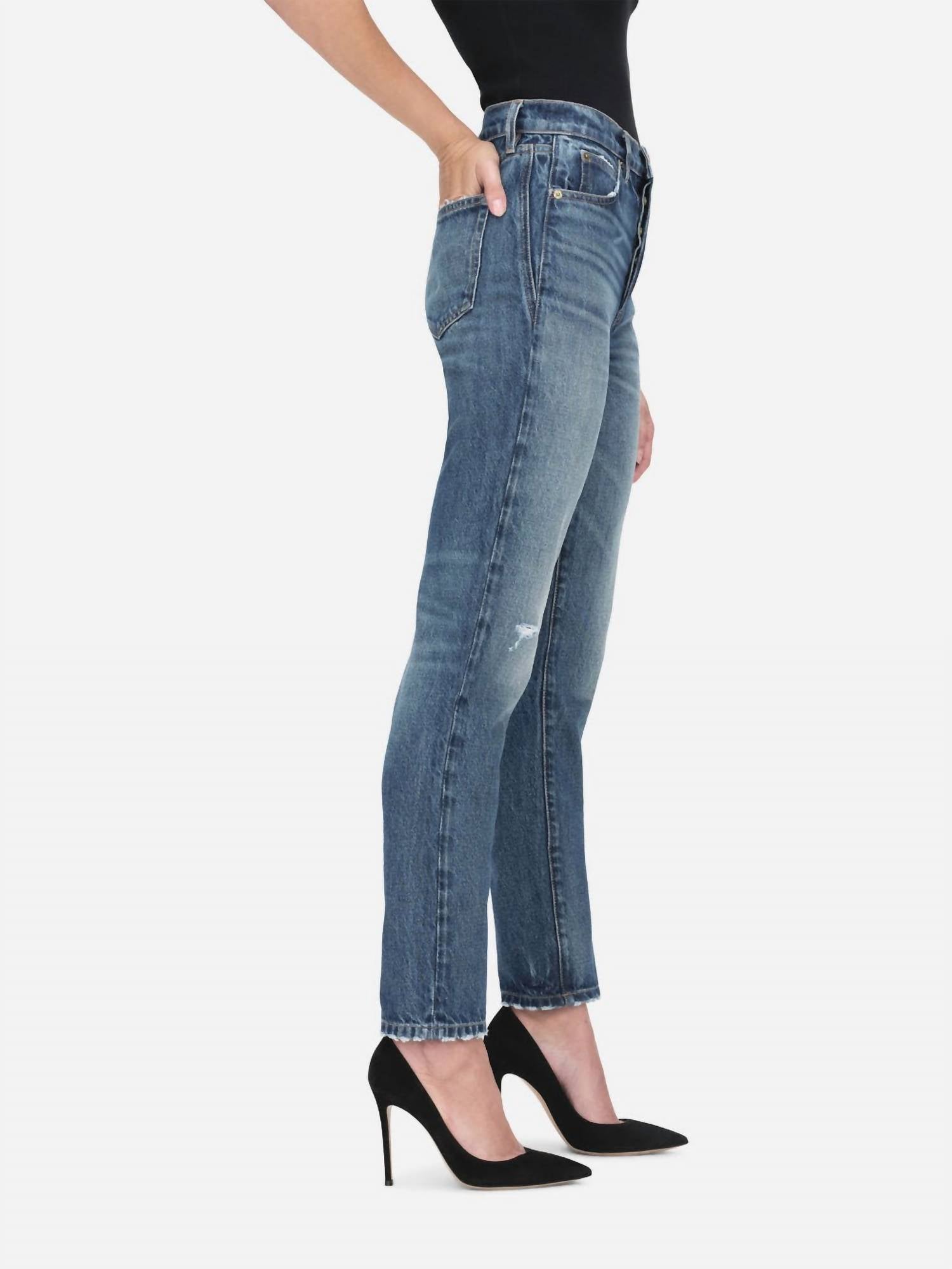 This classic straight leg jean has a perfect fit and goes with just about everything. Embrace effortless style with the Women's Malibu Le Mec Jeans by FRAME, a staple in any wardrobe. These boyish jeans in a medium blue textured denim feature a relaxed waist that falls straight through the hip, with a straight leg subtly tapering to a flattering ankle-length inseam. Crafted from a sustainable cotton blend, they offer an 11.75" rise, 28" inseam, and 14" leg opening, with a practical zip closure and functional pockets. These jeans embody both comfort and eco-conscious fashion, perfect for streetwear and vacation looks.