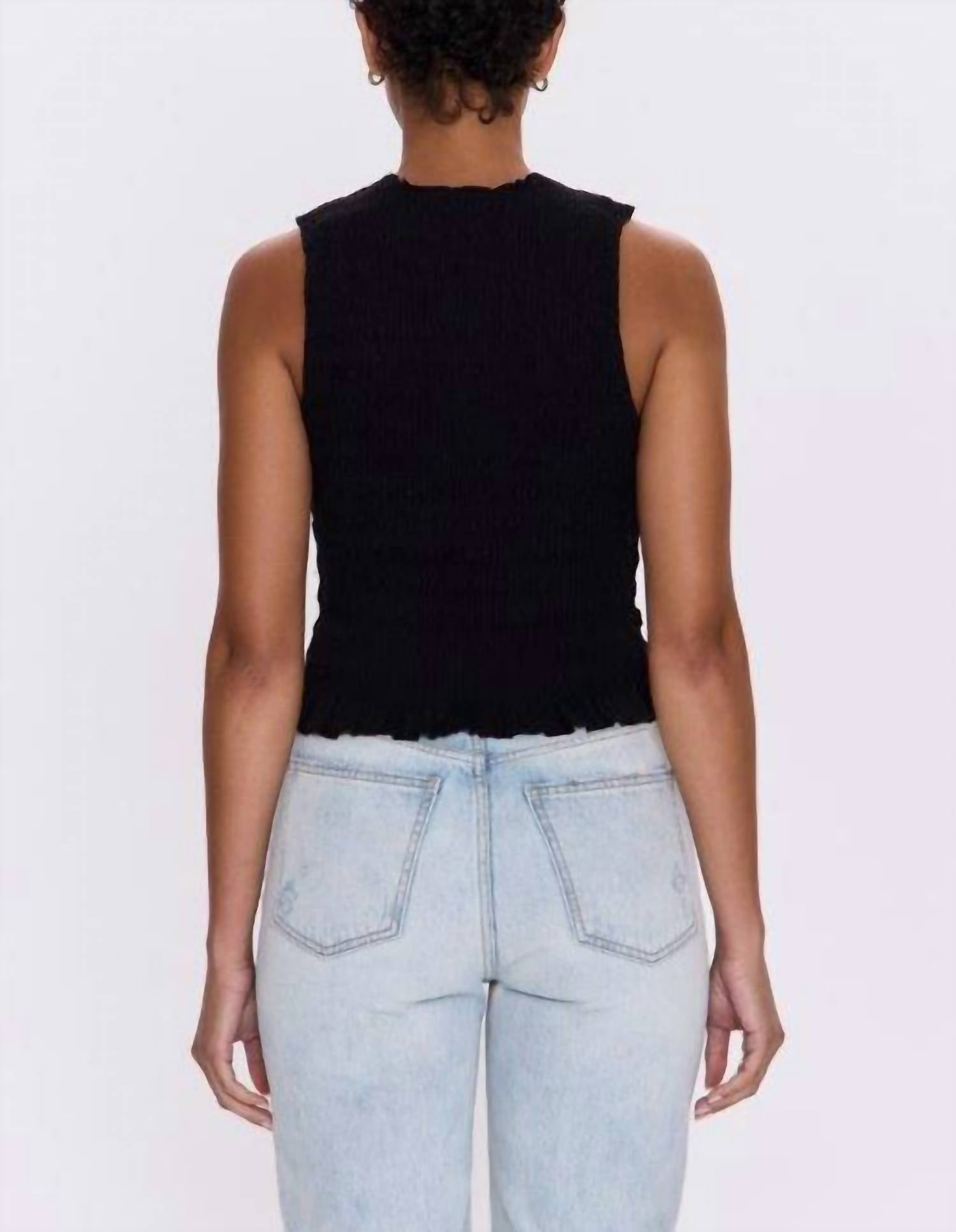Fit, fabric and functionality. This tank top checks all the boxes. Introducing the Phoebe Smocked Tank Top by PISTOLA, a chic and minimalist piece in noir, perfect for effortless spring style. This sleeveless top features a crewneck design with a textured pattern, offering a flattering and supportive fit with all-over smocking. Crafted from a 97% cotton and 3% spandex blend, this 20" garment is imported and ideal for travel and Mother's Day occasions. Closure is a pull-on style, and it is easy to care for with machine wash instructions.