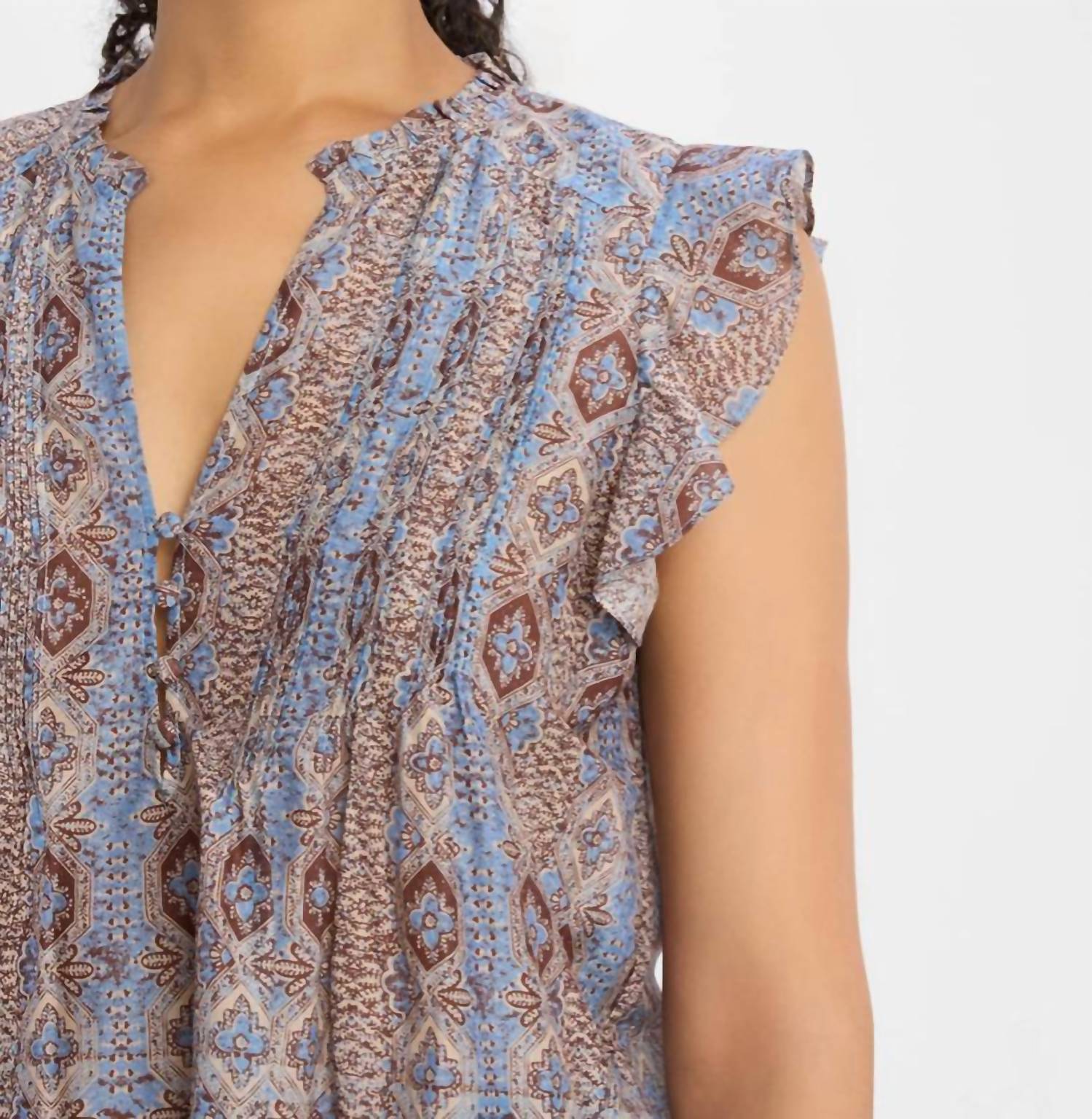 A classic button down shirt that will never go out of style. Introducing the Idris Flutter-Sleeve Top by Paige, a stylish blend of cotton and silk in a captivating Slate Blue Multi print. This sleeveless top showcases a flattering V-neckline and a button closure for easy wear. Designed with a classic fit, the hem elegantly falls to the hip, adding a versatile touch to any wardrobe.