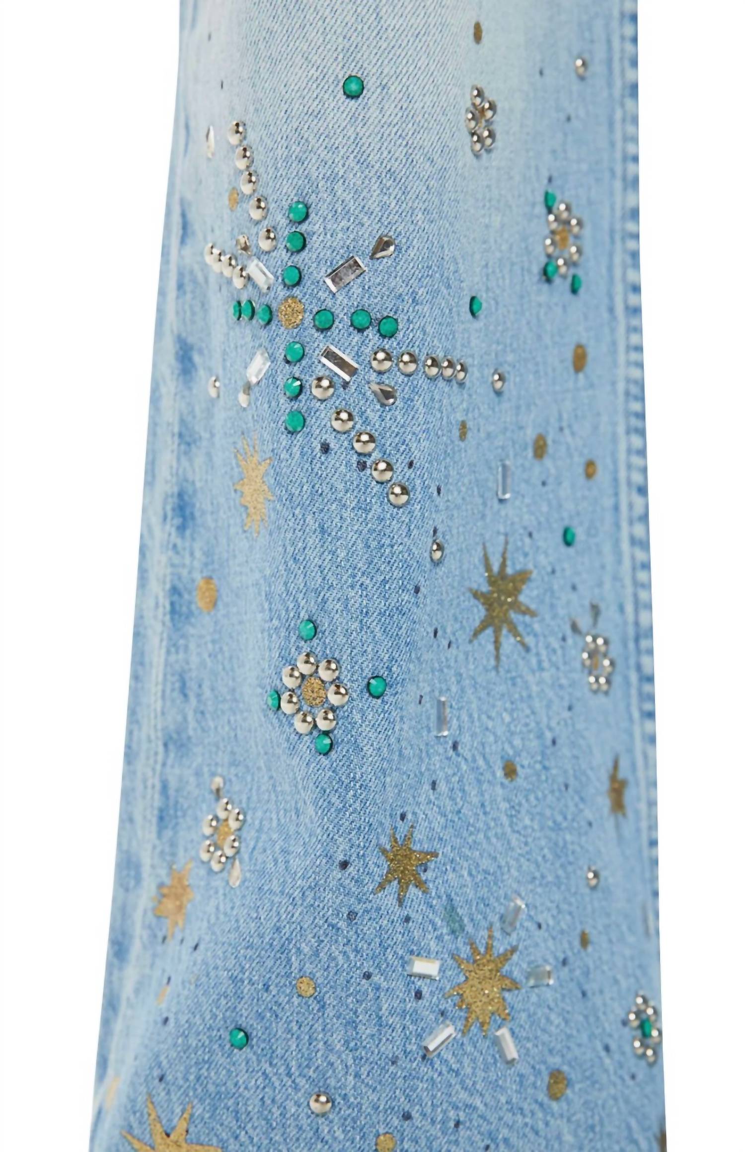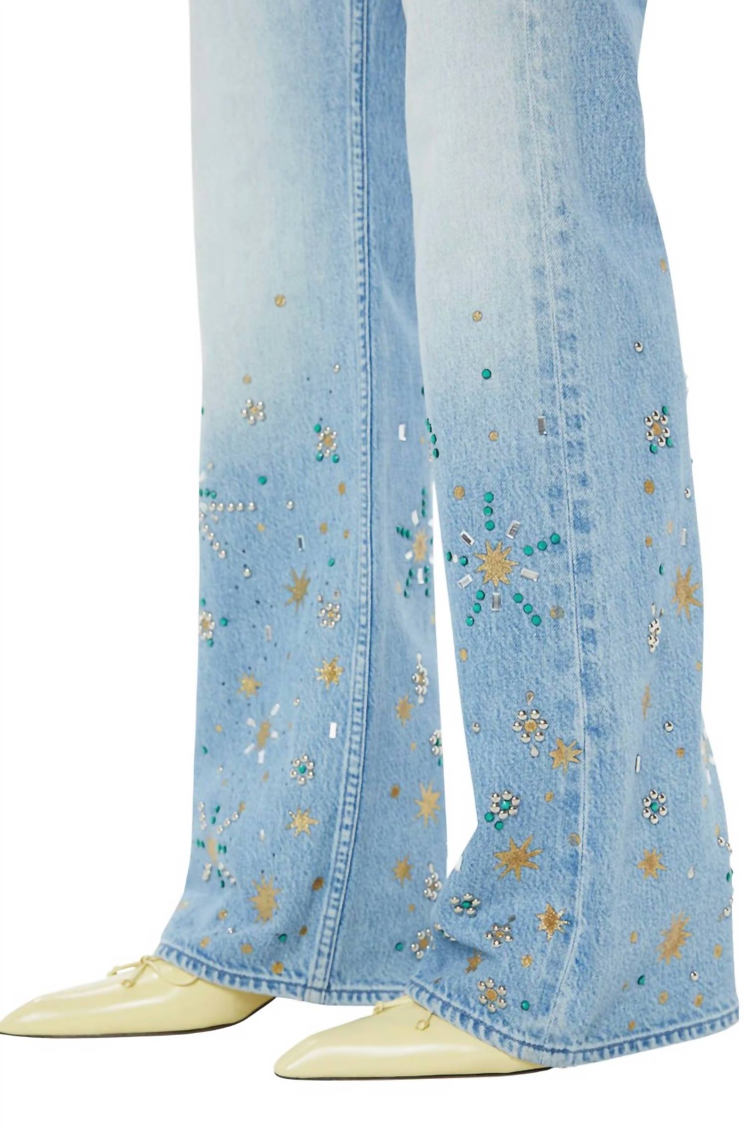 A boot-cut jean that not only looks good on, you'll be comfortable in them all day. Meet the Bookie Heel Bootcut Jeans by Mother, a statement piece in the Righteous Gemstone shade. These high-rise jeans offer a relaxed fit with a 34-inch inseam, complemented by a bootcut leg and a 20-inch leg opening. Crafted in the USA from premium nonstretch denim, these jeans boast a 10-inch front rise and intricate embellishments including crystals and studs for that vintage flair. Made from 100% cotton, they feature classic five-pocket styling with a zip fly and button closure, and are machine washable with tumble dry ease.