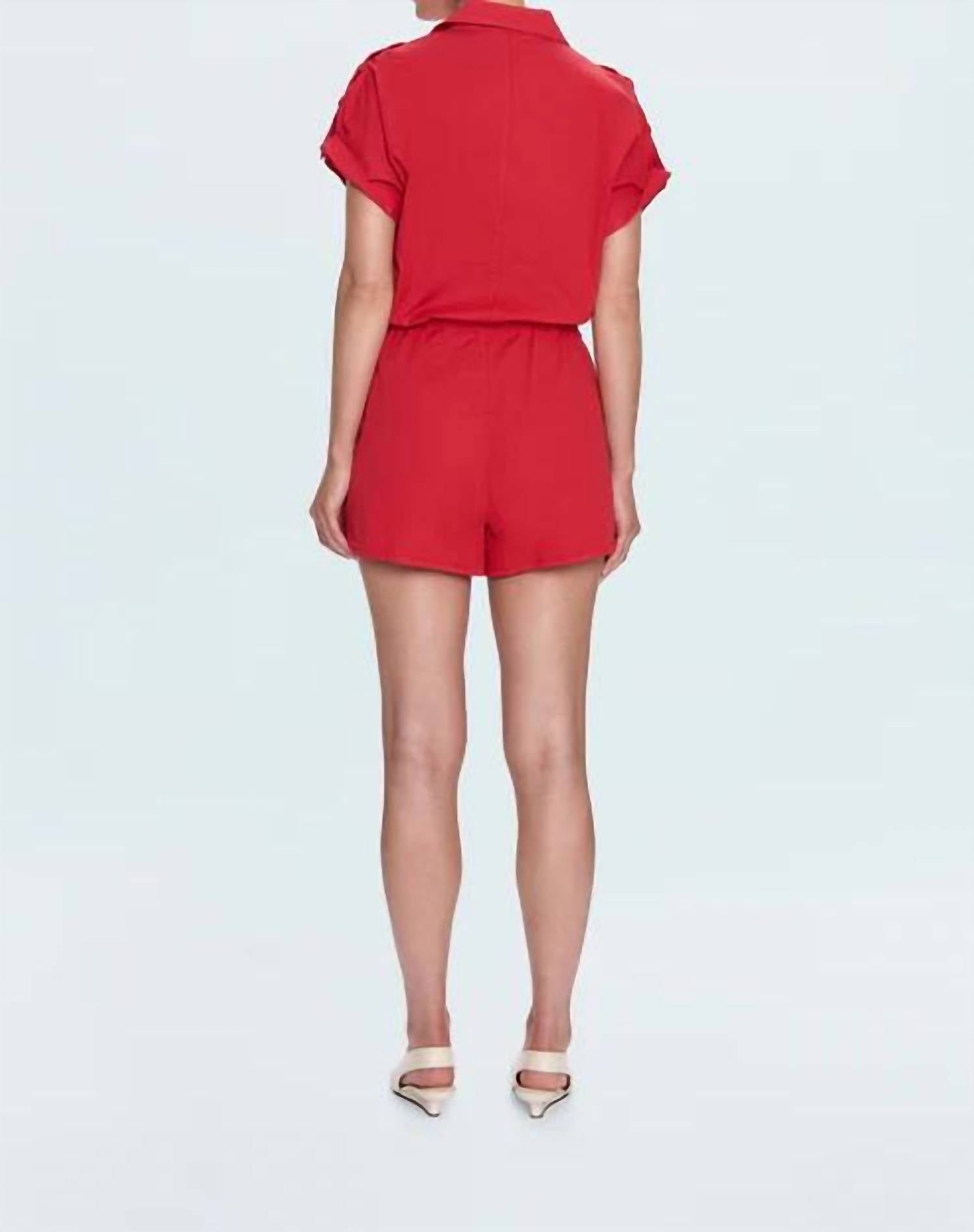 Throw it on and go! Discover the Meg Zip Front Romper by PISTOLA, a stylish field suit short perfect for minimalist fashion lovers. Designed in a vibrant Ruby hue, this solid-colored romper is crafted from a comfortable 98% Cotton / 2% Spandex, featuring epaulettes and a functional drawstring at the waist for a customizable fit. Complete with a convenient zip closure and handy pockets, it's the ultimate easygoing spring attire for any holiday party or vacation getaway.