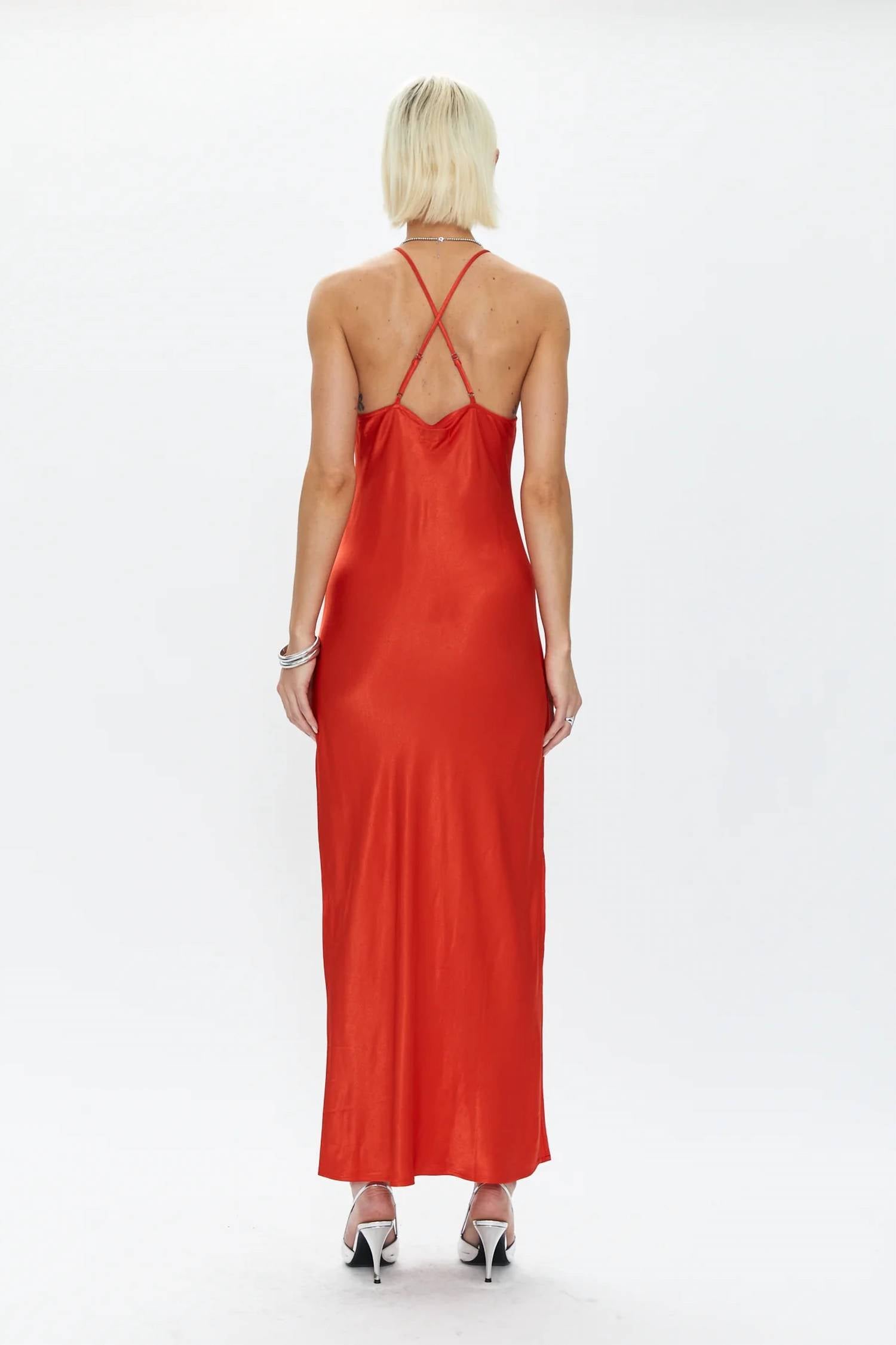 A midi dress so versatile, your options for wearing it are endless. Effortless sophistication in stunning poppy red. Sleeveless slip dress. Features a high neck with elegant criss-cross adjustable straps and a side slit above the knee for graceful movement. Crafted from a luxurious blend of 57% Rayon and 43% Viscose. Midi-length dress measures 58.5 inches. Closure is a simple pull-on design. For maintenance, the dress is machine washable.