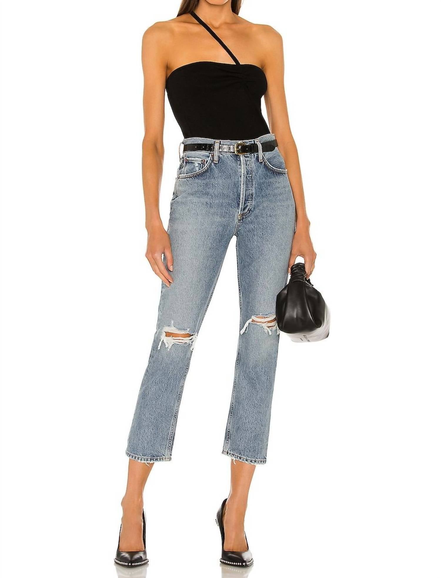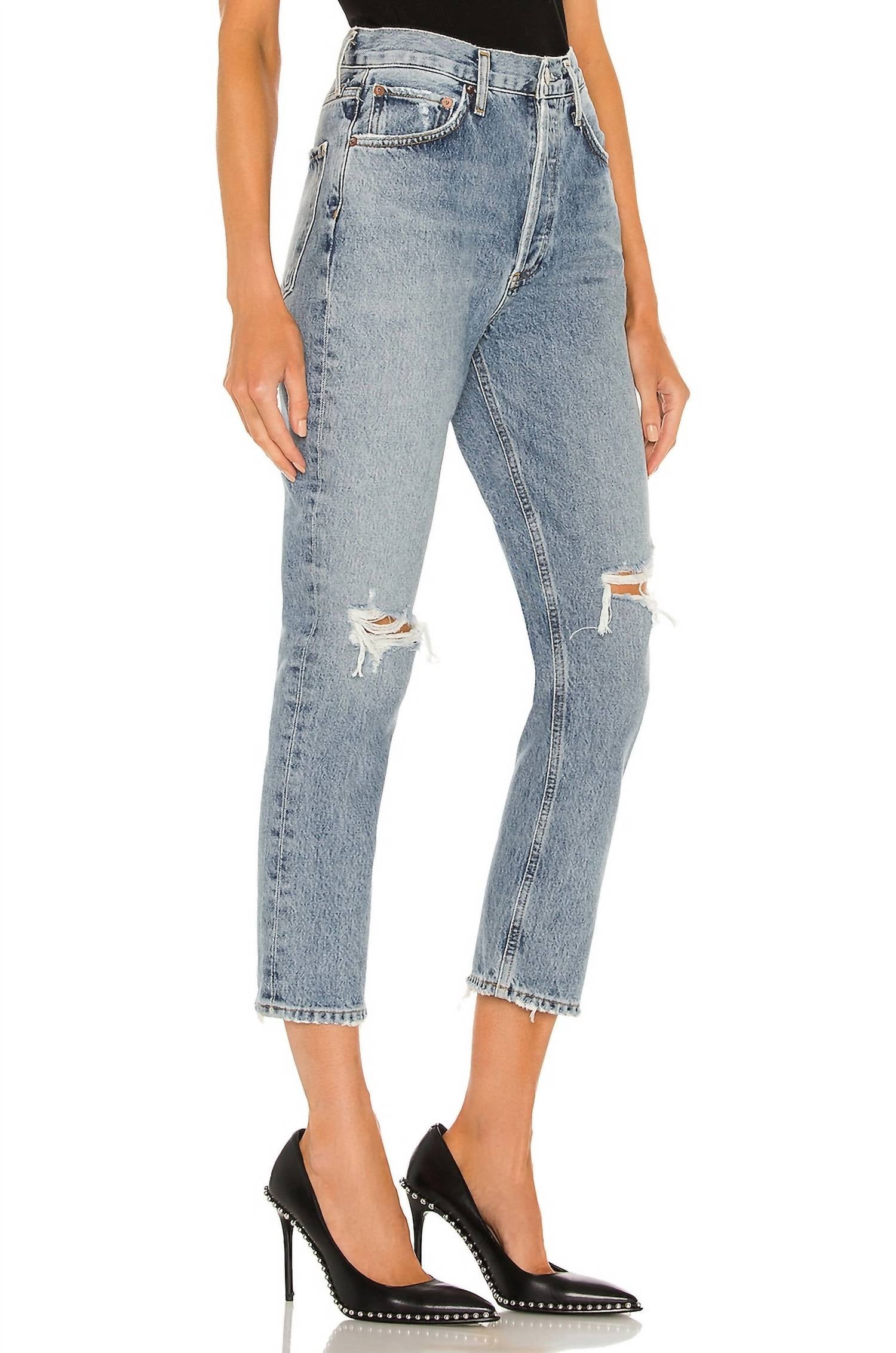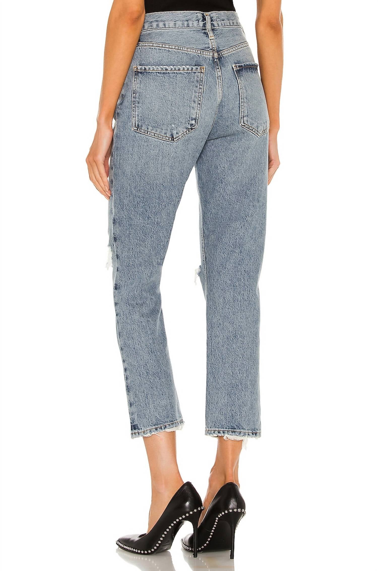The perfect cropped jean for those transitional seasons. Meet the Riley High Rise Crop jeans by AGOLDE, a perfect blend of style and comfort in the color Escalate. These denim jeans feature a timeless high rise and straight leg design, making them a streetwear staple for any occasion. Crafted from 100% organic cotton, they offer a non-stretch, vintage casted medium indigo look with a flattering fit. The button fly closure ensures ease of wear, while the cropped 26" inseam and 14" leg opening provide a versatile silhouette. Care for these jeans is simple with machine wash instructions. Model is 5'10" and wearing a Size 27.