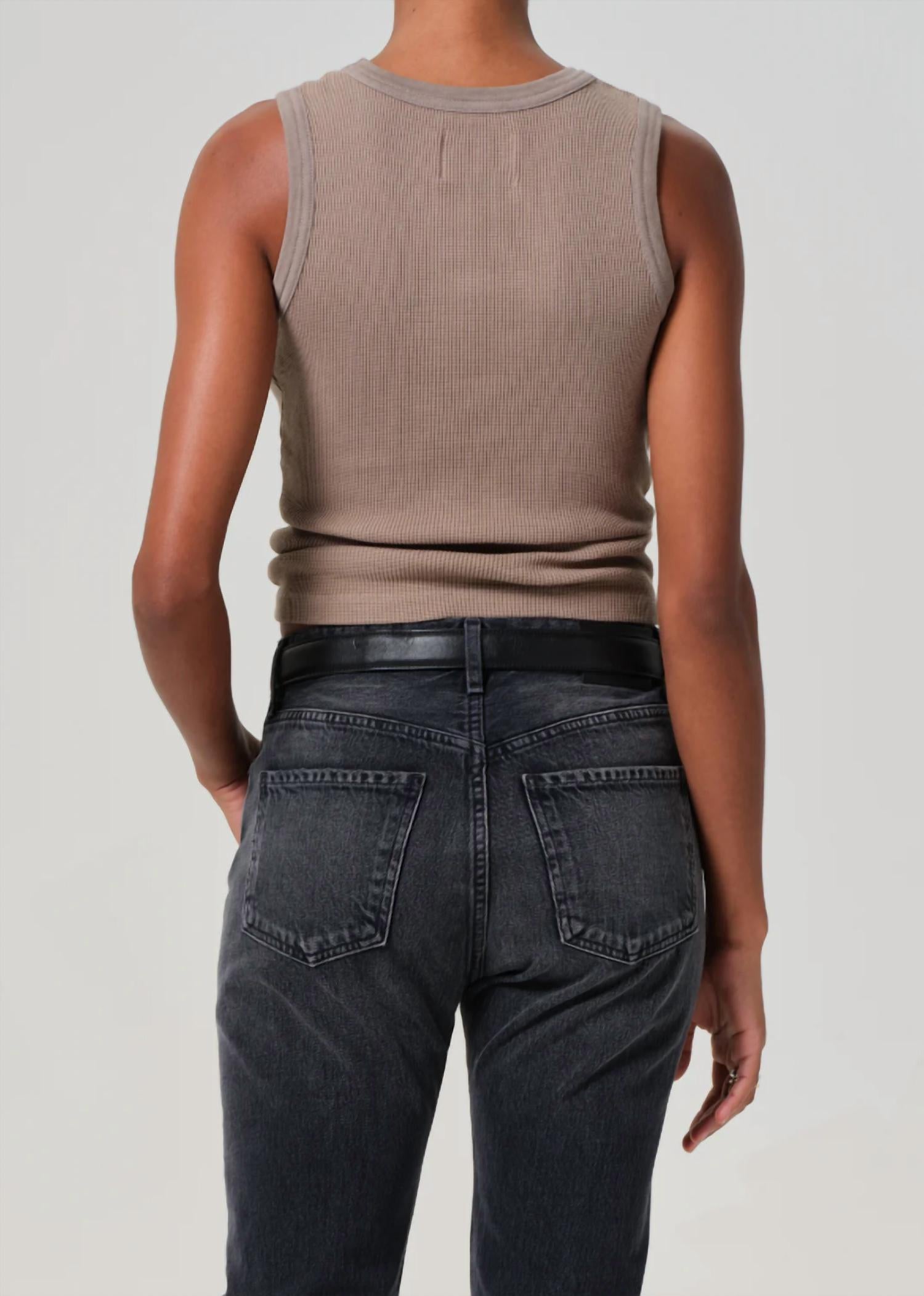This classic, short sleeve tee will be your go-to staple this season and beyond. Introducing the Inez Waffle Tank by Citizens of Humanity, a versatile choice for summer camping adventures or minimalist style statements. This sleeveless tank in medium olive green offers comfort in 100% cotton with a soft waffle thermal texture that adapts to your movements. Length: Regular. Closure: Pull-on style. Care: Machine wash. Model is 5'10" and wears a size small, making this piece a perfect fit for layering or wearing solo.
