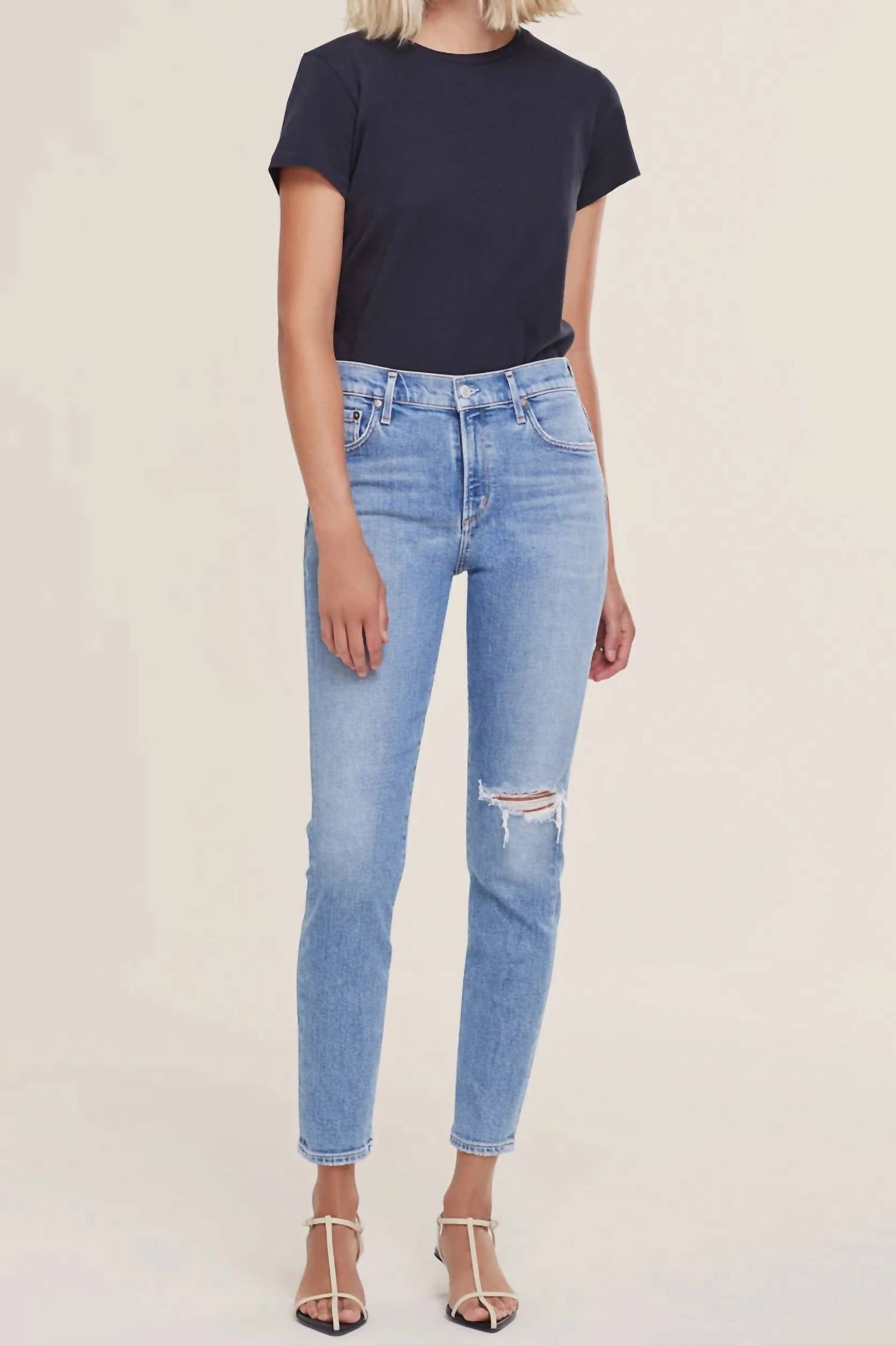 A skinny jean that is both flatering and comfortable. We love this style because it works great with boots, or without! Experience the Sophie Mid Rise Skinny Jeans by AGOLDE, offering a timeless skinny fit that curves and elongates the legs effortlessly. Crafted from a super-stretch denim blend of 90% Cotton, 6% Recycled Cotton, 3% Polyester, and 1% Elastane, these jeans are perfect for the fashion-forward. With a practical mid-rise of 9 3/4", a leg-opening of 10", and a 28" inseam, these jeans are a streetwear staple in a light indigo wash with distressing. Closure: Zip fly. Care: Machine wash, tumble dry.