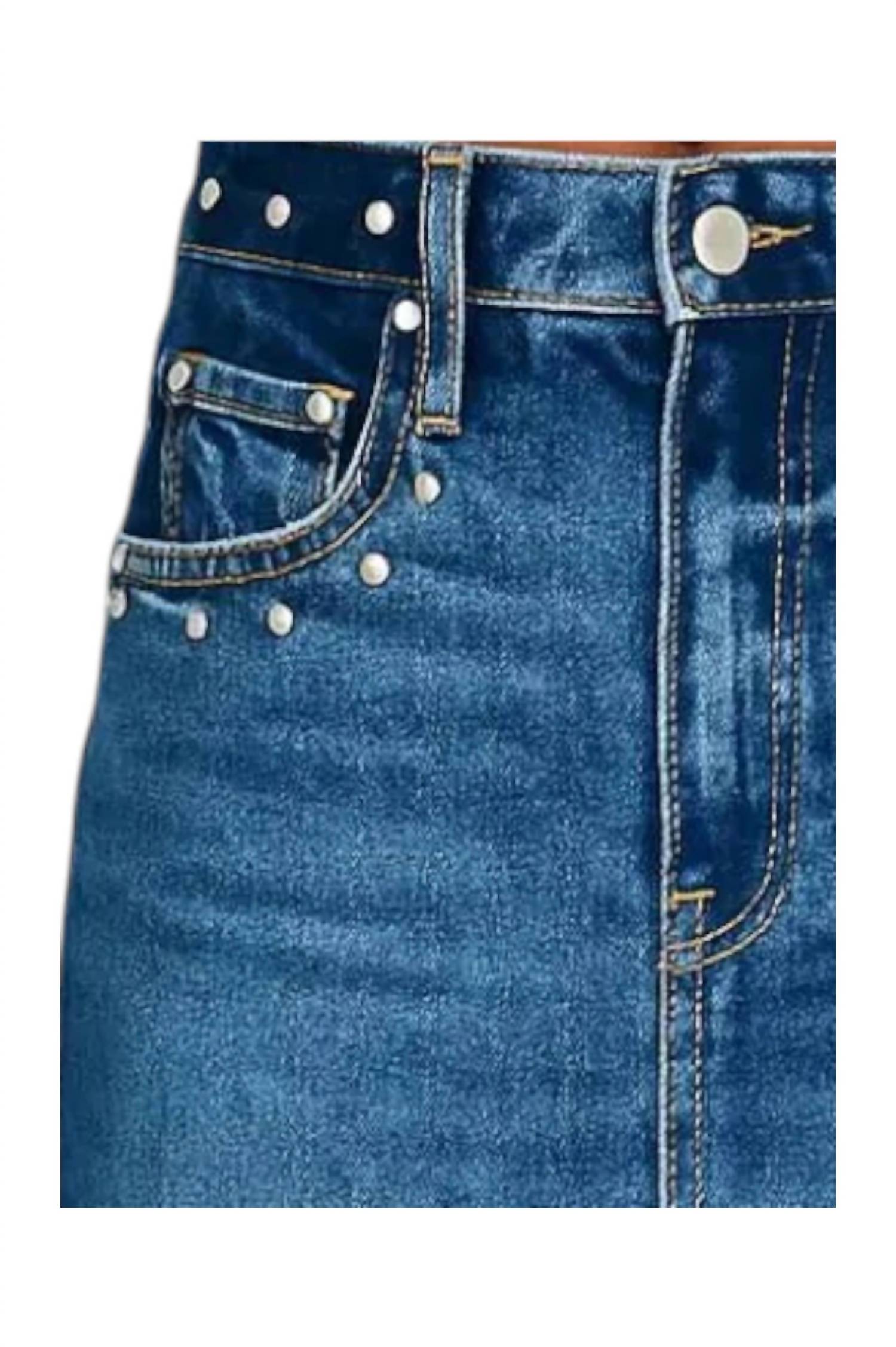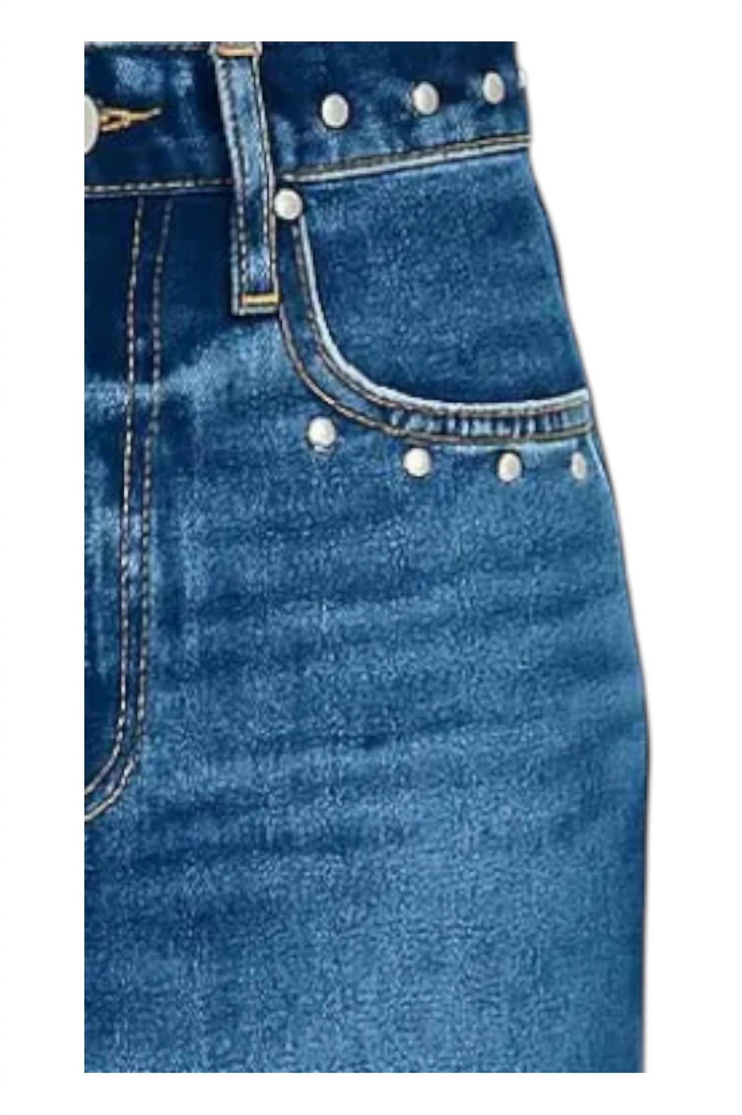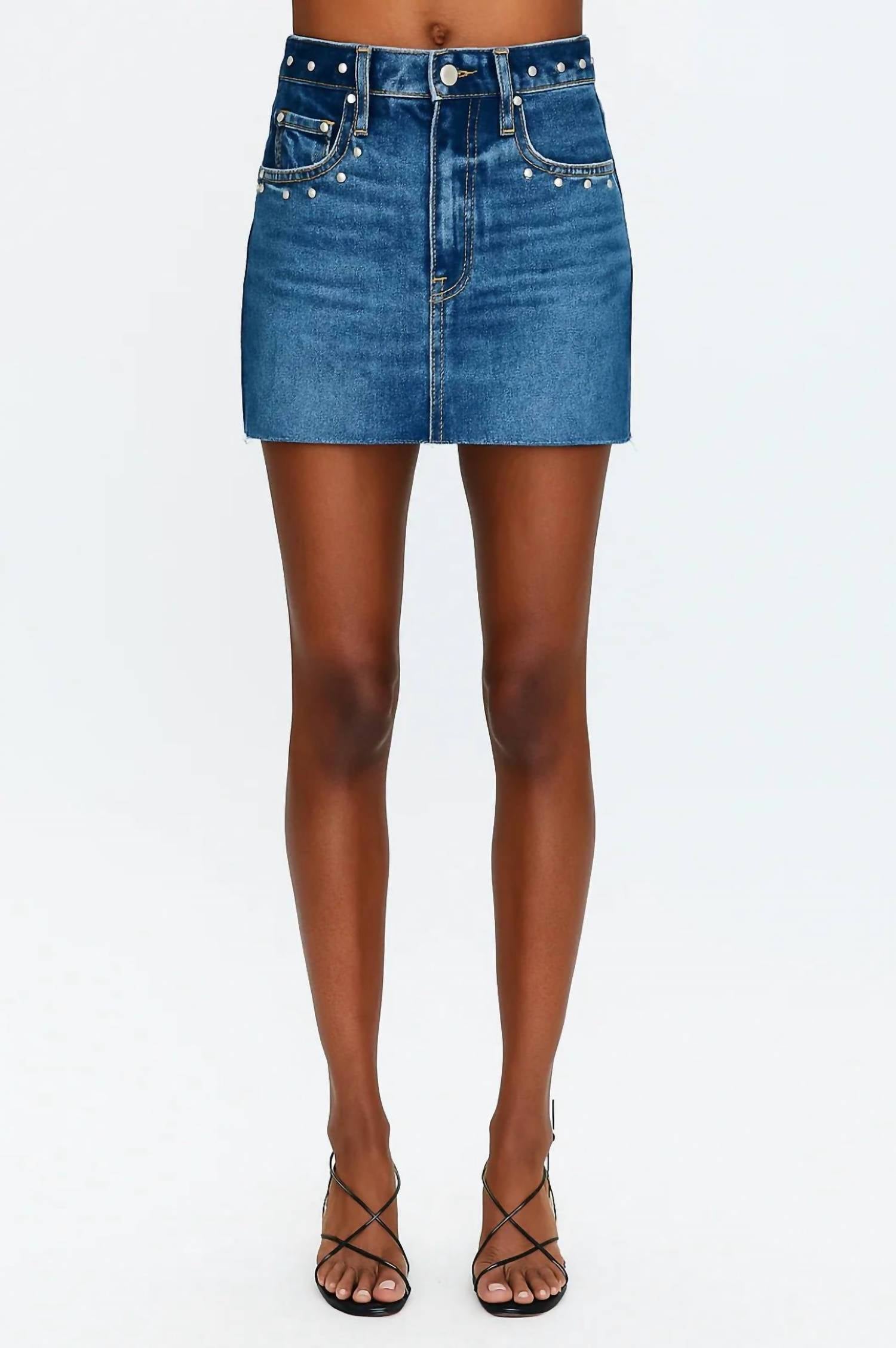 The perfect mini skirt does exist. Introducing the Skye Mini Skirt by PISTOLA, a standout piece in blue that's perfect for the summer season. Crafted from medium wash denim, this high-rise, mini-length skirt features chic silver stud embellishments along the waistband and pockets. The practical five-pocket design is complemented by a secure button and zip closure, ideal for versatile styling from day to night. Easy to care for, simply machine wash and tumble dry.