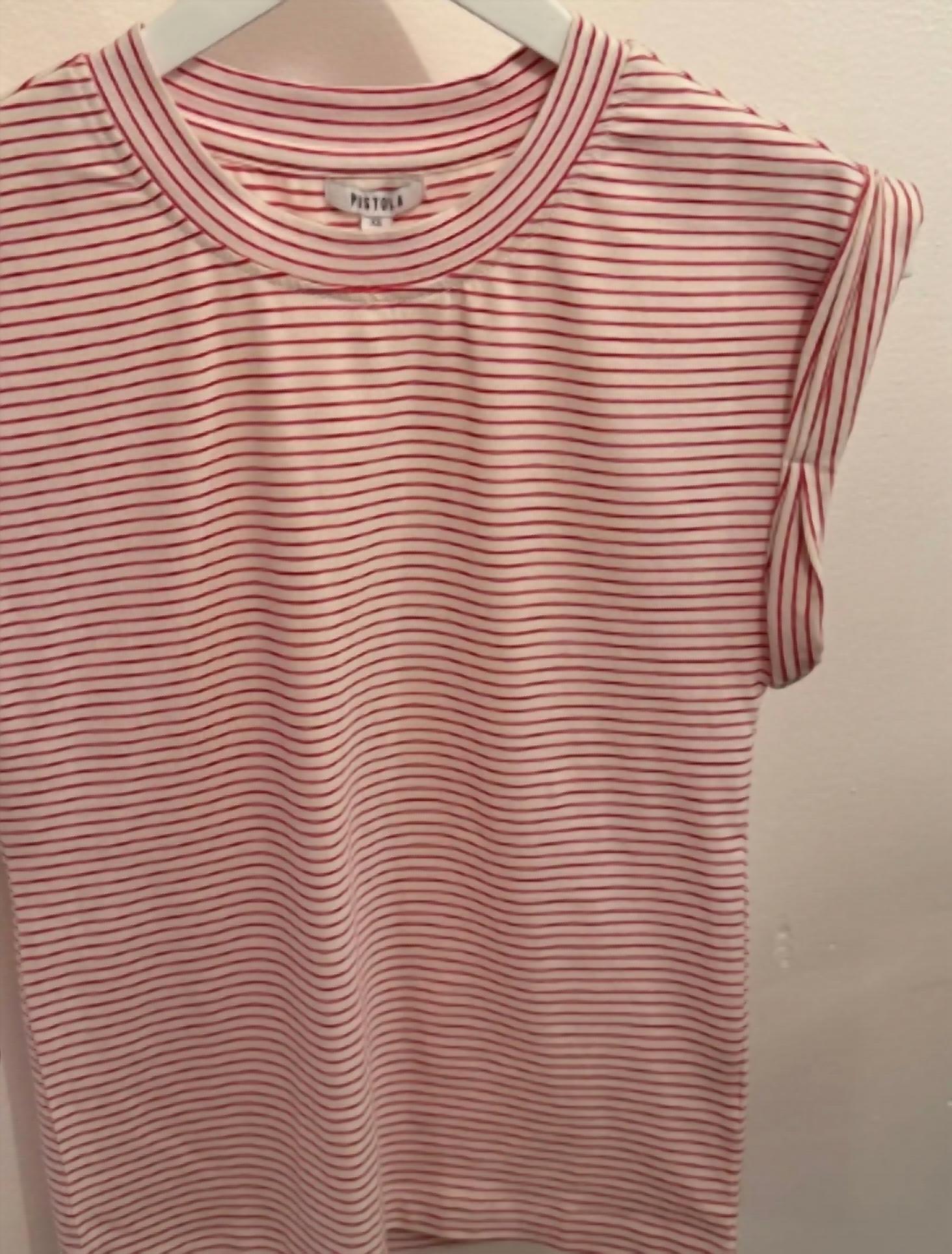 The short sleeve tee you'll want in every color. Discover the Olivia Rolled Sleeve Tee by Pistola, a stylish piece in a striking red stripe pattern that combines laid-back comfort with a touch of polish. This tee features short rolled cap sleeves and a classic crew neckline, offering a relaxed yet sophisticated look. Perfect for summer vacations, it provides an effortless style that pairs seamlessly with high-rise denim or layers under a blazer. Add this to your wardrobe for its versatility and chic appeal.