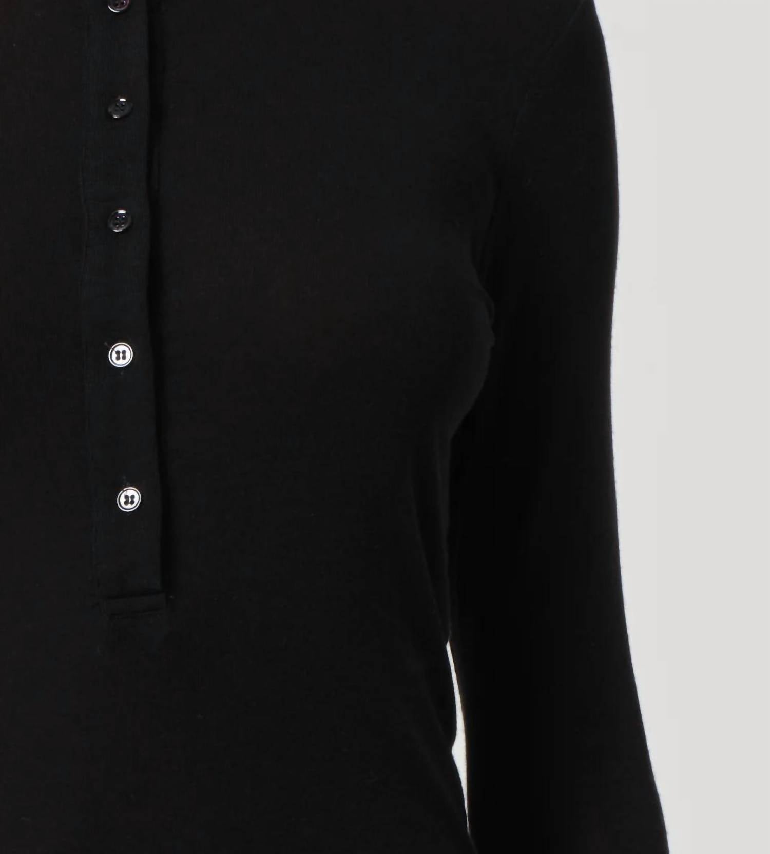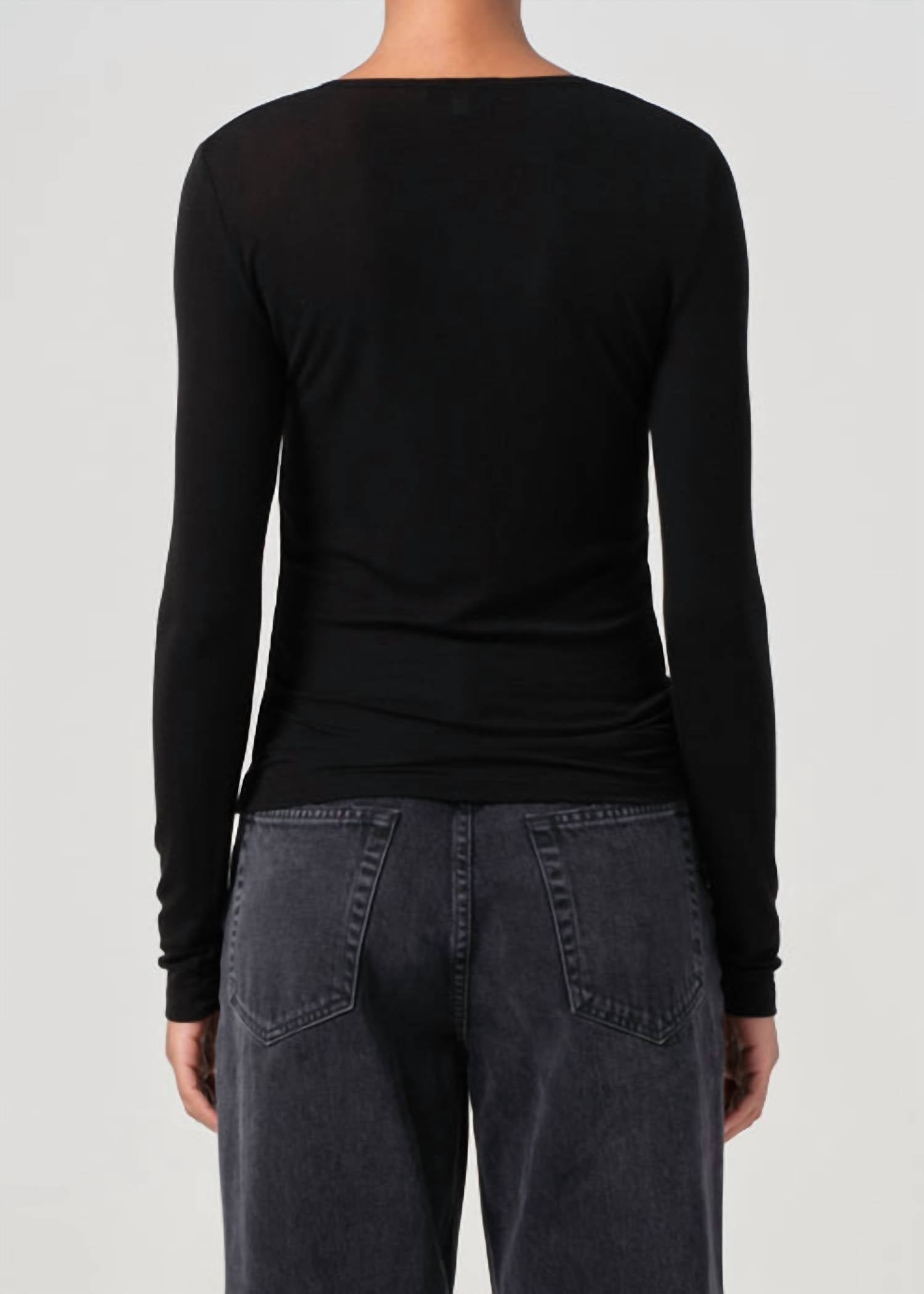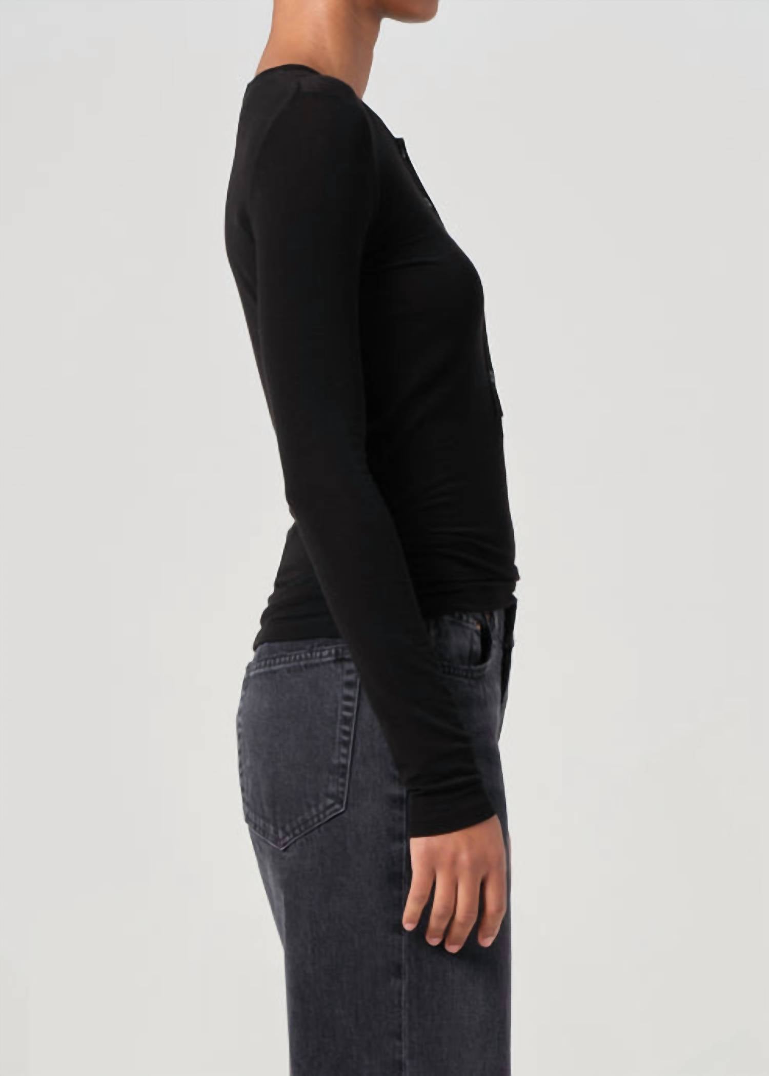 The perfect long sleeve tee that goes with just about anything. Meet the Faustine Henley by AGOLDE, the ultimate everyday staple in stark black. This long-sleeve top is crafted from an ultra-fine rib, offering a close-to-body silhouette that feels like a lightweight second skin, thanks to its 80% polyamide and 20% elastane blend. Designed with a flattering scoop neckline and button closure, this henley has a body length of 25 1/4", shoulder-to-shoulder width of 13 1/2", and a total chest measurement of 27 1/2". Made in the USA with imported materials, it is easy to care for with machine wash instructions. The model is 5'10" and wears a size small.