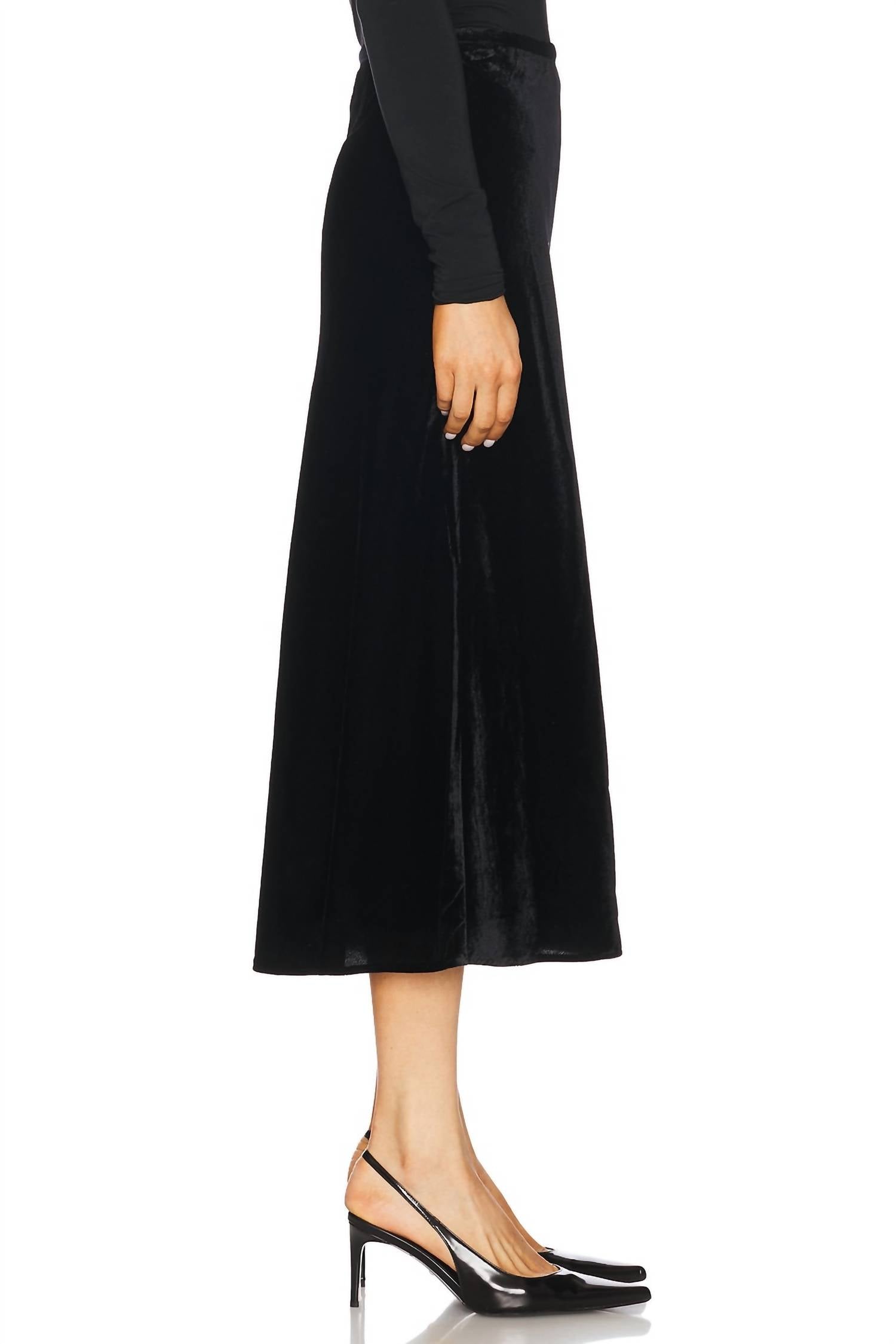 Tuck your favorite tee into this midi length skirt for an effortlessly cool look. The Cicely Midi Skirt by Paige embodies sophistication with its solid black hue and luxurious medium weight velvet fabric. Crafted from a viscose blend, with 74% viscose and 26% nylon, this fully lined skirt is finished with a 100% polyester lining for comfort. Made in China, it features an invisible zipper closure for a seamless look, measuring approximately 33.8 inches in length. For optimal care, dry cleaning is recommended.